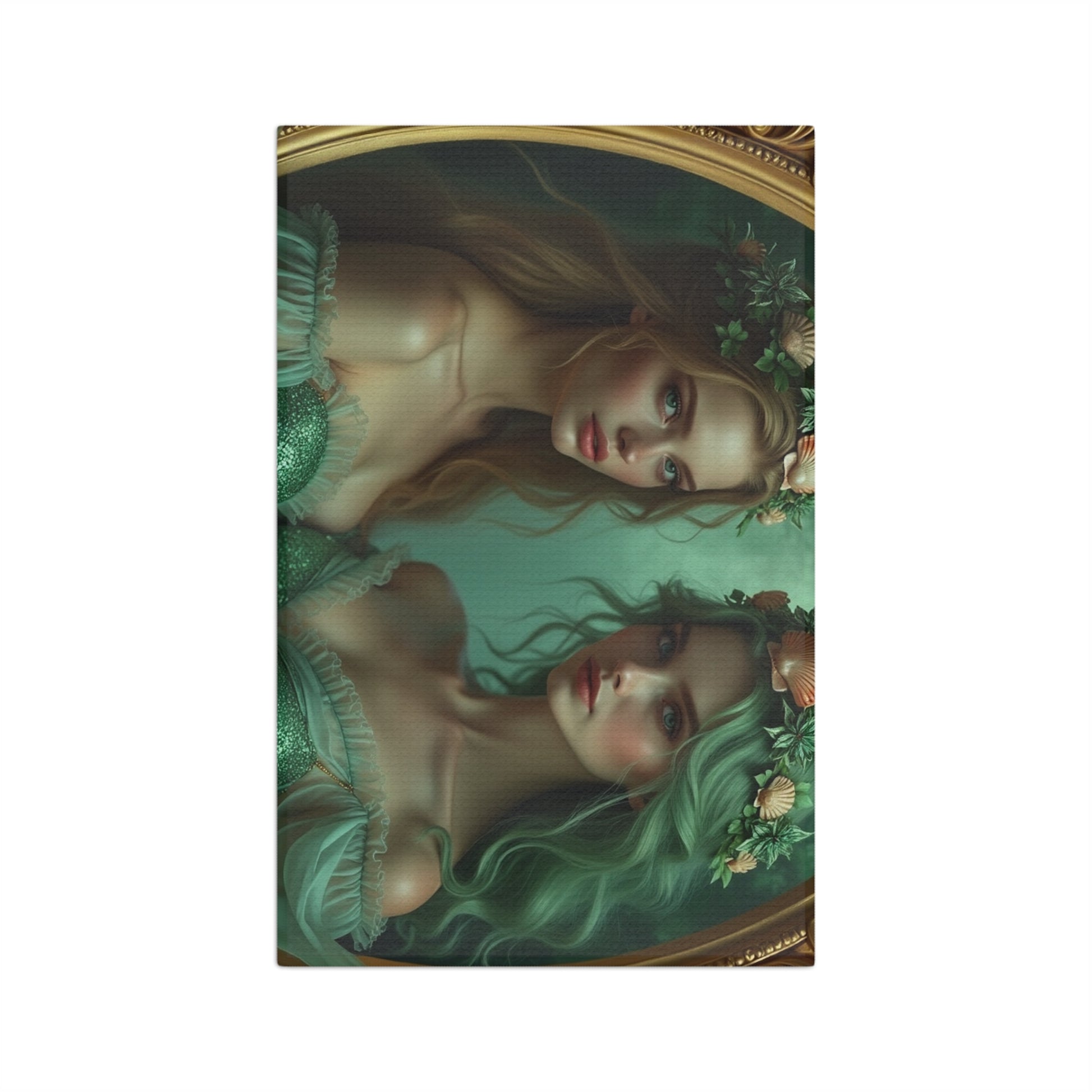 Soft, absorbent, and artistically enchanting — this microfiber tea towel brings a dreamy portrait straight into your kitchen. Two ethereal mermaid princesses, framed in a vintage oval and bathed in soft green tones, create a quietly romantic focal point. The towel’s fine, split fibers wick moisture and dry fast, while hemmed edges keep the artwork crisp through many uses. Draped over a handle, folded on a counter, or used to polish glassware, it adds a gentle, imaginative touch to morning routines and cozy gatherings. The design speaks to lovers of romantic fantasy, cottagecore aesthetics, and antique-inspired portraits without shouting — it simply settles into the room and feels like it has always belonged there.