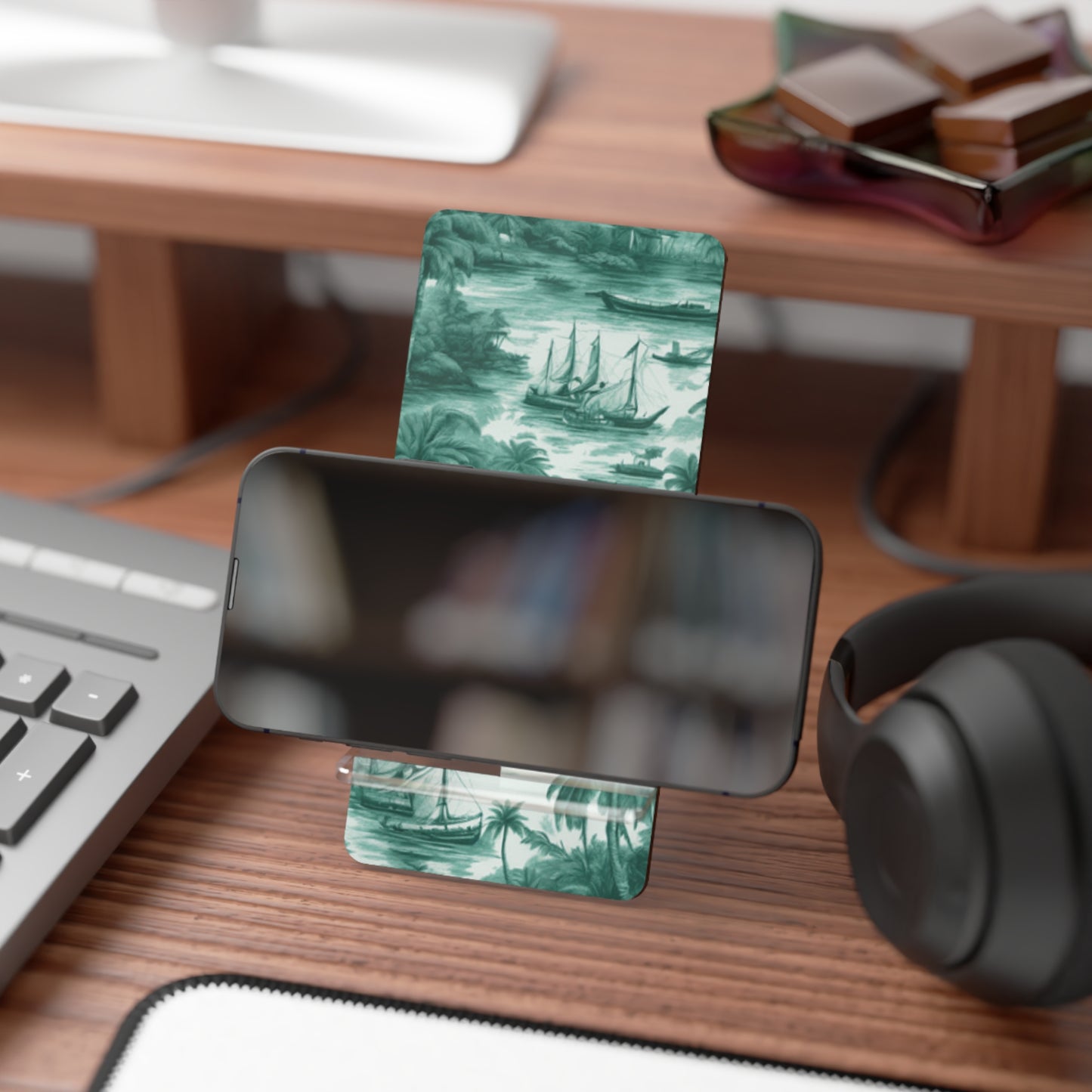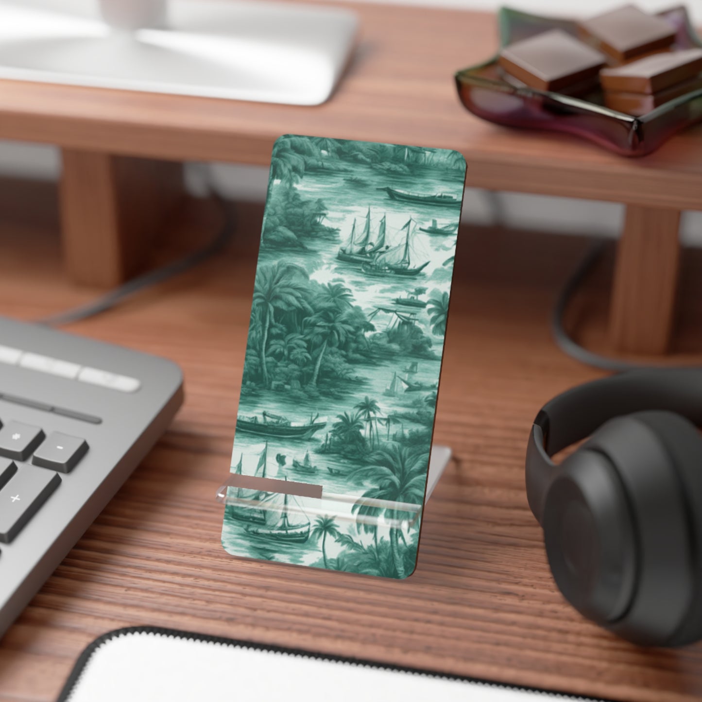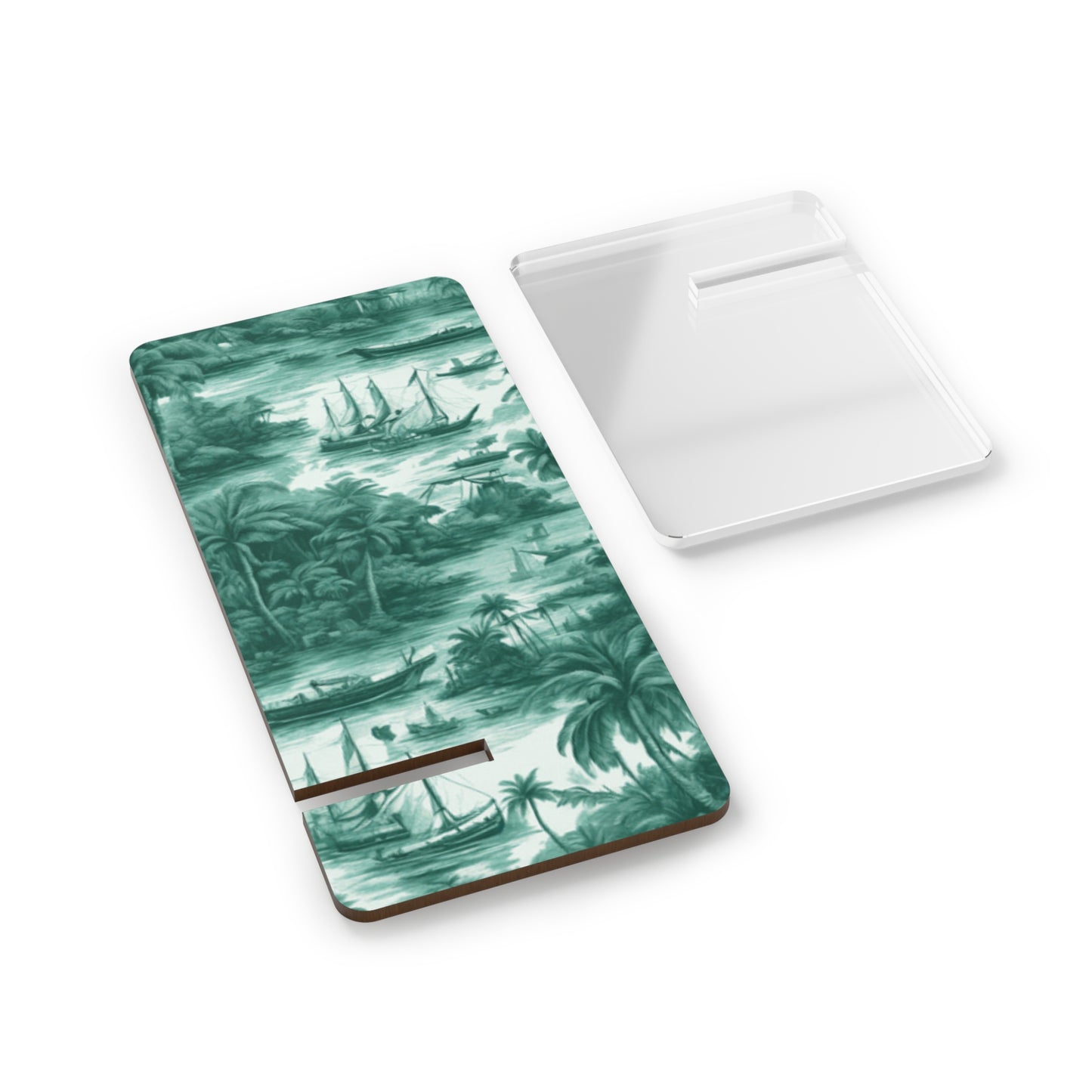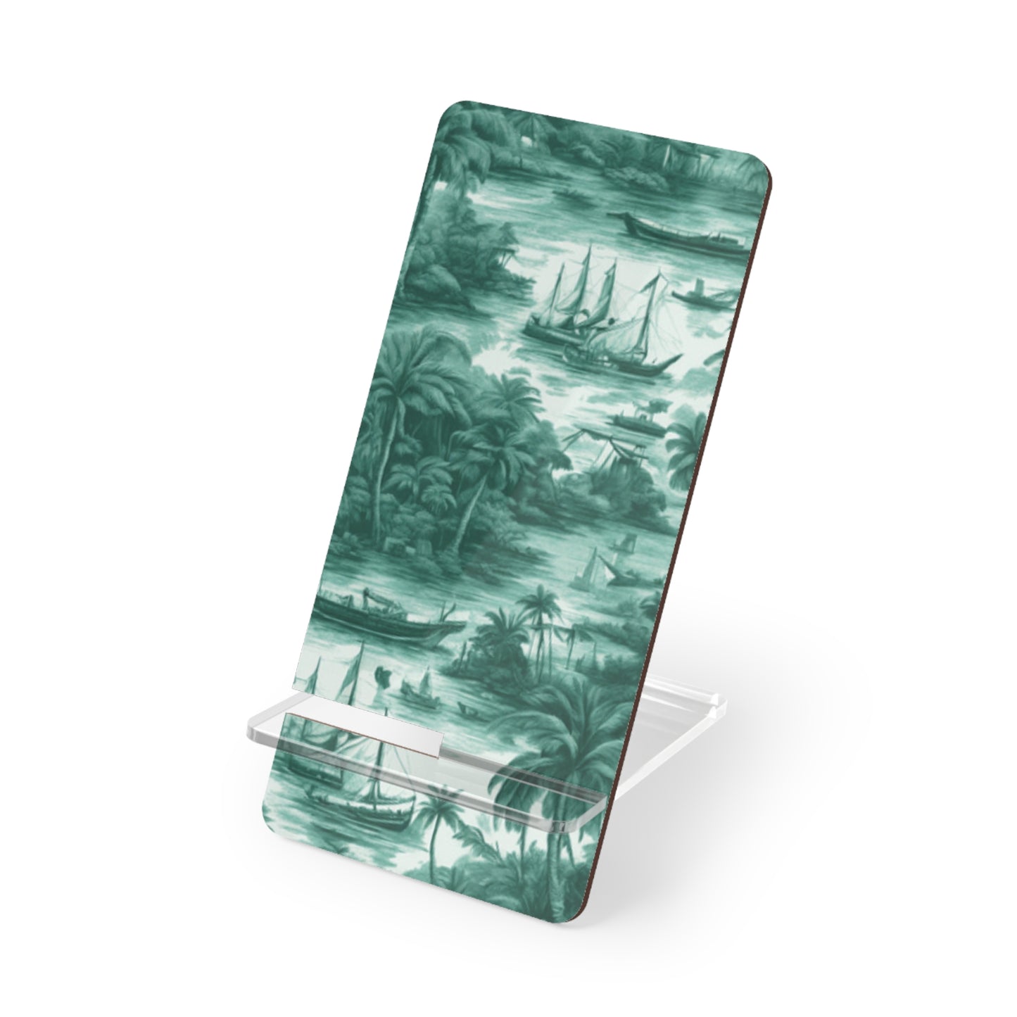 Create the perfect gift that can double as functional desk decor or a traveling companion for mobile browsing. Made with a sturdy hardboard panel and a plastic leg, this stand ensures zero wobble while you enjoy your favorite content online. Slot the two pieces together for a swift setup and undo them just as quick when on the move. Features our original Tropical Toile #1 timeless design, in evergreen. Look at the tiny palms trees and other tropical plants, boats and islands typical of a classic toile pattern. Functional art!