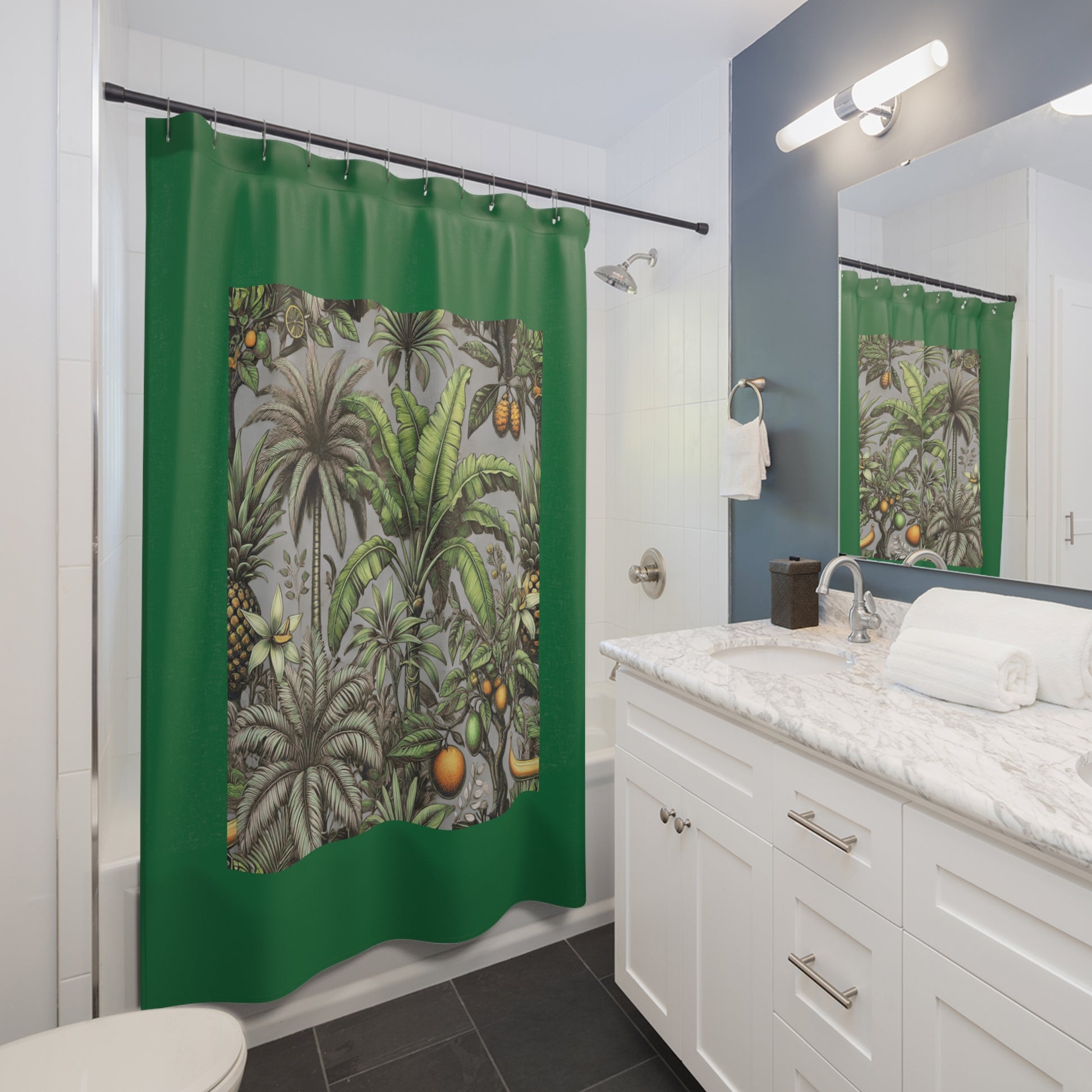 Palm Tree Shower Curtain - Ocean Bathroom Decor / Tropical Fruit/Grey, Dark Green