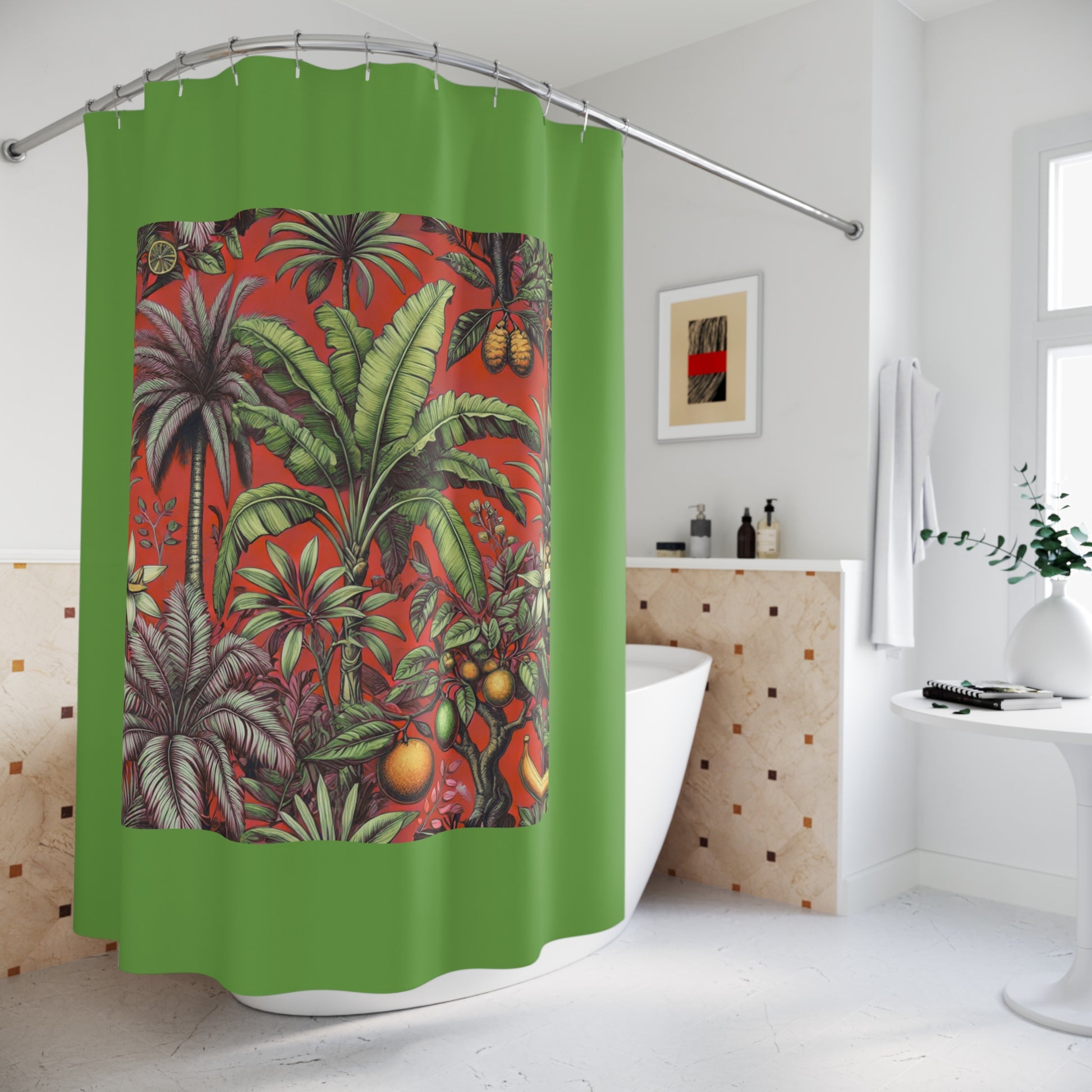 Transform your bathroom into a serene oasis with this vibrant shower curtain with a gorgeous design of palm trees and fruit. Made from 100% durable polyester, this unique design features a captivating blend of colors and patterns that will invigorate your space. Imagine stepping into a warm, relaxing shower surrounded by stylish artistry that reflects your personality. Perfect for adults looking to elevate their home decor, this shower curtain brings a touch of creativity and fun to everyday routines. It's ideal for housewarming gifts, celebrations, or simply as a cheerful addition to your own bathroom. Celebrate life’s moments, from seasonal gatherings to personal milestones, with this eye-catching piece.