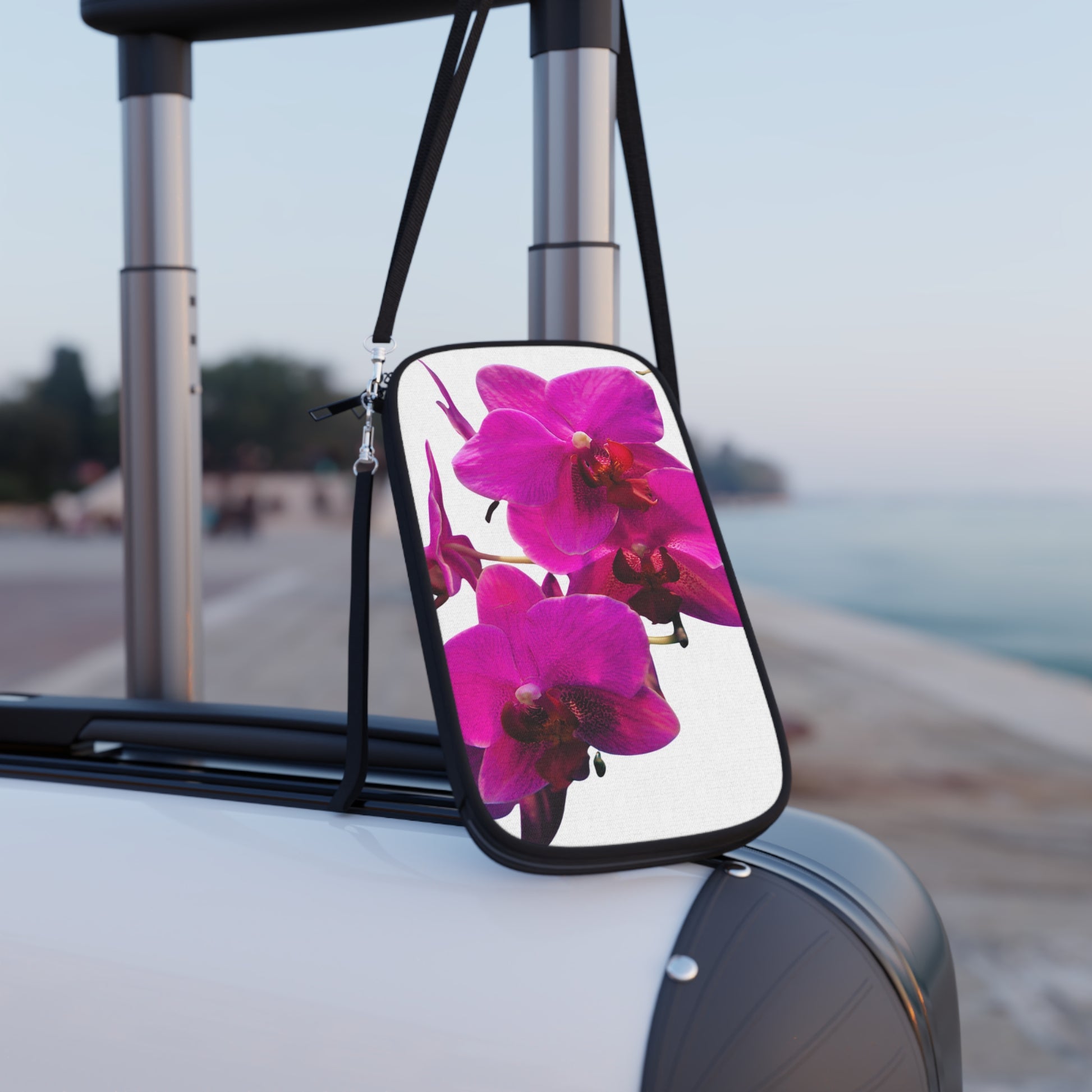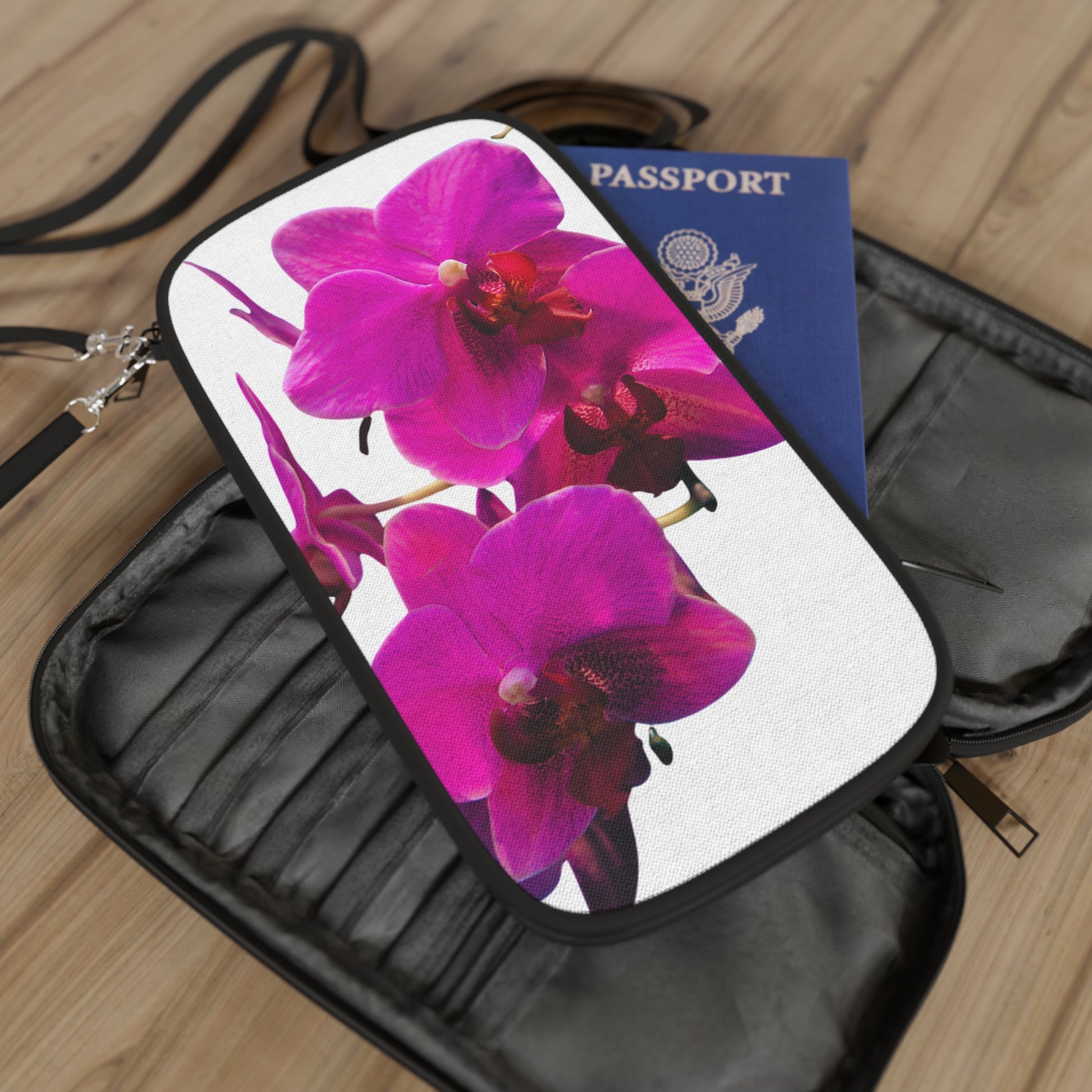 One wallet to rule them all. Lightweight and handy, this passport wallet features multiple internal compartments on both sides, and a durable, high-quality zipper for ultimate protection. It also has an additional back pocket for easy access to cards, notes and coins. Features our exclusive design made with real flower photo giving off major tropical vibes: Three Purple Orchids, white