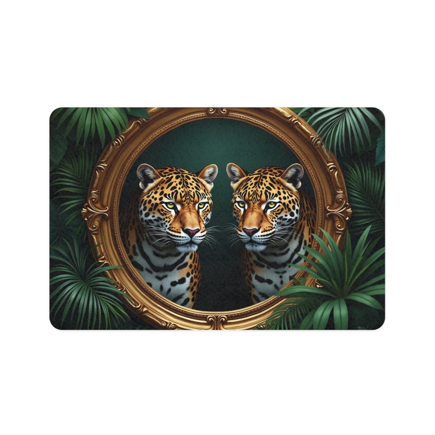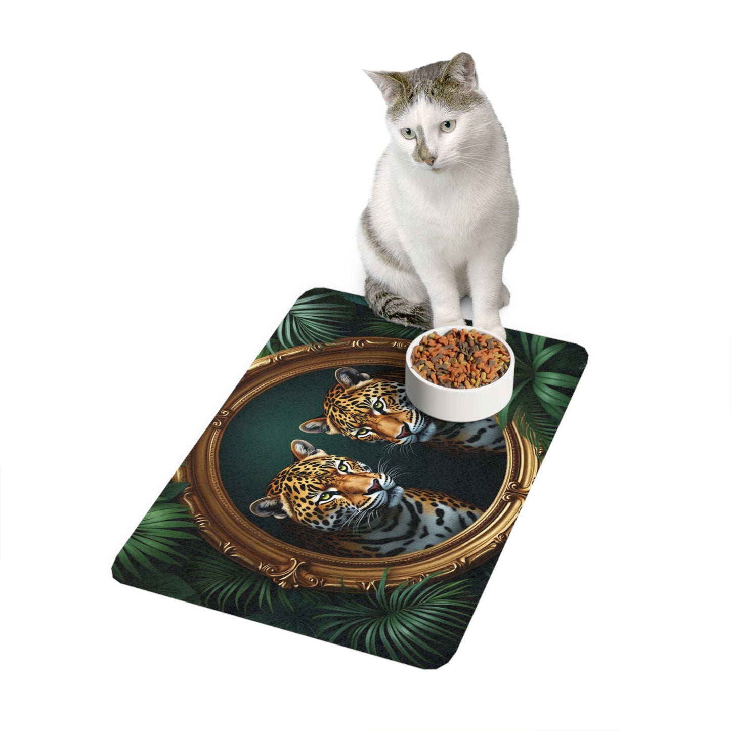 Enjoy the wild jaguar from the rainforest! Created for minimizing mess, this personalized pet food mat is as practical as it is stylish. Made with a non-slip rubber base, this pet feeding mat stays put even when the clumsiest puppers are having their meal. Each mat comes in a rectangle shape, is thick, and is perfect for both dogs and cats.