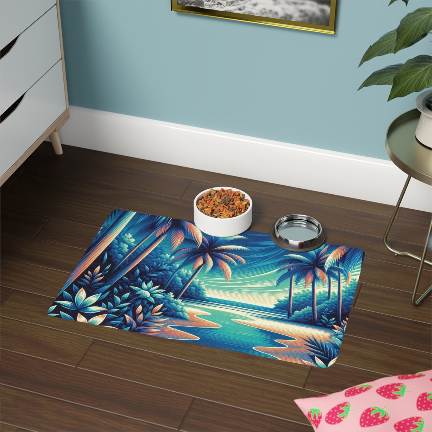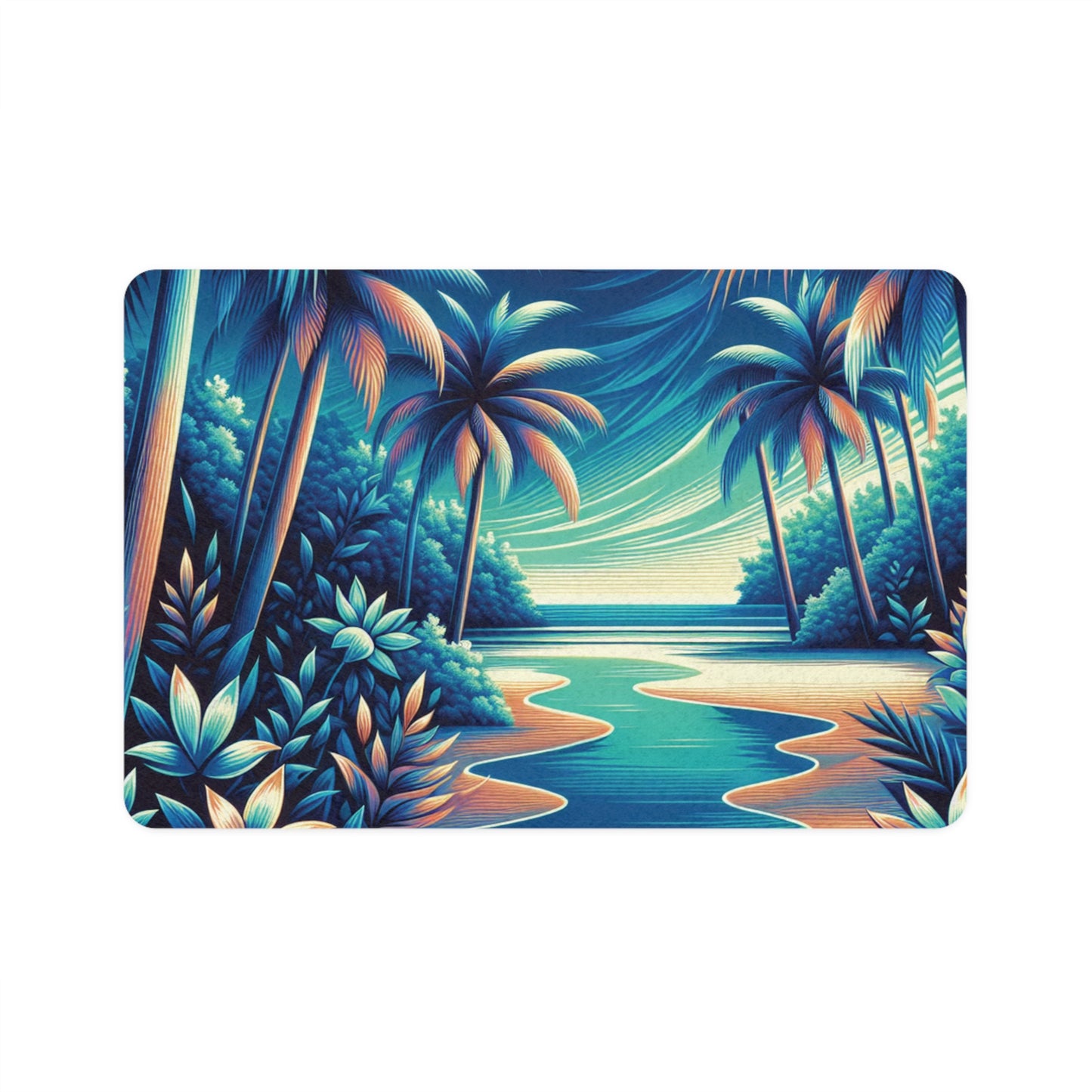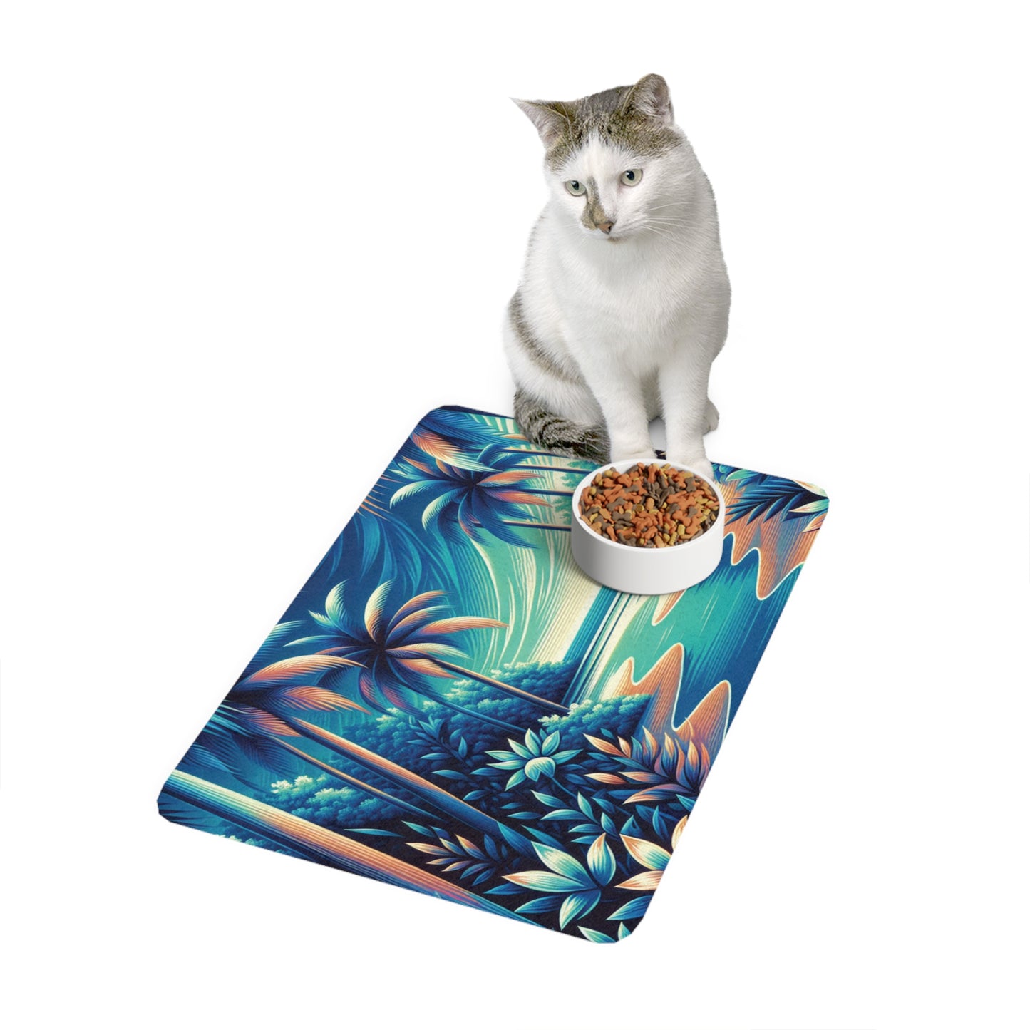 Enjoy neon blue palm trees and scenery taking you to a virtual vacay! Created for minimizing mess, this personalized pet food mat is as practical as it is stylish. Made with a non-slip rubber base, this pet feeding mat stays put even when the clumsiest puppers are having their meal. Each mat comes in a rectangle shape, is thick, and is perfect for both dogs and cats.