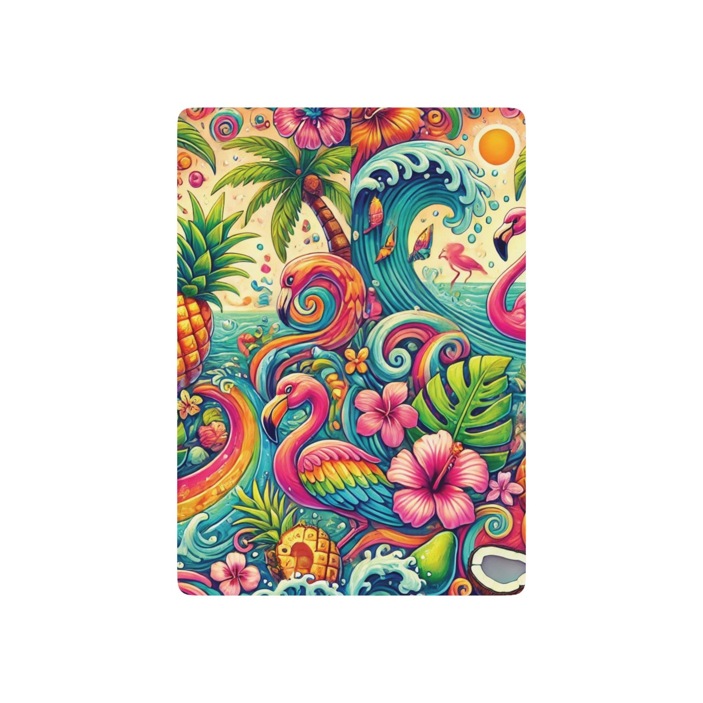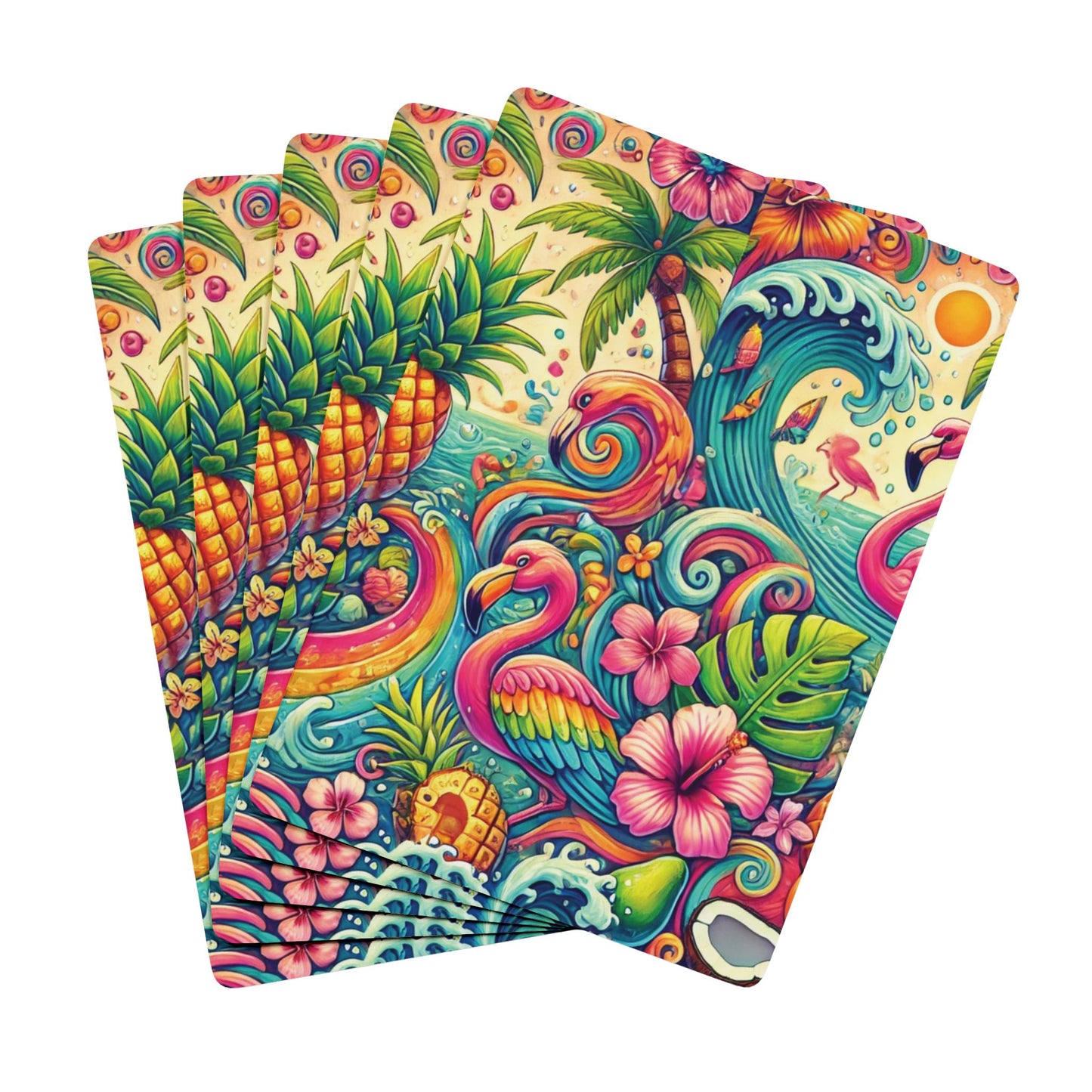 Elevate your game night with our fun tropical flamingo design in colorful images of ocean waves, flamingos, palm trees, flowers and other beach motifs. Each card boasts art that pops, making every hand exciting and visually engaging. Crafted from smooth, premium-coated cardstock, these cards slide effortlessly across the table, ensuring perfect shuffling and dealing every time. Ideal for poker enthusiasts and casual gamers alike, this deck brings friends and family together for some friendly competition. Perfect for birthdays, game nights, or holiday gatherings, these cards create a lively and fun atmosphere. They also make a great gift for any poker lover! Enjoy a night filled with strategy and camaraderie with this beautifully designed deck.