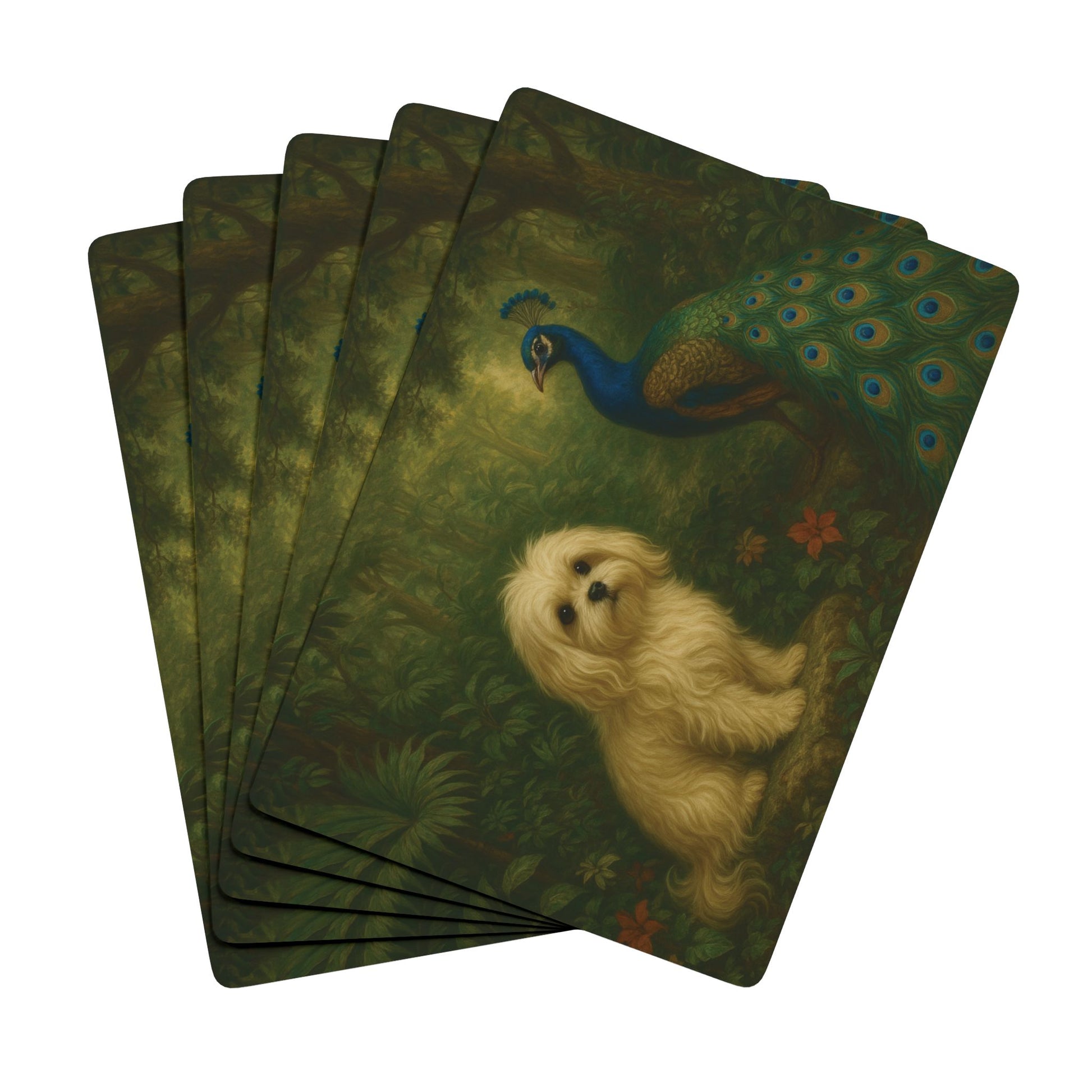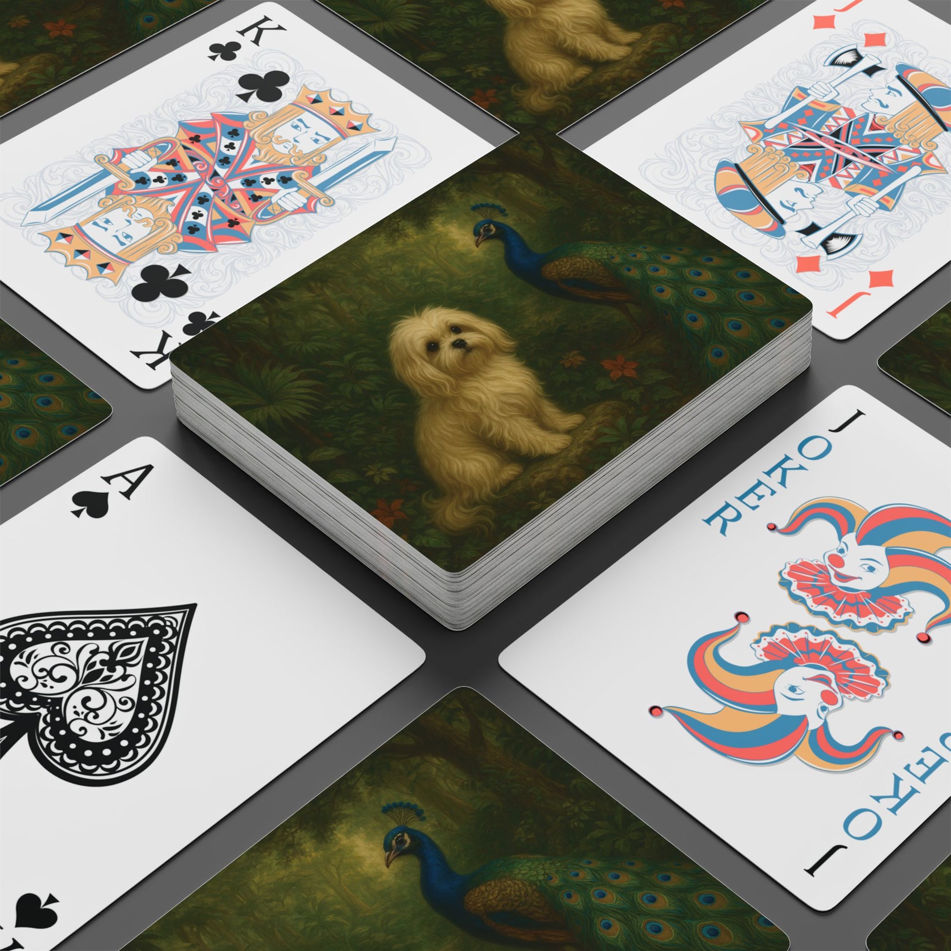 Elevate your game night with our design of puppy Ariel and a peacock in a rainforest taking you on a virtual tropical vacation. Crafted from smooth, premium-coated cardstock, these cards slide effortlessly across the table, ensuring perfect shuffling and dealing every time. Ideal for poker enthusiasts and casual gamers alike, this deck brings friends and family together for some friendly competition. Perfect for birthdays, game nights, or holiday gatherings, these cards create a lively and fun atmosphere. They also make a great gift for any poker lover! Enjoy a night filled with strategy and camaraderie with this beautifully designed deck.