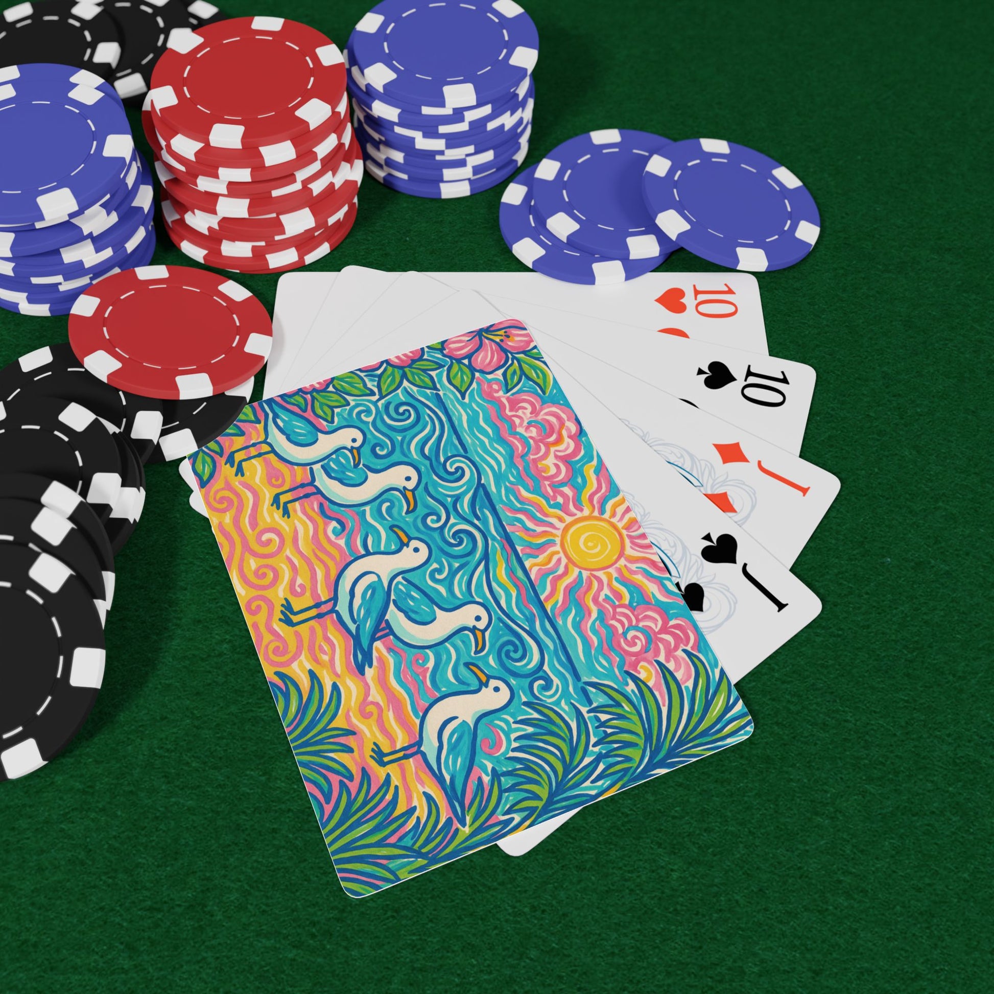Elevate your game night with our design of tropical beach seagulls taking you on a virtual tropical vacation. Crafted from smooth, premium-coated cardstock, these cards slide effortlessly across the table, ensuring perfect shuffling and dealing every time. Ideal for poker enthusiasts and casual gamers alike, this deck brings friends and family together for some friendly competition. Perfect for birthdays, game nights, or holiday gatherings, these cards create a lively and fun atmosphere. They also make a great gift for any poker lover! Enjoy a night filled with strategy and camaraderie with this beautifully designed deck.