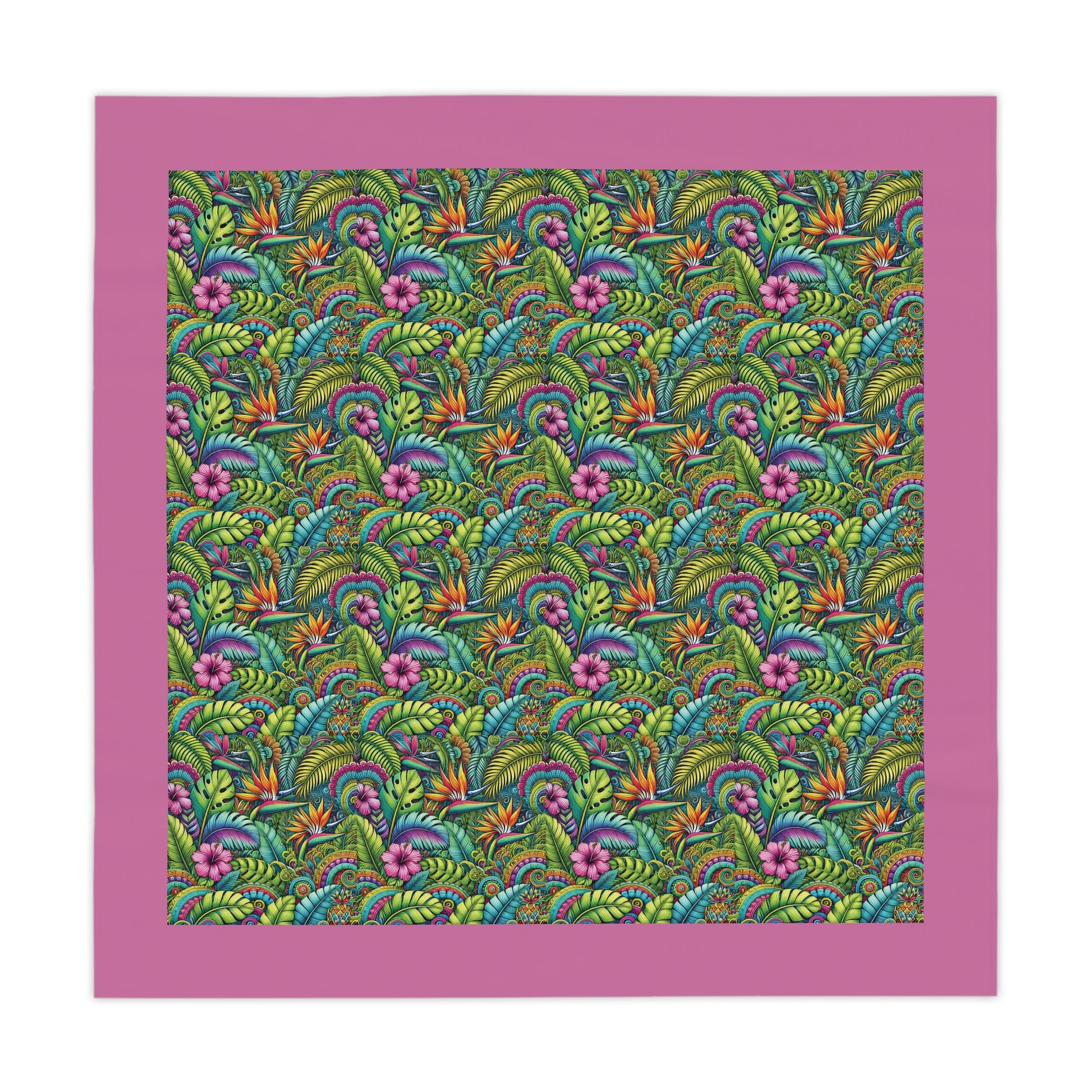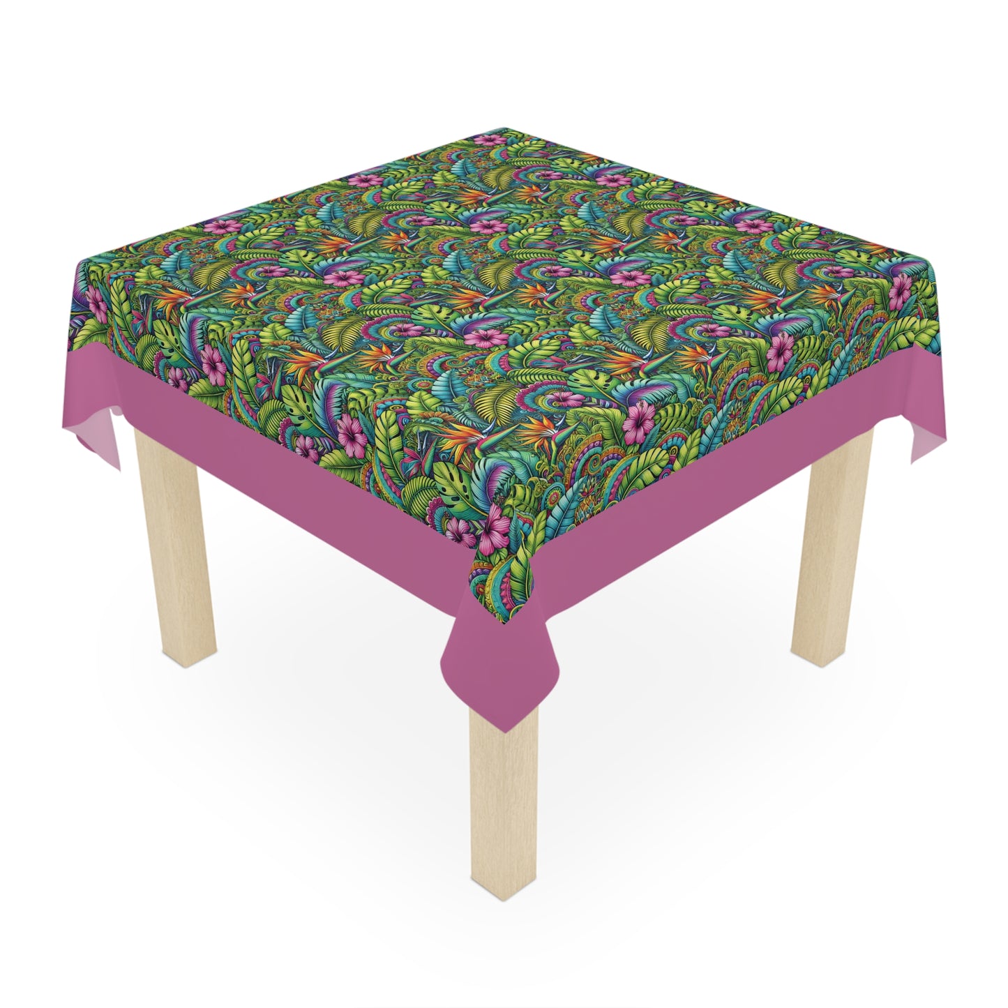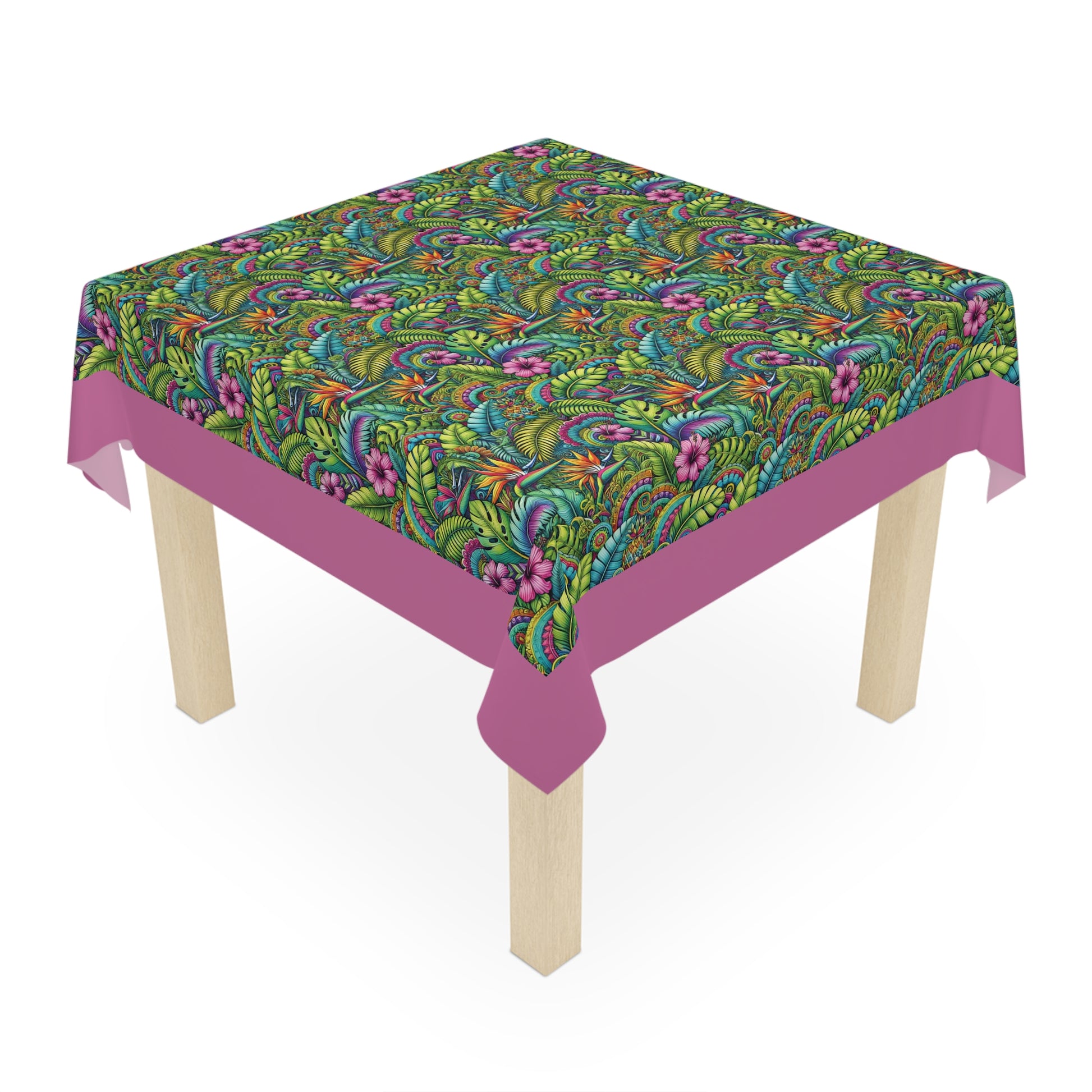 Add lovely tropical flowers to your dining experience with this beautiful tablecloth. Crafted from 100% polyester, this one-size 55.1" x 55.1" square table decor it's not only durable but also retains its shape while drying quickly. The full-print design brings to life a stunning array of colors, making it the perfect centerpiece for any meal or gathering. Lightweight and soft to the touch, this tablecloth creates an inviting atmosphere, ideal for both casual family dinners and festive occasions. Perfect for those who love to host, entertain, or simply enjoy a beautifully adorned table. This tablecloth is ideal for holidays, celebrations, or cozy dinners at home, enriching every event with its lively charm. Suitable for enthusiasts of home decor, gardening, and nature-inspired designs, it adds a splash of style to any setting.