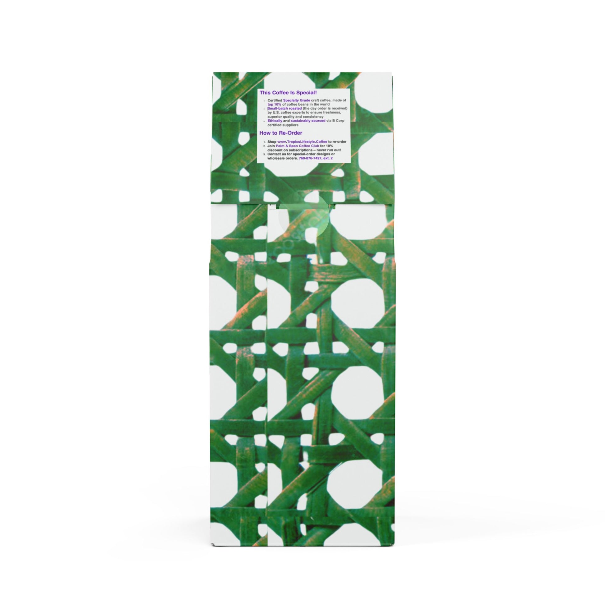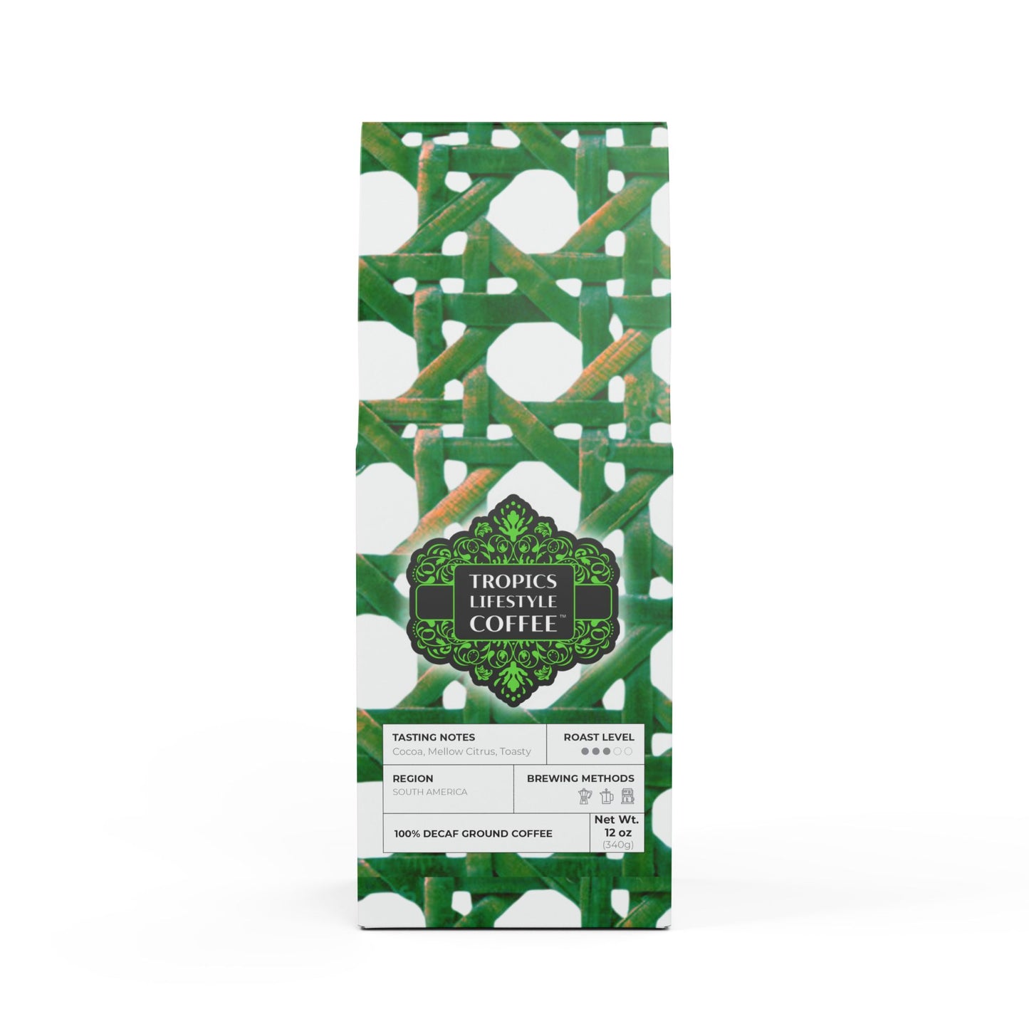 Get all the flavor without the buzz thanks to the Rainforest Mist™ Single Origin DECAF. This 12oz pack boasts a mellow, smooth, and savory flavor profile, featuring subtle tasting notes of peanut and milk chocolate, with a mellow acidity that'll leave you craving another cup. Sourced from the sunny slopes of South America and decaffeinated using the Swiss Water process. Brew it up in your drip coffee maker, French press, or percolator. Available in whole bean and ground options to match your equipment. Roasted in the USA and certified as "Specialty Grade Craft Coffee." Limited-edition box art features our chair wicker tropical pattern. Don't run out! Join our monthly Subscription coffee plan.