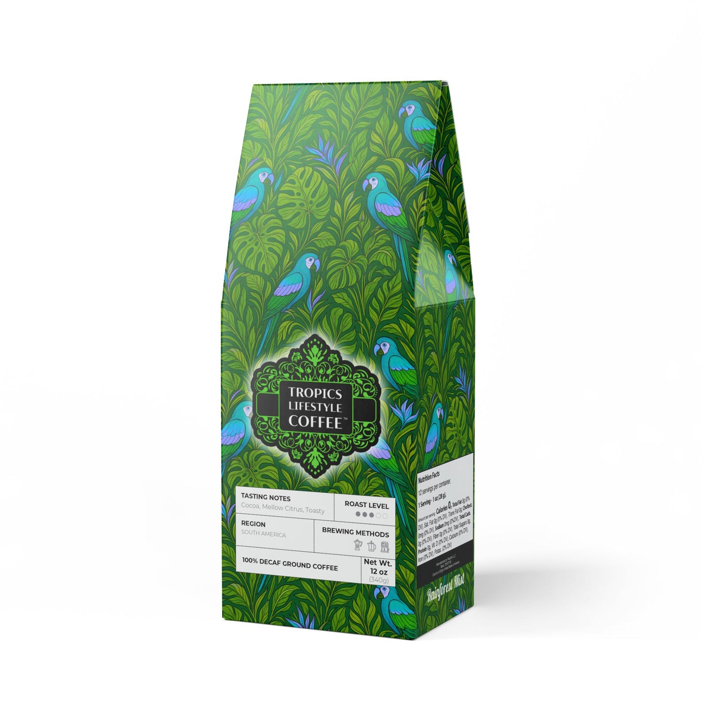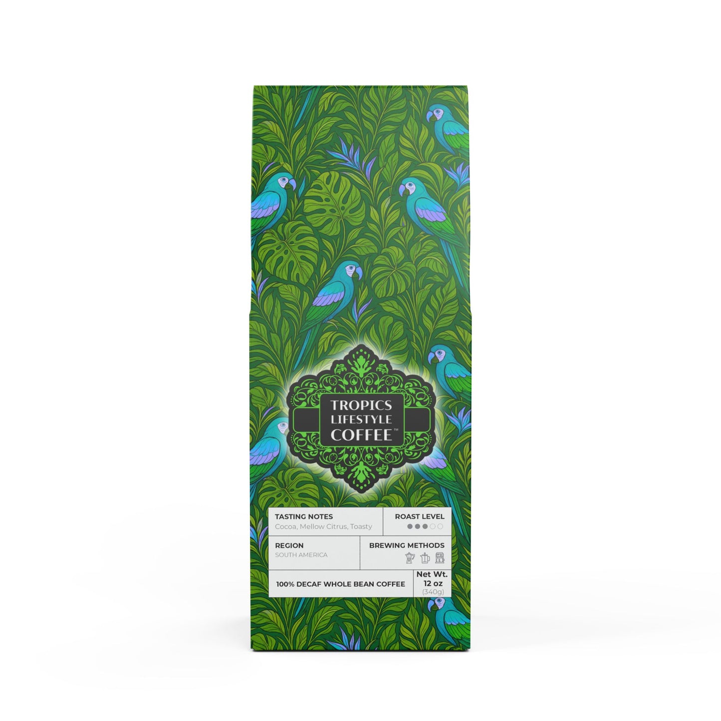 Get all the flavor without the buzz thanks to the Rainforest Mist™ Single Origin DECAF. This 12oz pack boasts a mellow, smooth, and savory flavor profile, featuring subtle tasting notes of peanut and milk chocolate, with a mellow acidity that'll leave you craving another cup. Sourced from the sunny slopes of South America and decaffeinated using the Swiss Water process. Brew it up in your drip coffee maker, French press, or percolator. Available in whole bean and ground options to match your equipment. Roasted in the USA and certified as "Specialty Grade Craft Coffee." Limited-edition bag art features our original parrot family design, evoking feelings of a dreamy tropical rainforest destination with plenty of lush greenery and lovely parrots! Don't run out! Join our monthly Subscription coffee plan.