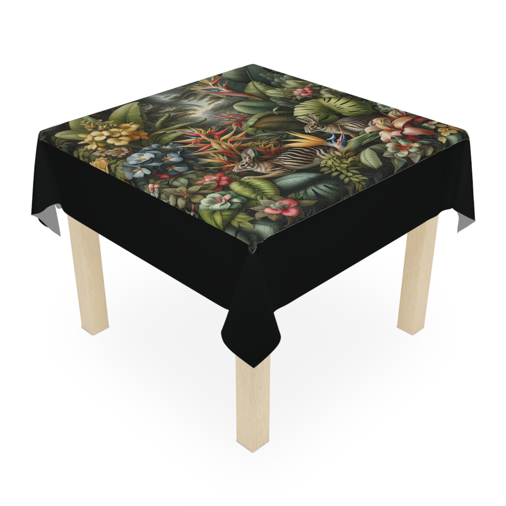 Add tropical vibes to your dining experience with this beautiful tablecloth. Crafted from 100% polyester, this one-size 55.1" x 55.1" square table decor it's not only durable but also retains its shape while drying quickly. The full-print design brings to life a tropical scene of Sumatran striped rabbits in a rainforest, making it the perfect centerpiece for any meal or gathering. Lightweight and soft to the touch, this tablecloth creates an inviting atmosphere, ideal for both casual family dinners and festive occasions. Perfect for those who love to host, entertain, or simply enjoy a beautifully adorned table. This tablecloth is ideal for holidays, celebrations, or cozy dinners at home, enriching every event with its lively charm. Suitable for enthusiasts of home decor, gardening, and nature-inspired designs, it adds a splash of style to any setting.