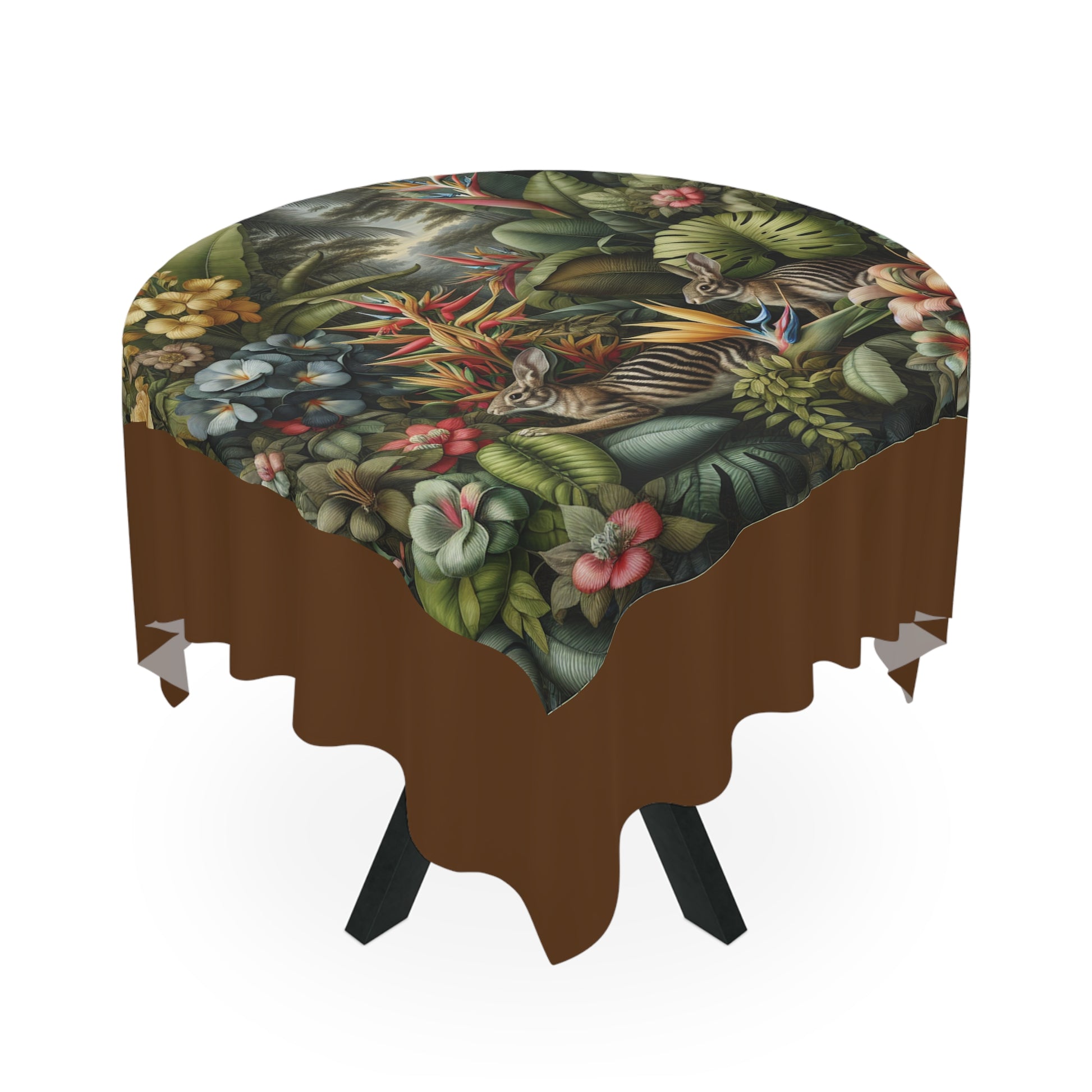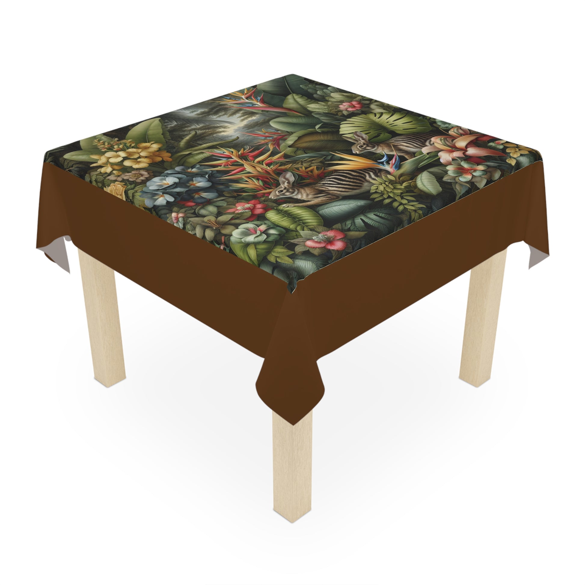 Add tropical vibes to your dining experience with this beautiful tablecloth. Crafted from 100% polyester, this one-size 55.1" x 55.1" square table decor it's not only durable but also retains its shape while drying quickly. The full-print design brings to life a tropical scene of Sumatran striped rabbits in a rainforest, making it the perfect centerpiece for any meal or gathering. Lightweight and soft to the touch, this tablecloth creates an inviting atmosphere, ideal for both casual family dinners and festive occasions. Perfect for those who love to host, entertain, or simply enjoy a beautifully adorned table. This tablecloth is ideal for holidays, celebrations, or cozy dinners at home, enriching every event with its lively charm. Suitable for enthusiasts of home decor, gardening, and nature-inspired designs, it adds a splash of style to any setting.
