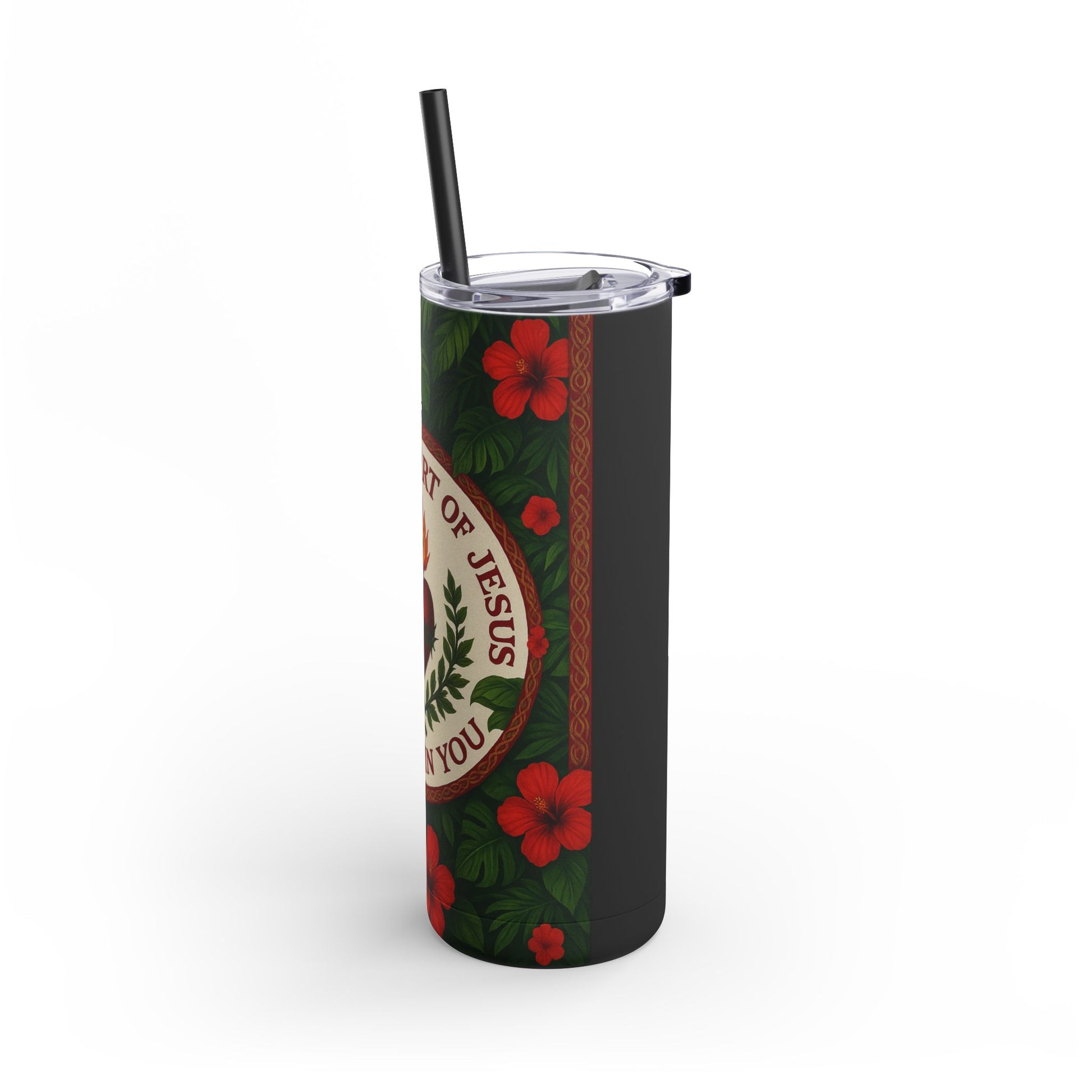 Introducing our vibrant religious Skinny Tumbler, a stylish and faith-filled companion for your drinks! Features our exclusive design of the Sacred Heart of Jesus prayer, showcasing tropical motifs to add joy to your sipping experience. Whether you’re at the beach, the gym, or simply enjoying a relaxed day at home, this tumbler keeps your beverages just right. With a trendy slim design and a powder-coated matte finish, it's perfect for those who appreciate both form and function.