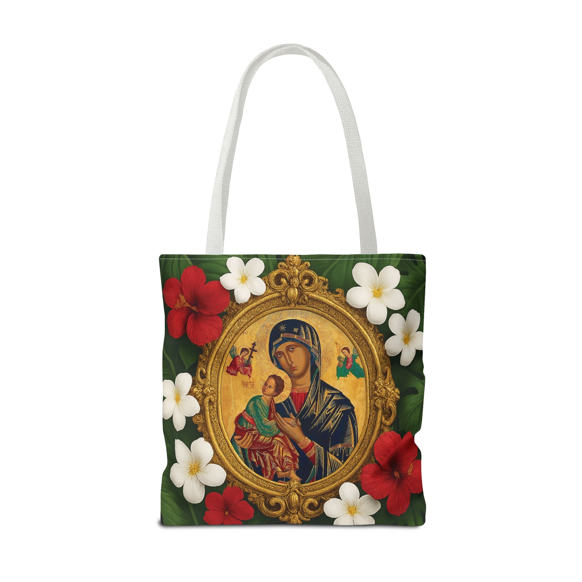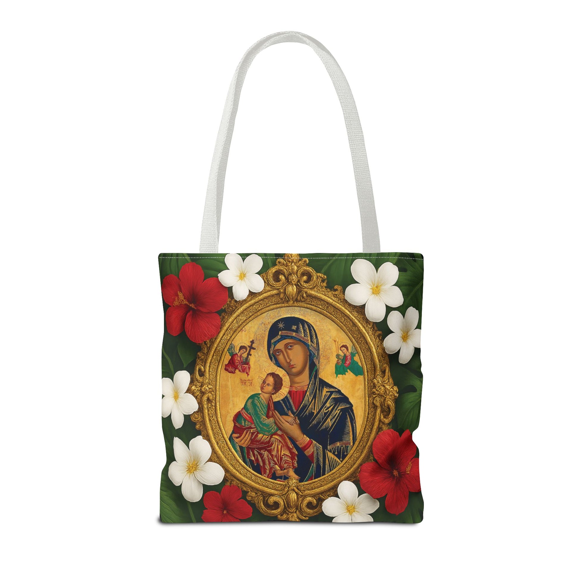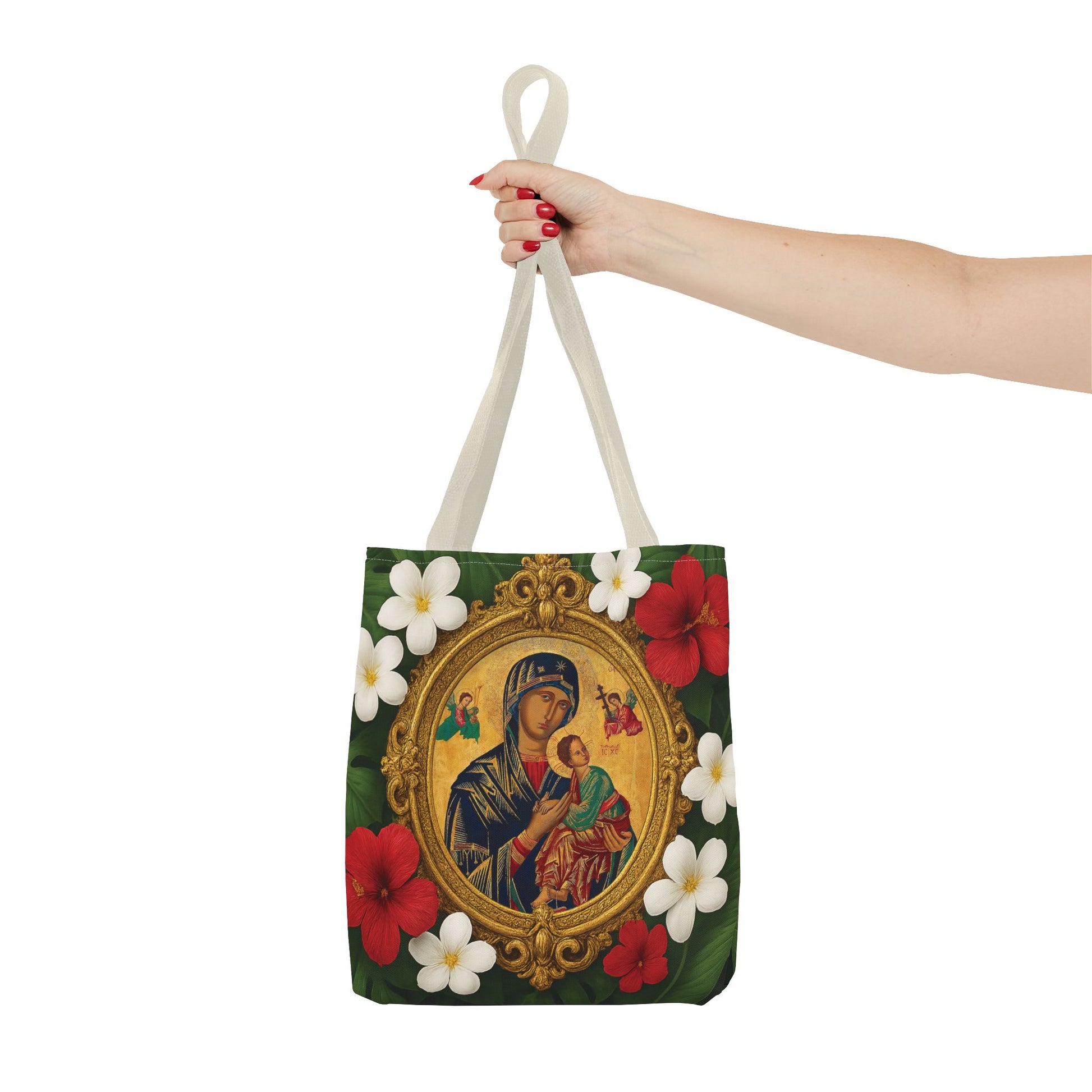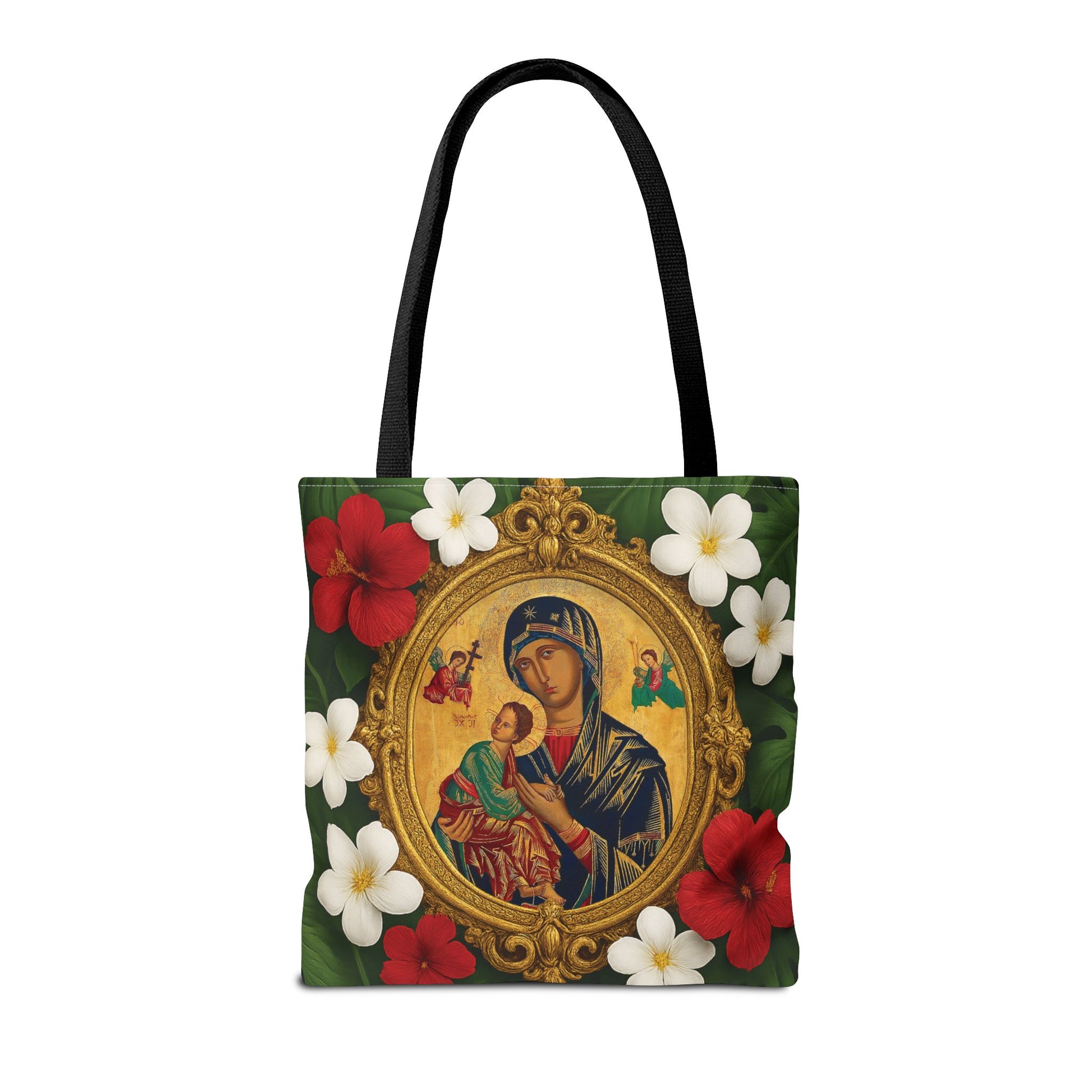 Religious Art Polyester Tote Bag, 3 Sizes / Our Lady of Perpetual Help, Red Flowers