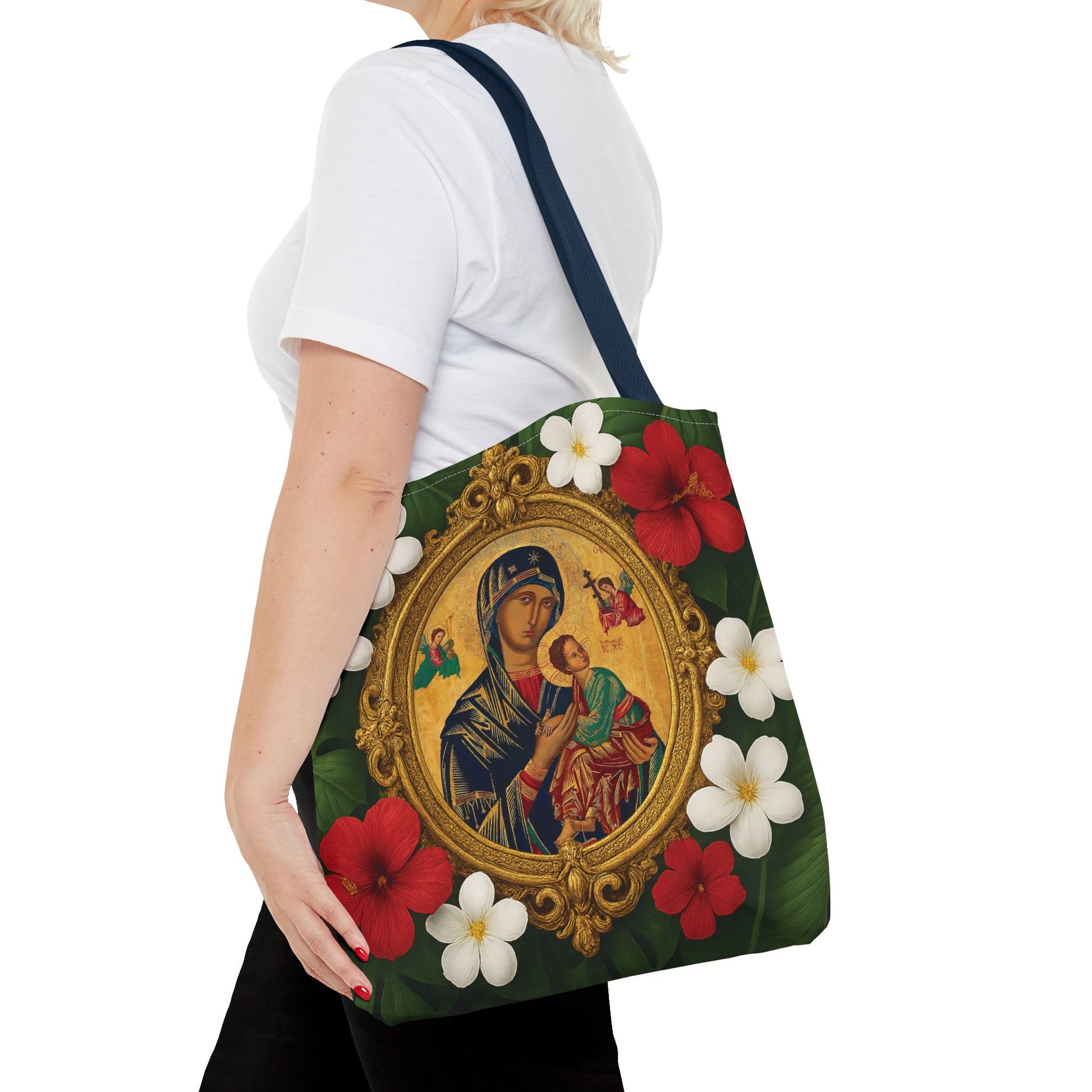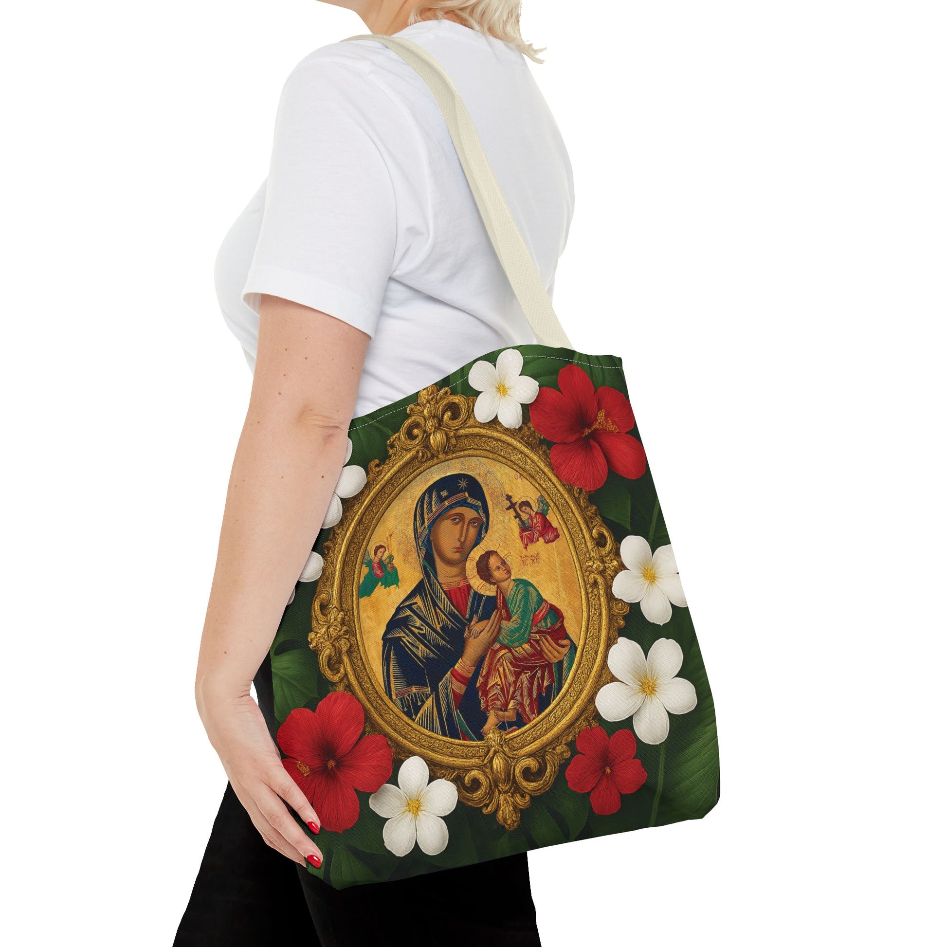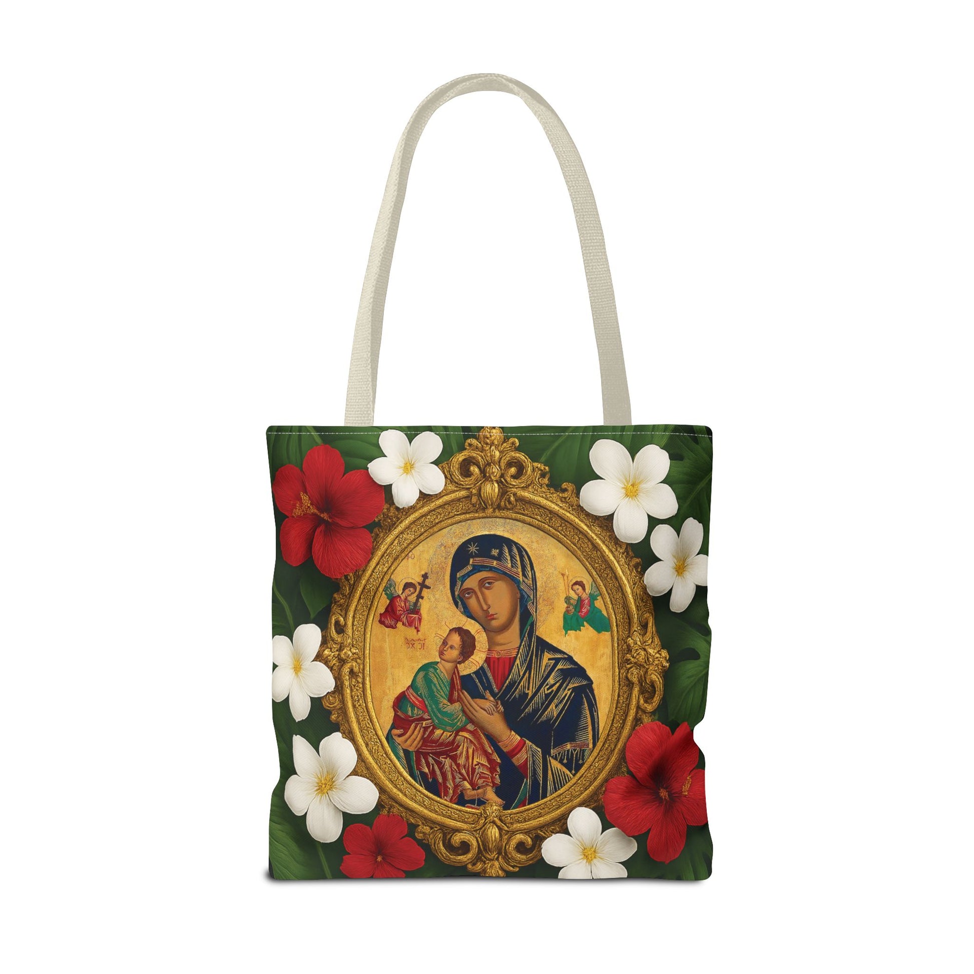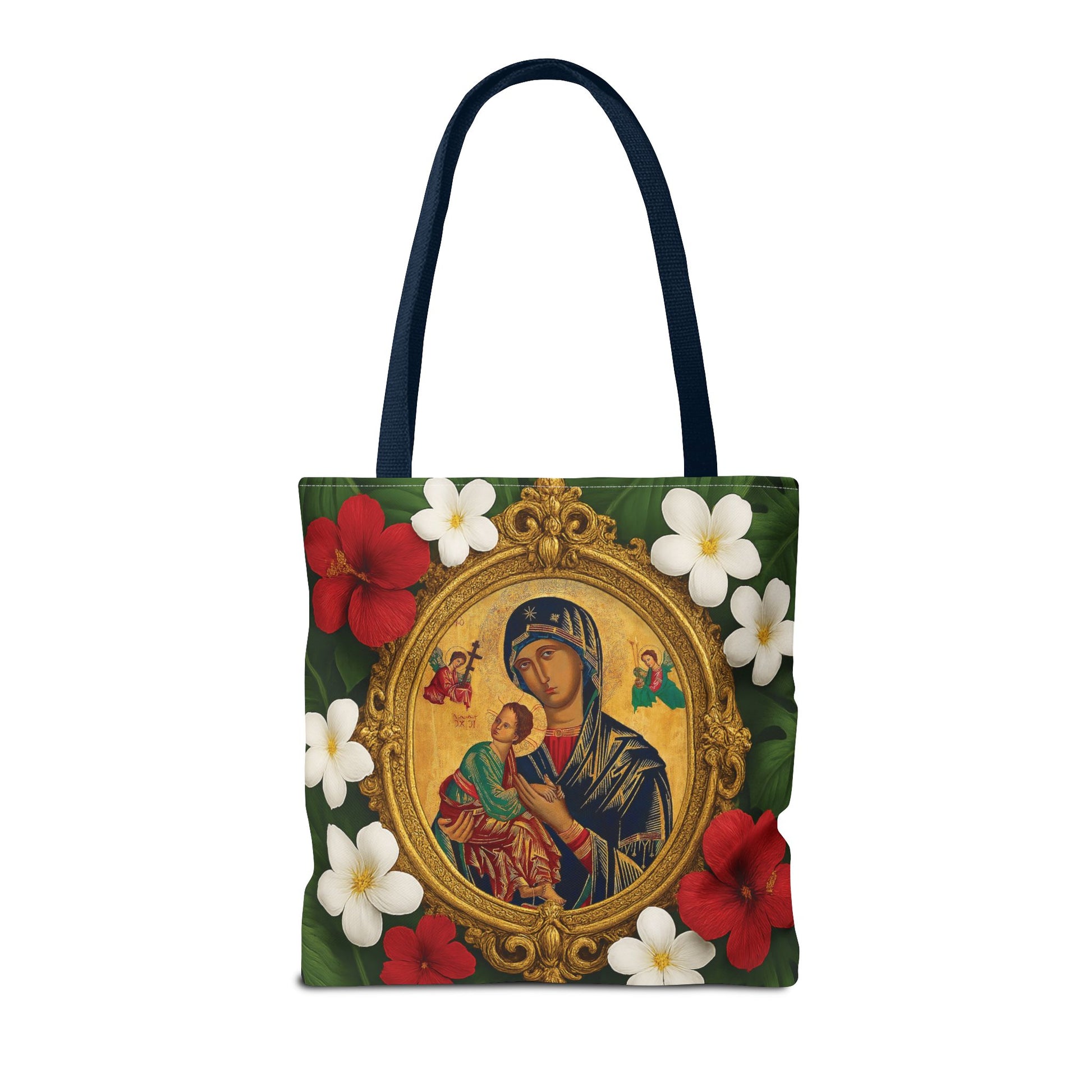 Religious Art Polyester Tote Bag, 3 Sizes / Our Lady of Perpetual Help, Red Flowers