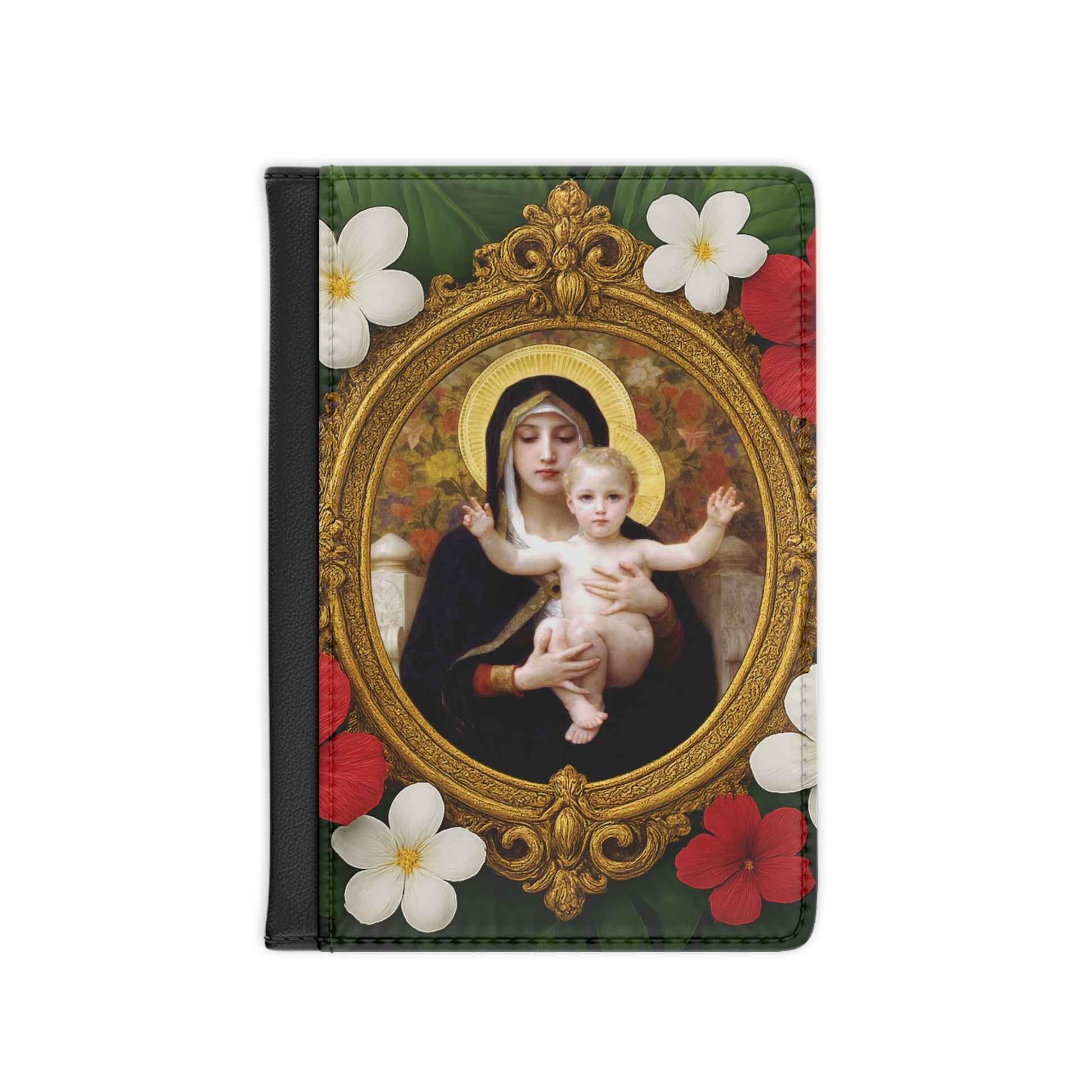 Religious Tropical Passport Cover, Faux Leather - RFID blocking for travel security / Virgin of the Lilies