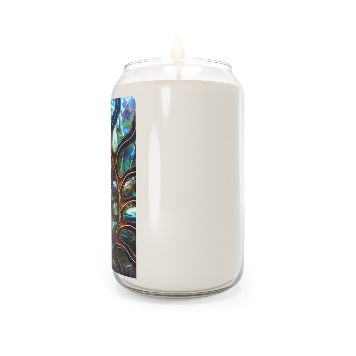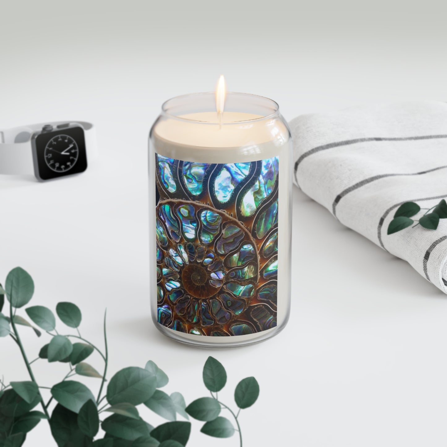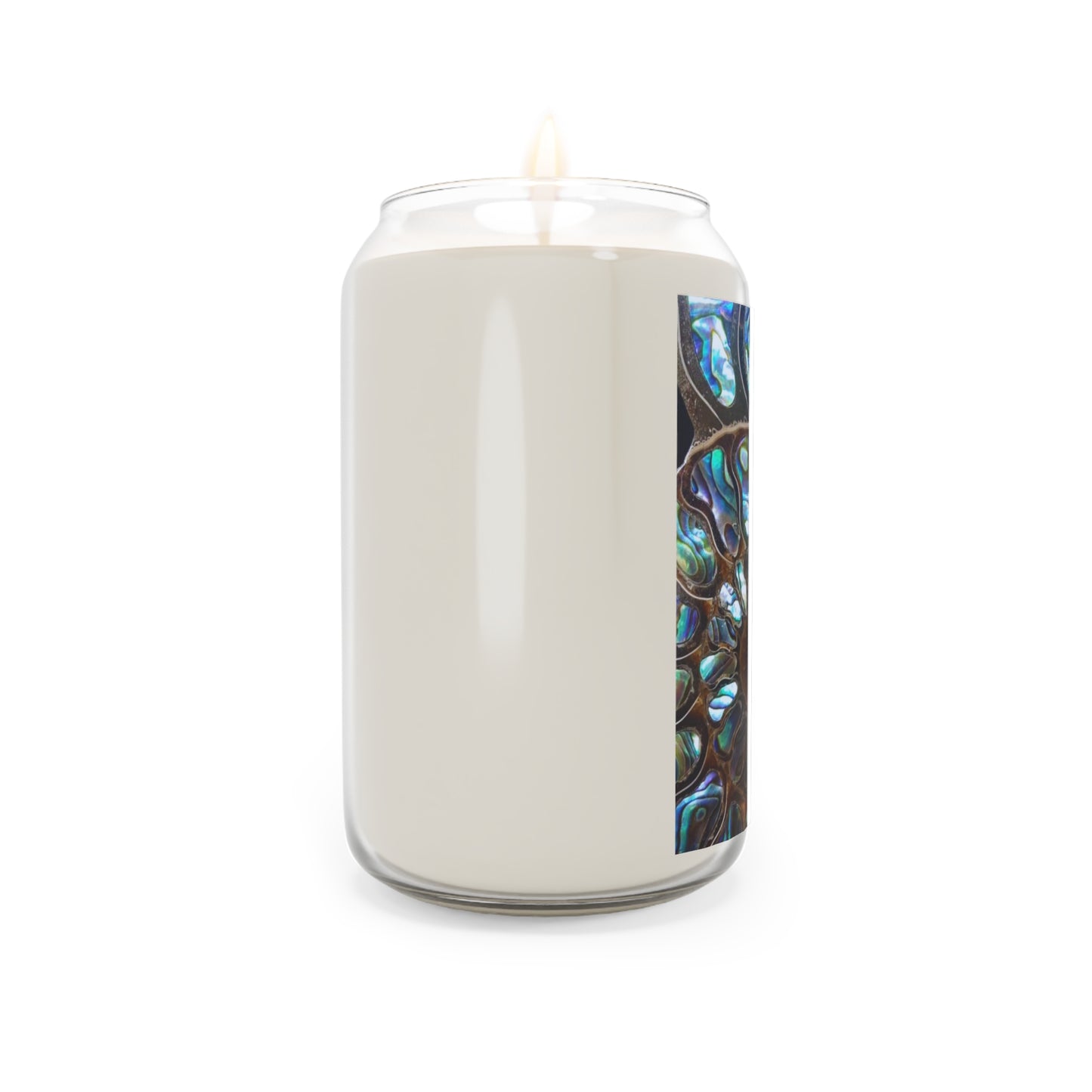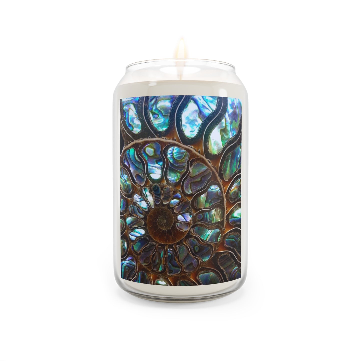 Add a touch of character to your me-time with these personalized scented candles. Our exclusive Ammonite Fossil & Abalone design combines two natural ocean beauties shown in a REAL photo: a fossilize ammonite seashell surrounded by cuts of natural blue, green and purple abalone shells. Awesome conversation-starter art for your home! Candle is made with a 100% natural soy wax blend, these scented candles feature a 100% cotton wick and deliver 70-80 hours of blissful relaxation. Enjoy the compliments you'll get; and consider gifting to family and friends.