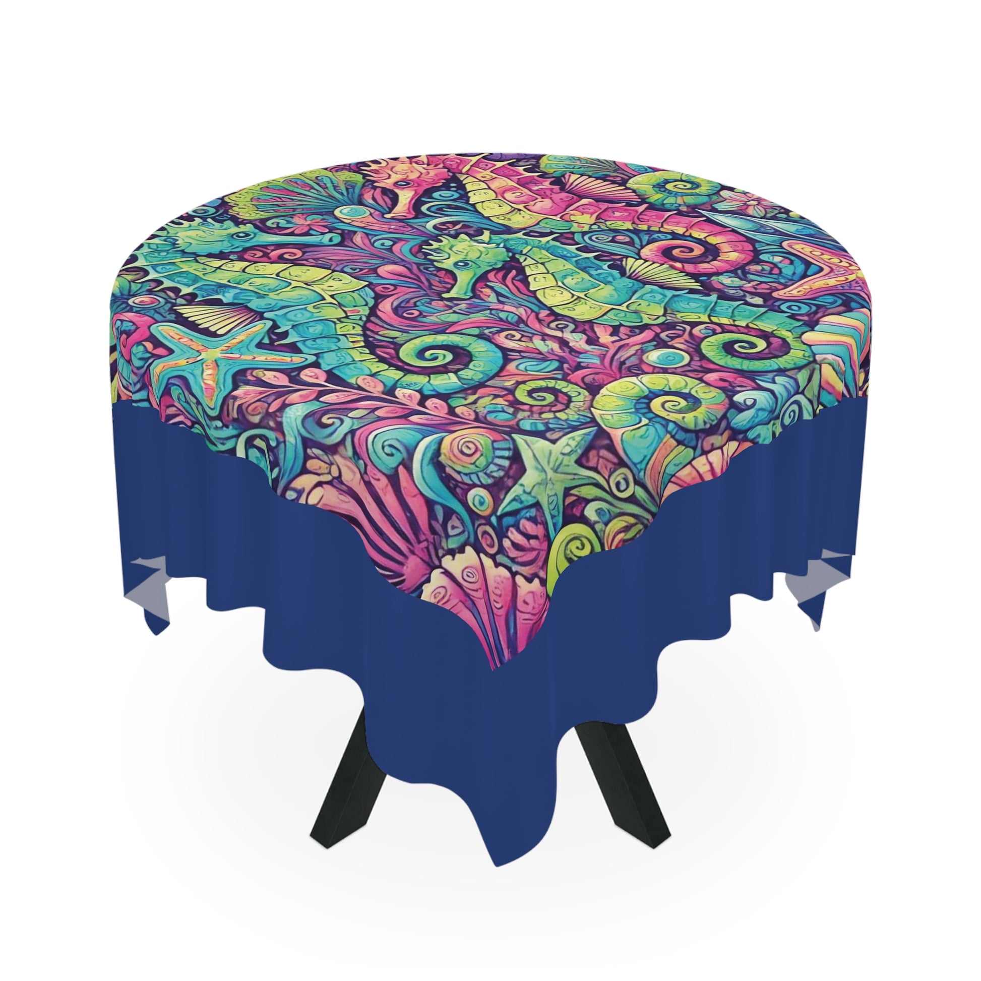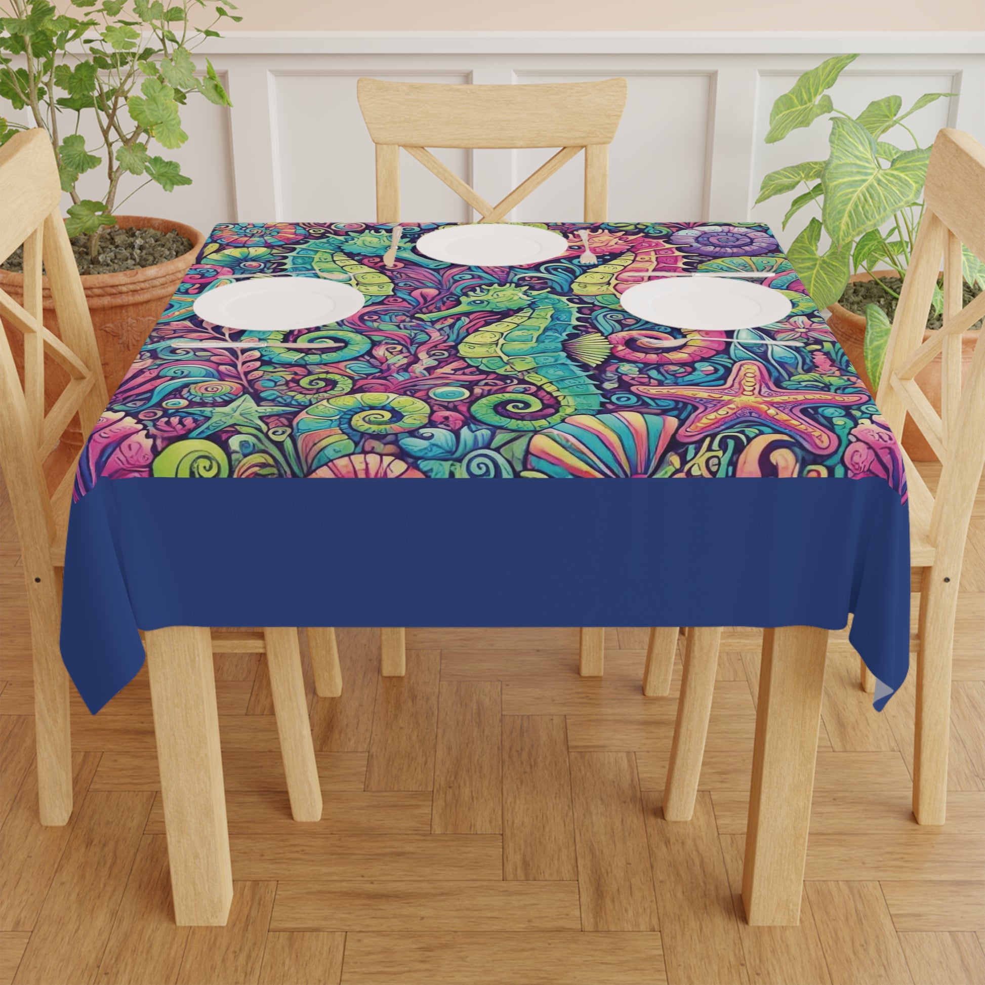 Add fun tropical seahorses to your dining experience with this beautiful tablecloth. Crafted from 100% polyester, this one-size 55.1" x 55.1" square table decor it's not only durable but also retains its shape while drying quickly. The full-print design brings to life a stunning array of colors, making it the perfect centerpiece for any meal or gathering. Lightweight and soft to the touch, this tablecloth creates an inviting atmosphere, ideal for both casual family dinners and festive occasions. Perfect for those who love to host, entertain, or simply enjoy a beautifully adorned table. This tablecloth is ideal for holidays, celebrations, or cozy dinners at home, enriching every event with its lively charm. Suitable for enthusiasts of home decor, gardening, and nature-inspired designs, it adds a splash of style to any setting.
