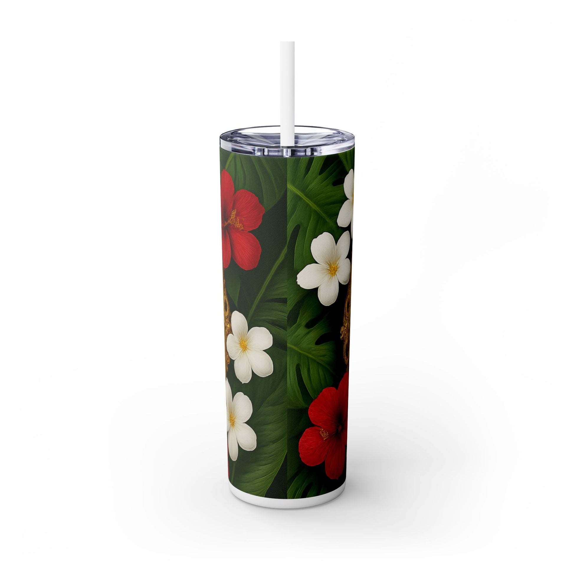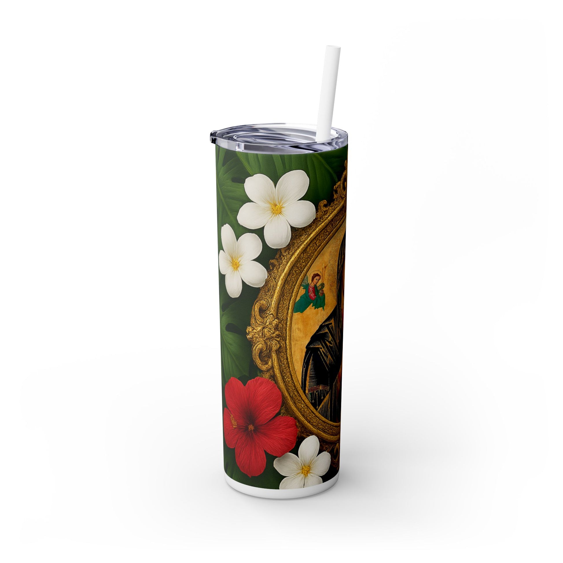 Religious Skinny Tumbler with Straw - 20oz Tropical Vibes / Our Lady of Perpetual Help, Red Floral