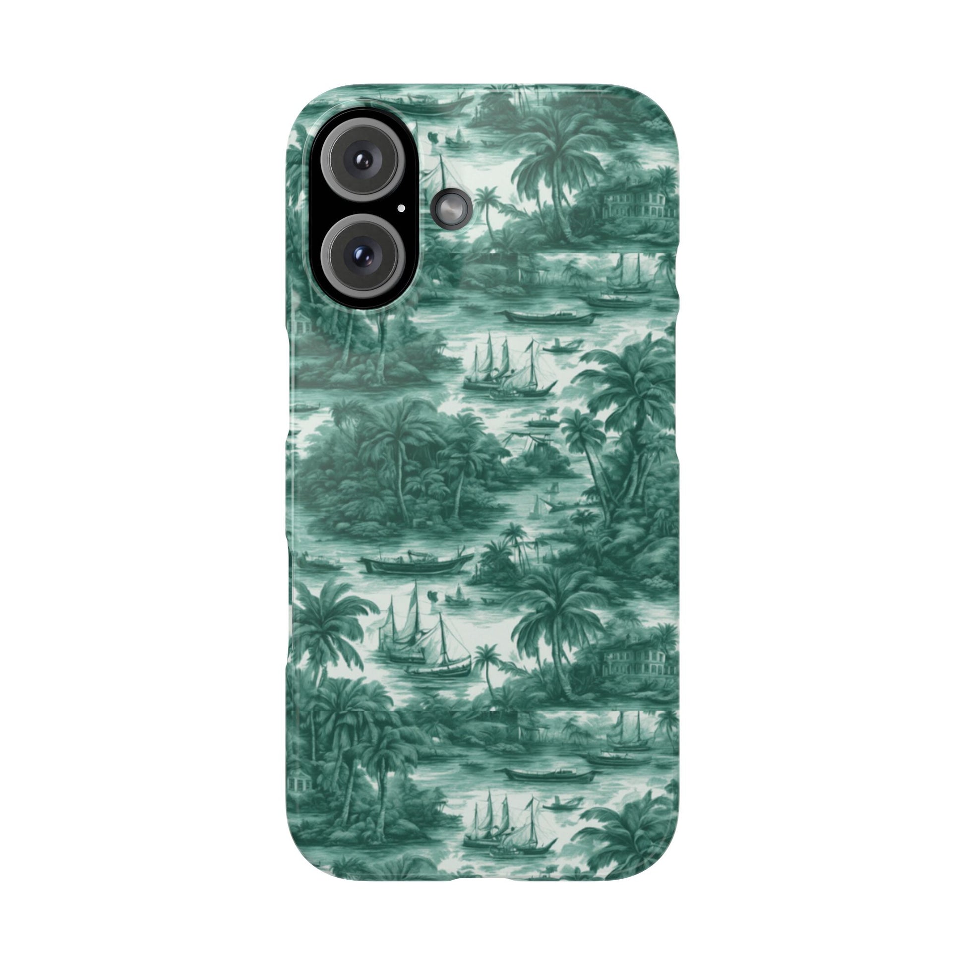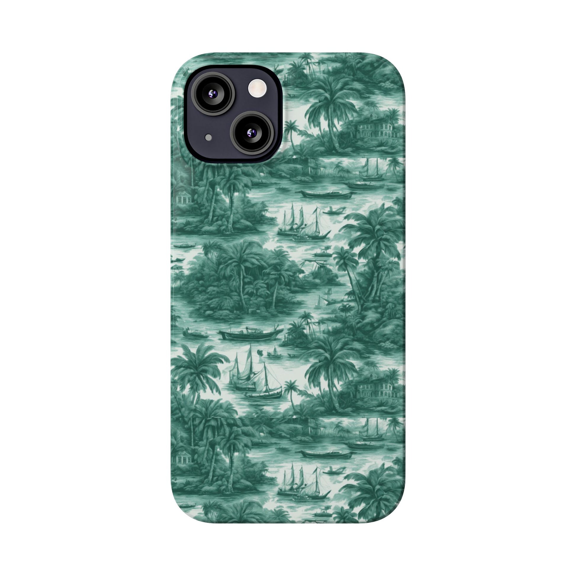 These flexible, super-slim cases provide a flawless fit. With their slim lines, glossy finish, and lightweight construction, they’re the perfect accessory that complements your phone’s aesthetics. Feature our exclusive Tropical Toile #1 pattern depicting a classic toile scene of palm trees, placid ocean waters, seaside homes, boats and more taking you to Paradise every day. This isn't your mother's toile design! Evergreen