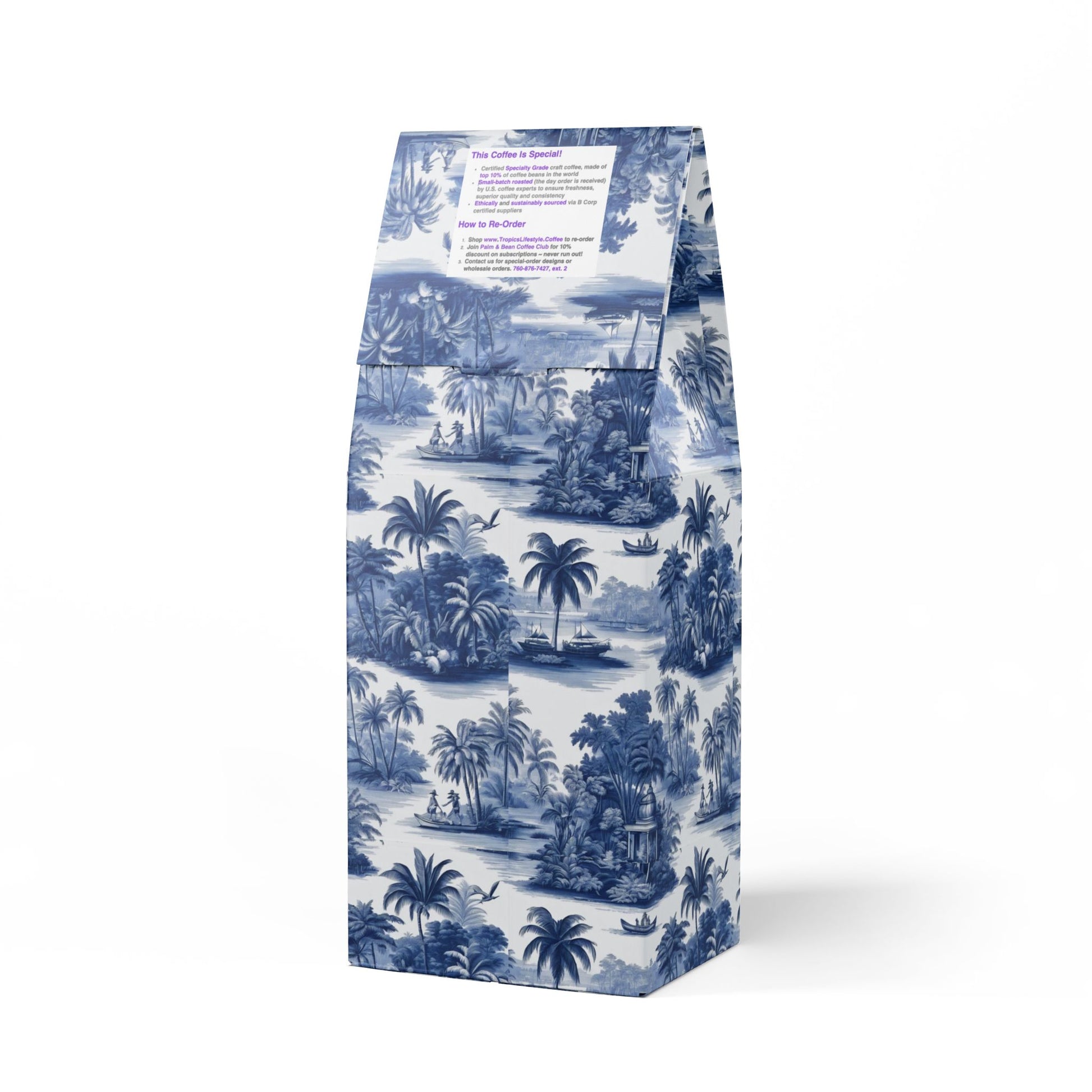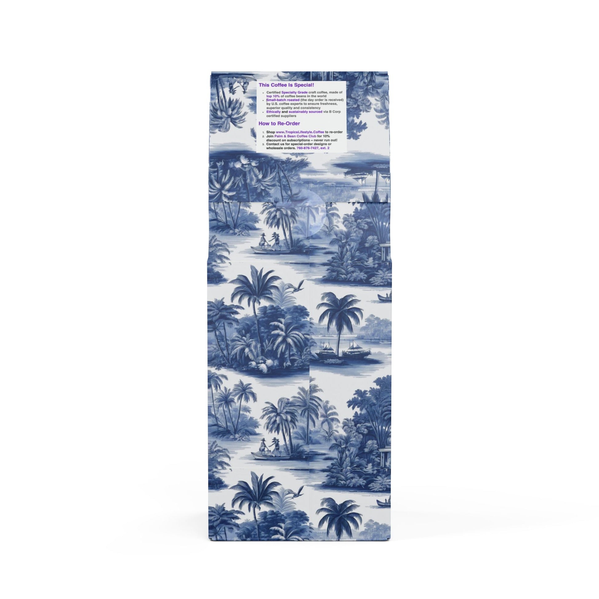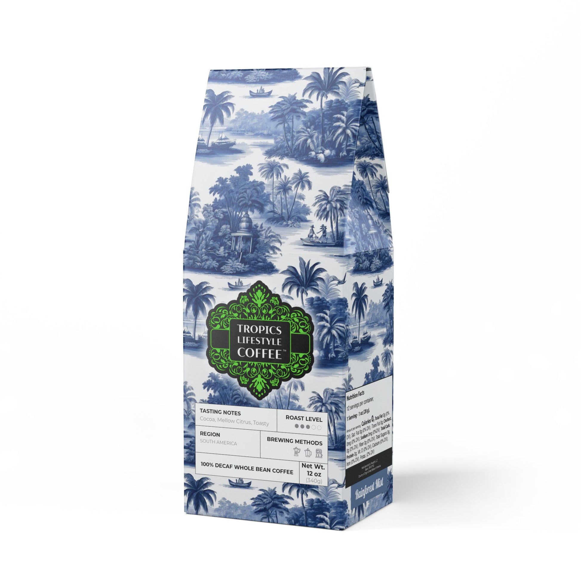 Get all the flavor without the buzz thanks to Rainforest Mist™ Single Origin DECAF. This 12oz pack boasts a mellow, smooth, and savory flavor profile, featuring subtle tasting notes of peanut and milk chocolate, with a mellow acidity that'll leave you craving another cup. Sourced from the sunny slopes of South America and decaffeinated using the Swiss Water process. Brew it up in your drip coffee maker, French press, or percolator. Available in whole bean and ground options to match your equipment. Roasted in the US. Liimted-edition bag art features our original My Last Voyage design, taking you on a virtual vacay every day with classic toile images re-imagined. Don't run out! Join our monthly Subscription coffee plan.