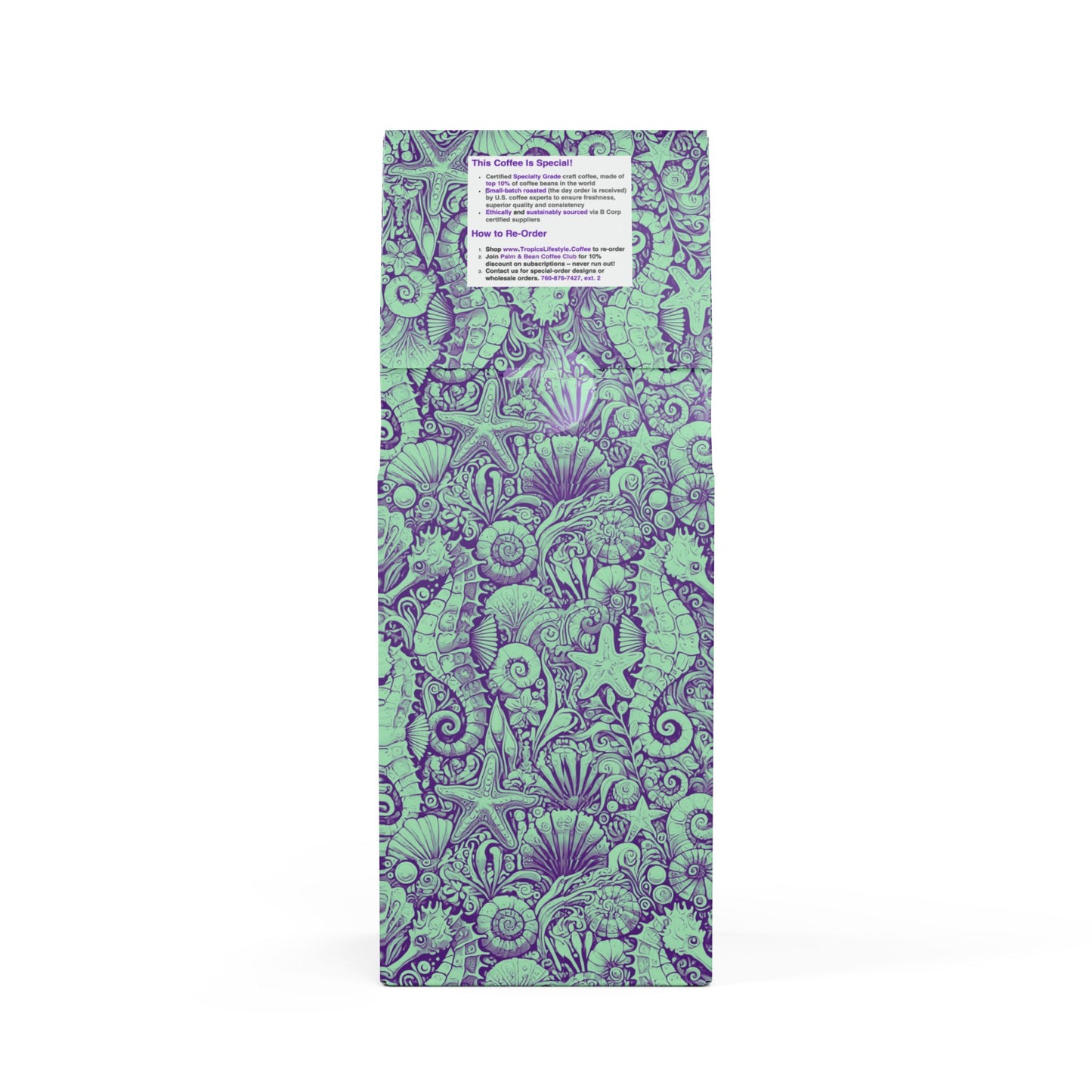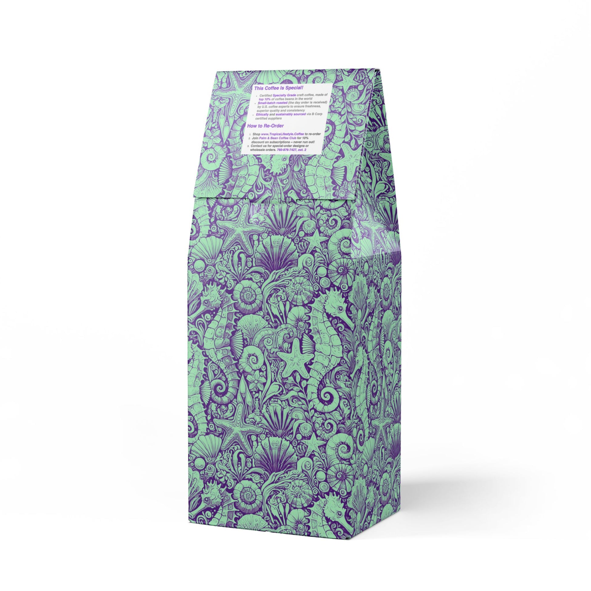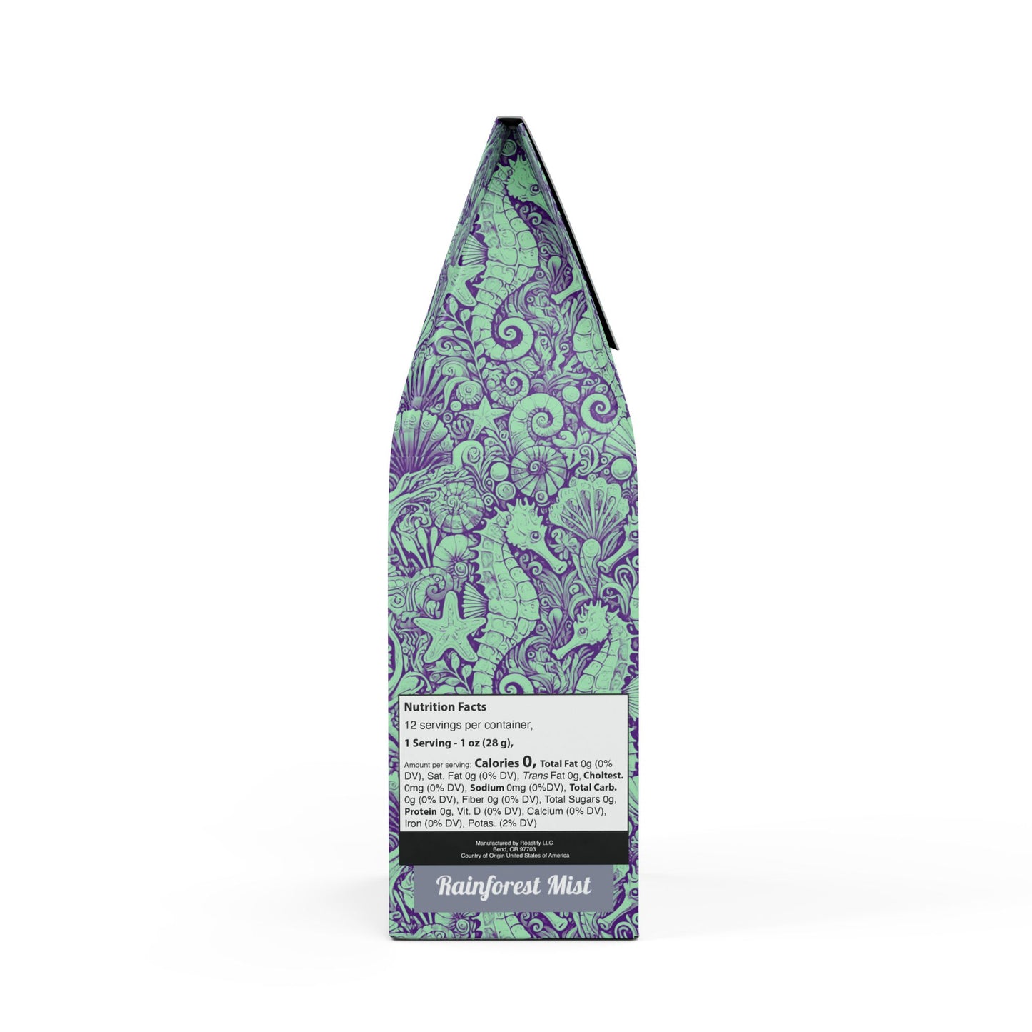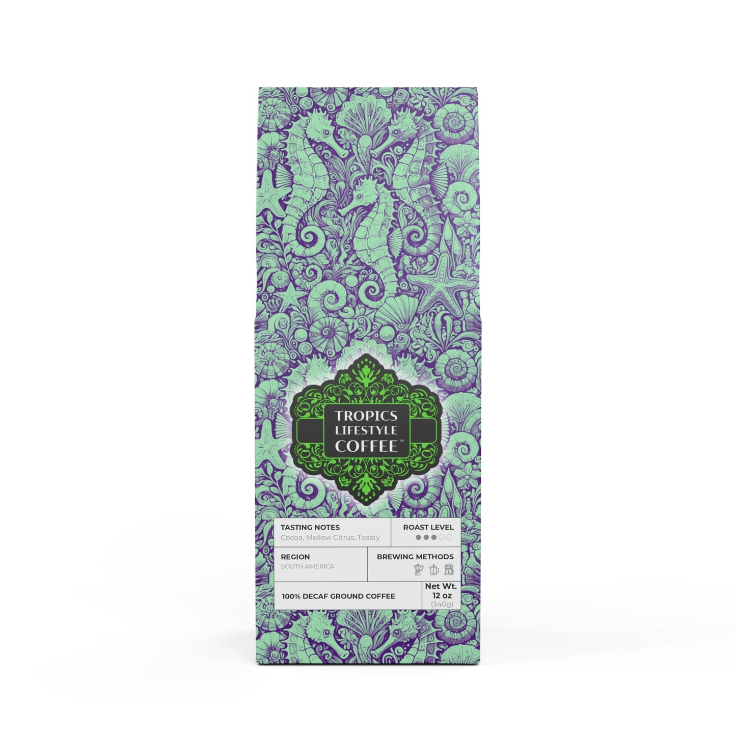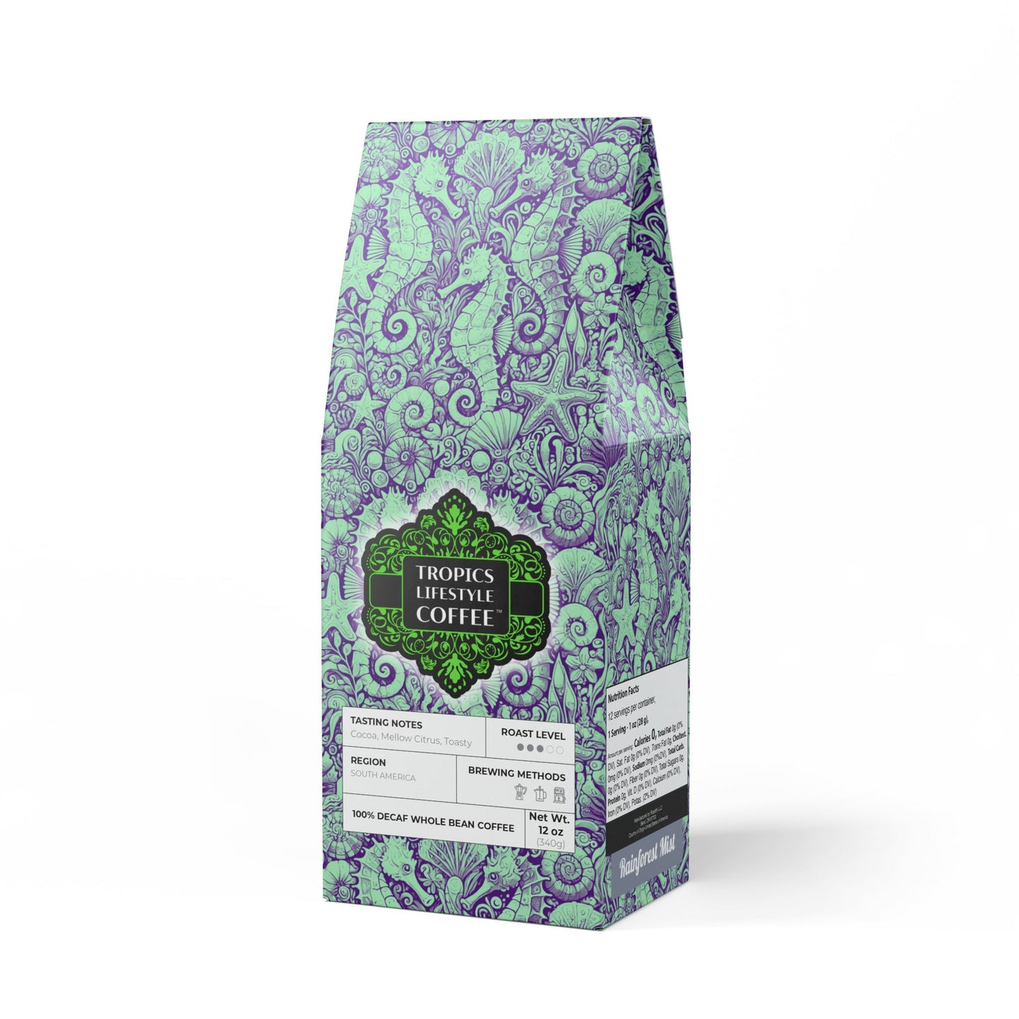 Get all the flavor without the buzz thanks to the Rainforest Mist™ Single Origin DECAF. This 12oz pack boasts a mellow, smooth, and savory flavor profile, featuring subtle tasting notes of peanut and milk chocolate, with a mellow acidity that'll leave you craving another cup. Sourced from the sunny slopes of South America and decaffeinated using the Swiss Water process. Brew it up in your drip coffee maker, French press, or percolator. Available in whole bean and ground options to match your equipment. Roasted in the U.S. Limited-edition bag art features our original Seahorse Trio stylized design, evoking feelings of a dreamy underwater tropical destination to explore thanks to seahorses, seashells and other ocean elements. Don't run out! Join our monthly Subscription coffee plan.