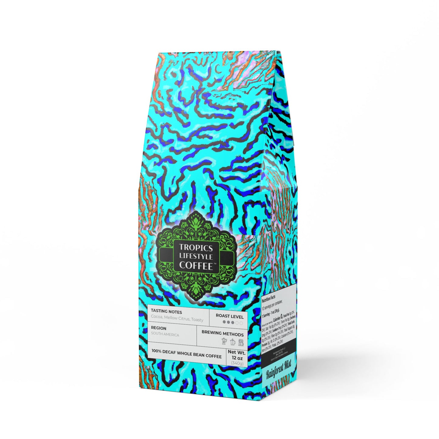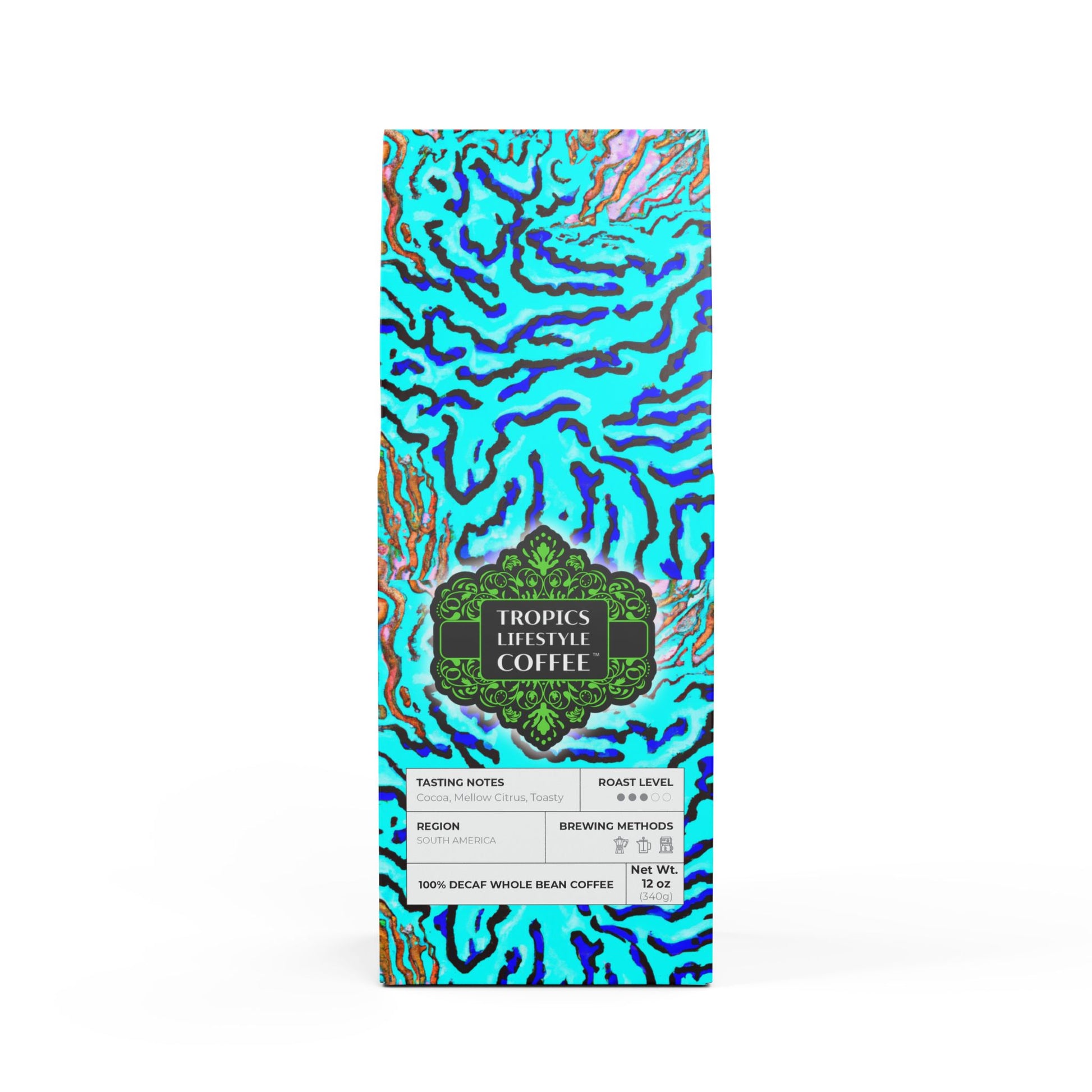 Get all the flavor without the buzz thanks to Rainforest Mist™ Single Origin DECAF. This 12oz pack boasts a mellow, smooth, and savory flavor profile, featuring subtle tasting notes of peanut and milk chocolate, with a mellow acidity that'll leave you craving another cup. Sourced from the sunny slopes of South America and decaffeinated using the Swiss Water process. Brew it up in your drip coffee maker, French press, or percolator. Available in whole bean and ground options to match your equipment. Roasted in the US. Limited-edition bag art features our original Wild Coral Reef stylized design, evoking feelings of a dreamy underwater tropical destination to explore. Don't run out! Join our monthly Subscription coffee plan.