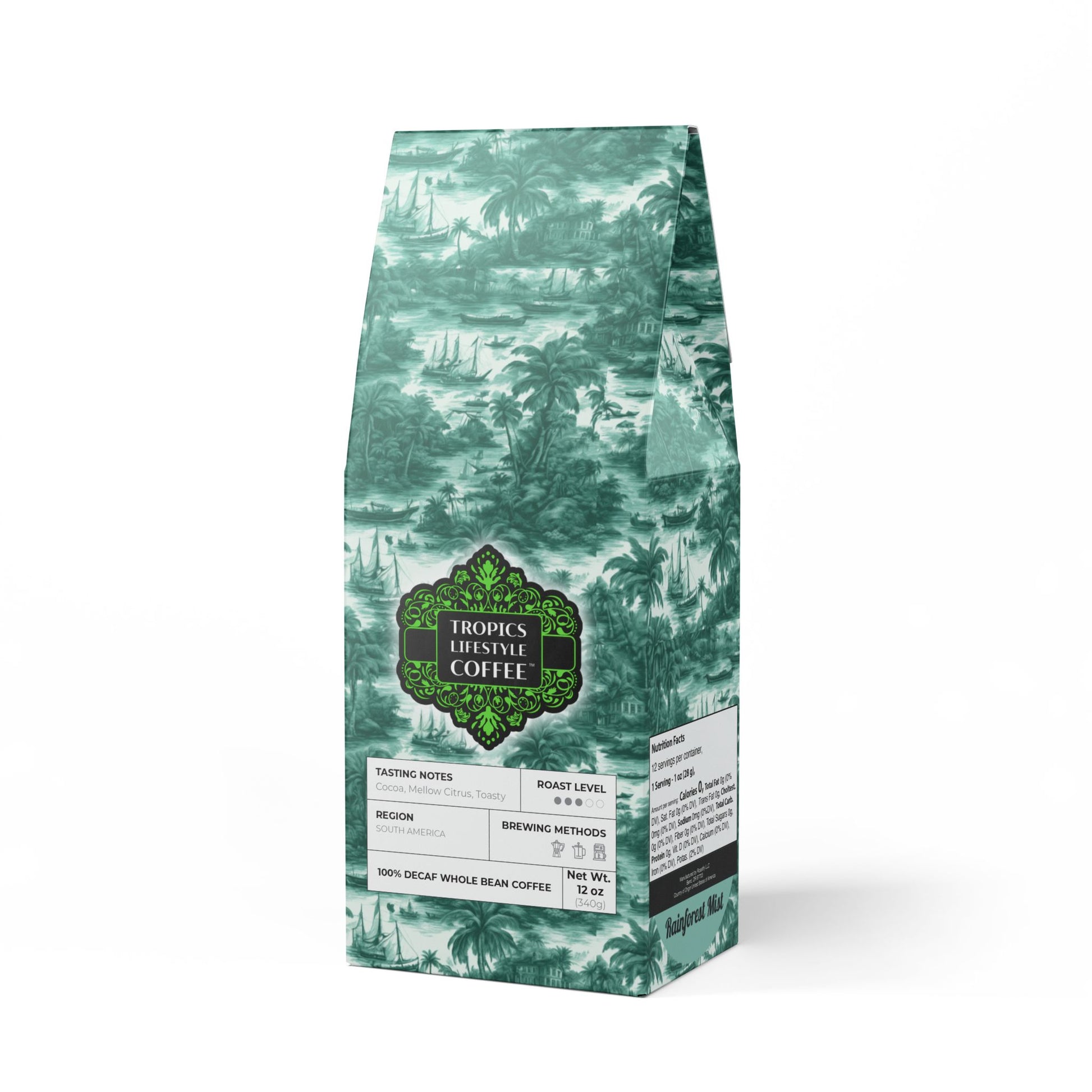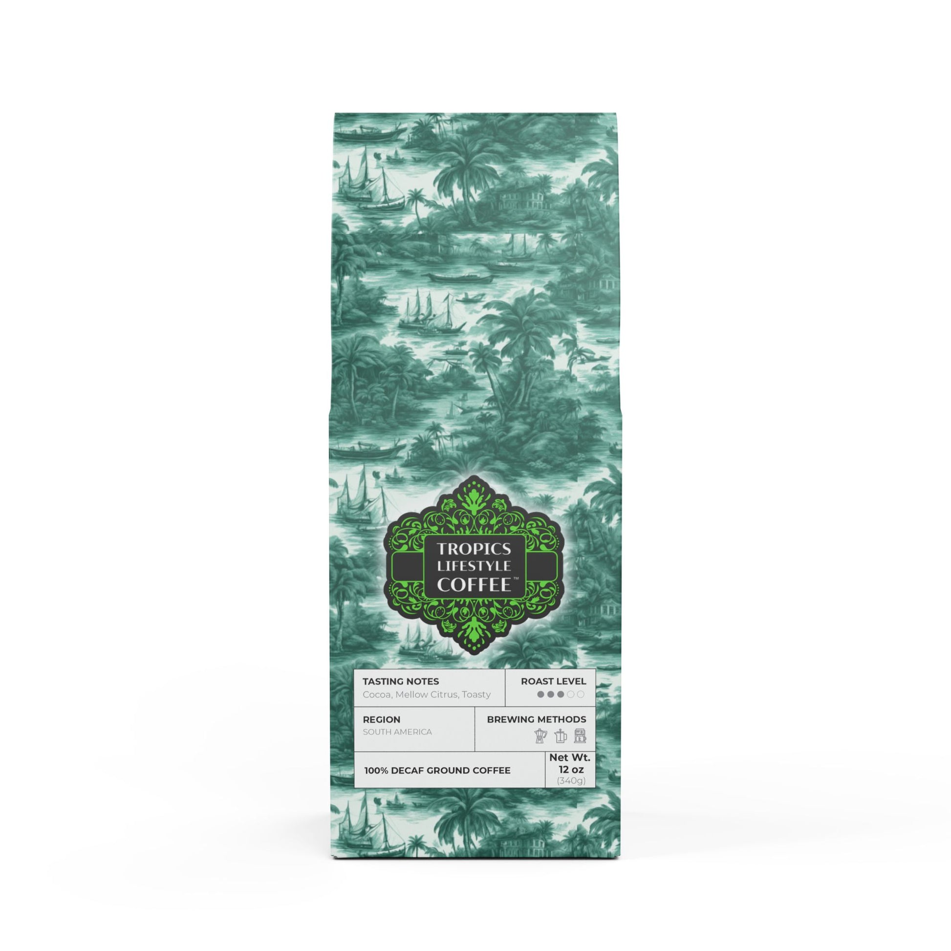 Get all the flavor without the buzz thanks to the Rainforest Mist™ Single Origin DECAF. This 12oz pack boasts a mellow, smooth, and savory flavor profile, featuring subtle tasting notes of peanut and milk chocolate, with a mellow acidity that'll leave you craving another cup. Sourced from the sunny slopes of South America and decaffeinated using the Swiss Water process. Brew it up in your drip coffee maker, French press, or percolator. Available in whole bean and ground options to match your equipment. Roasted in the USA and certified as "Specialty Grade Craft Coffee." Limted-edition bag art features our original Tropical Toile design, evoking feelings of a dreamy tropical destination with plenty of lovely toile images of palm trees, ocean waves, islands, ships and more. Don't run out! Join our monthly Subscription coffee plan.