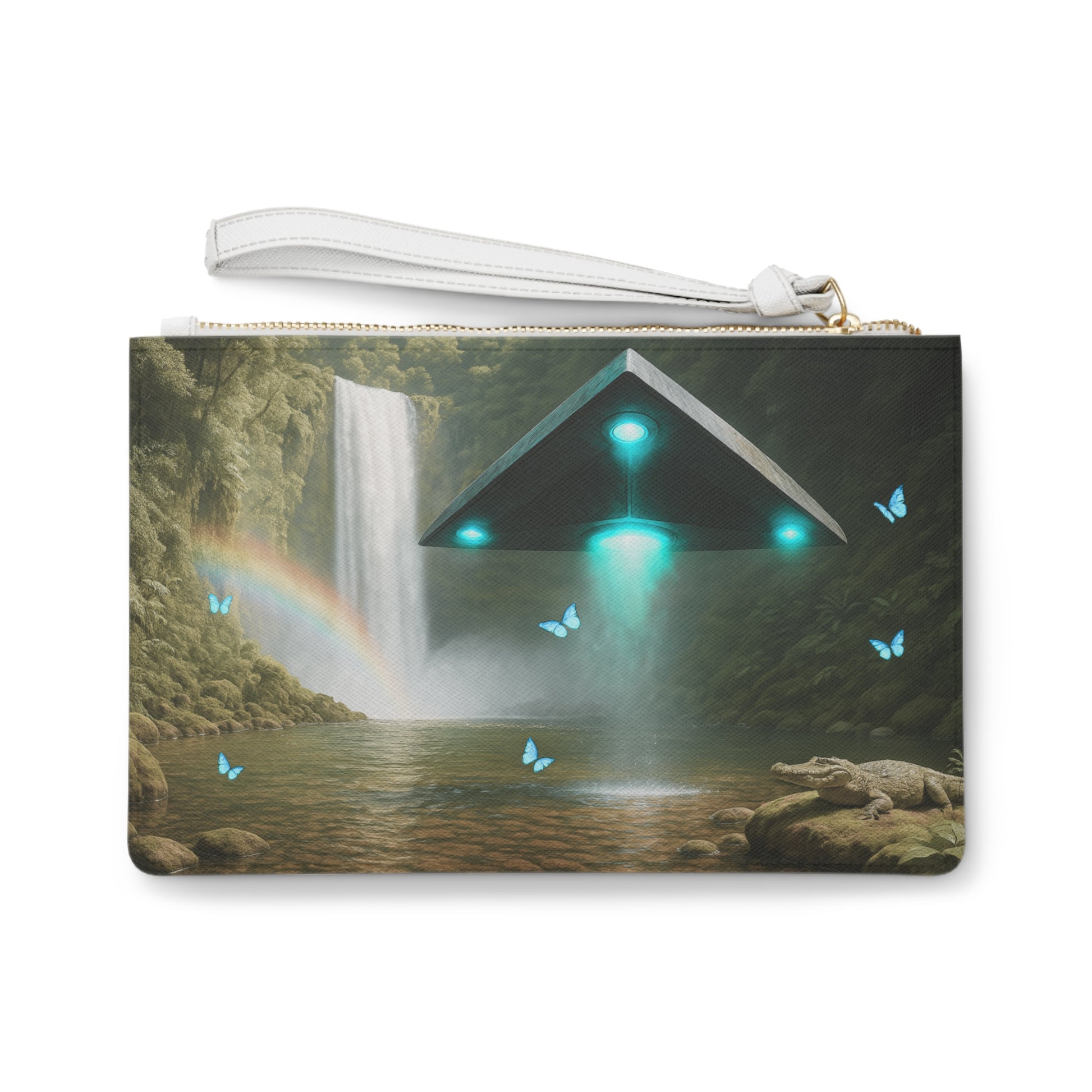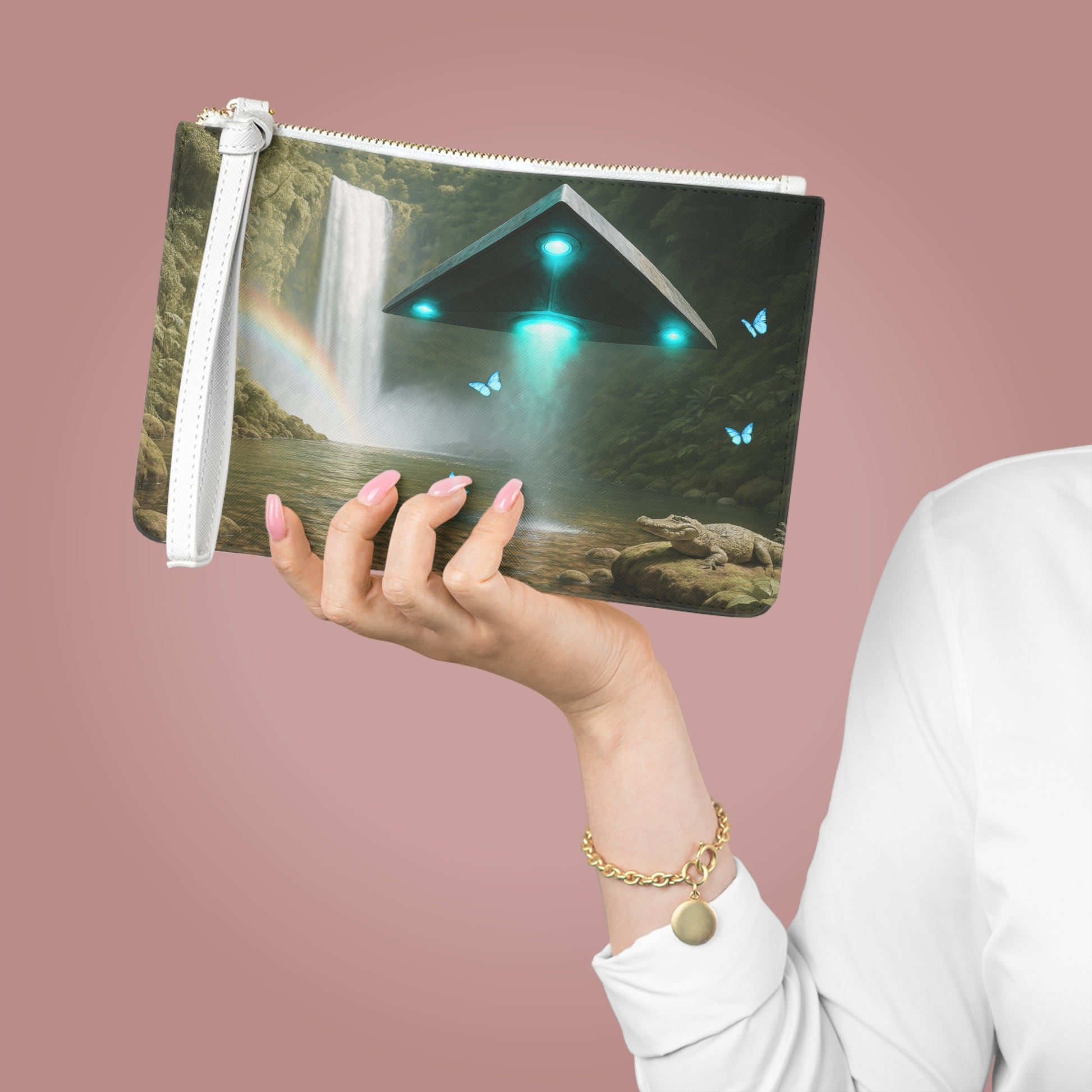Tropical Faux Leather Clutch Bag - Perfect for Beach Adventures & Summer Vacations / UFO and Waterfall