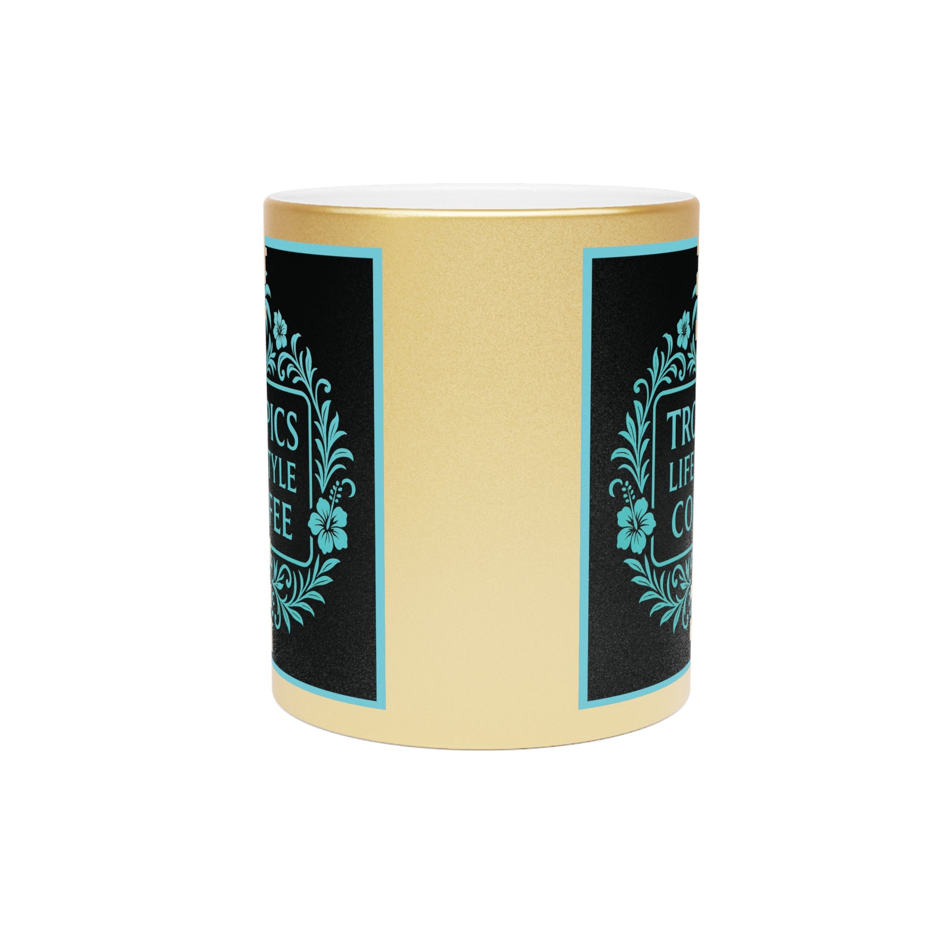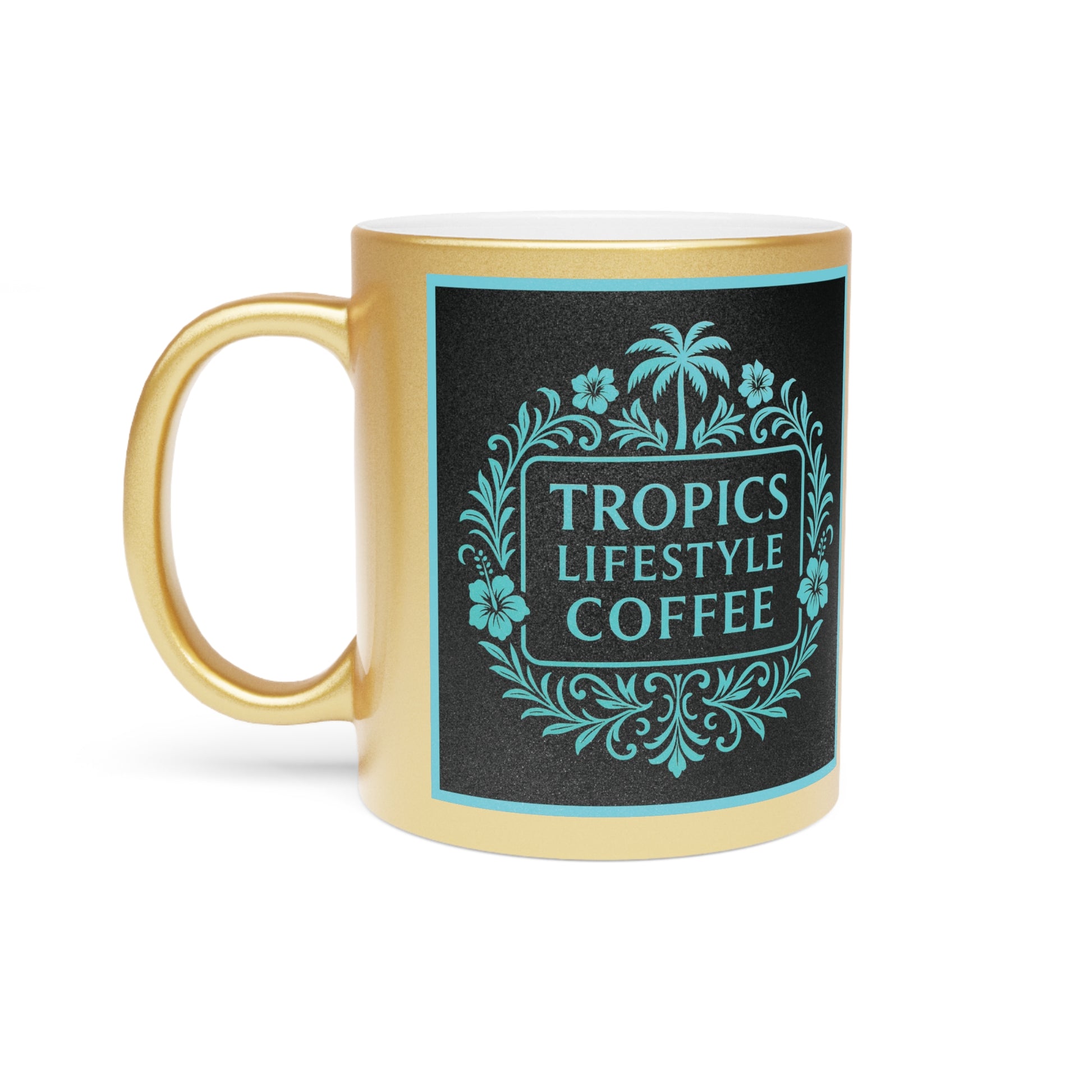 Tropical Metallic Mug, Gold or Silver - Tropics Lifestyle Coffee, Black/Turquoise Logo