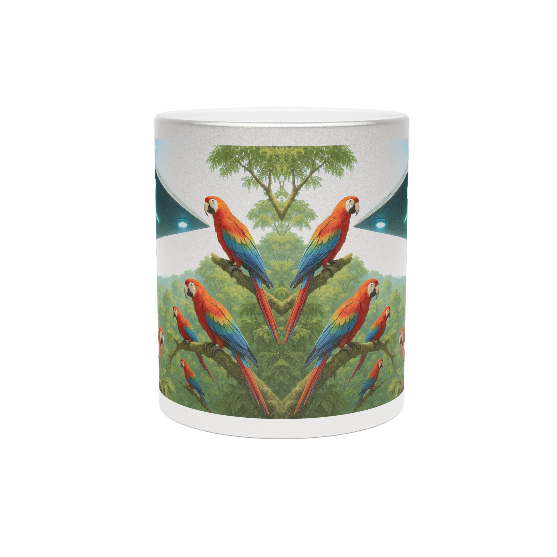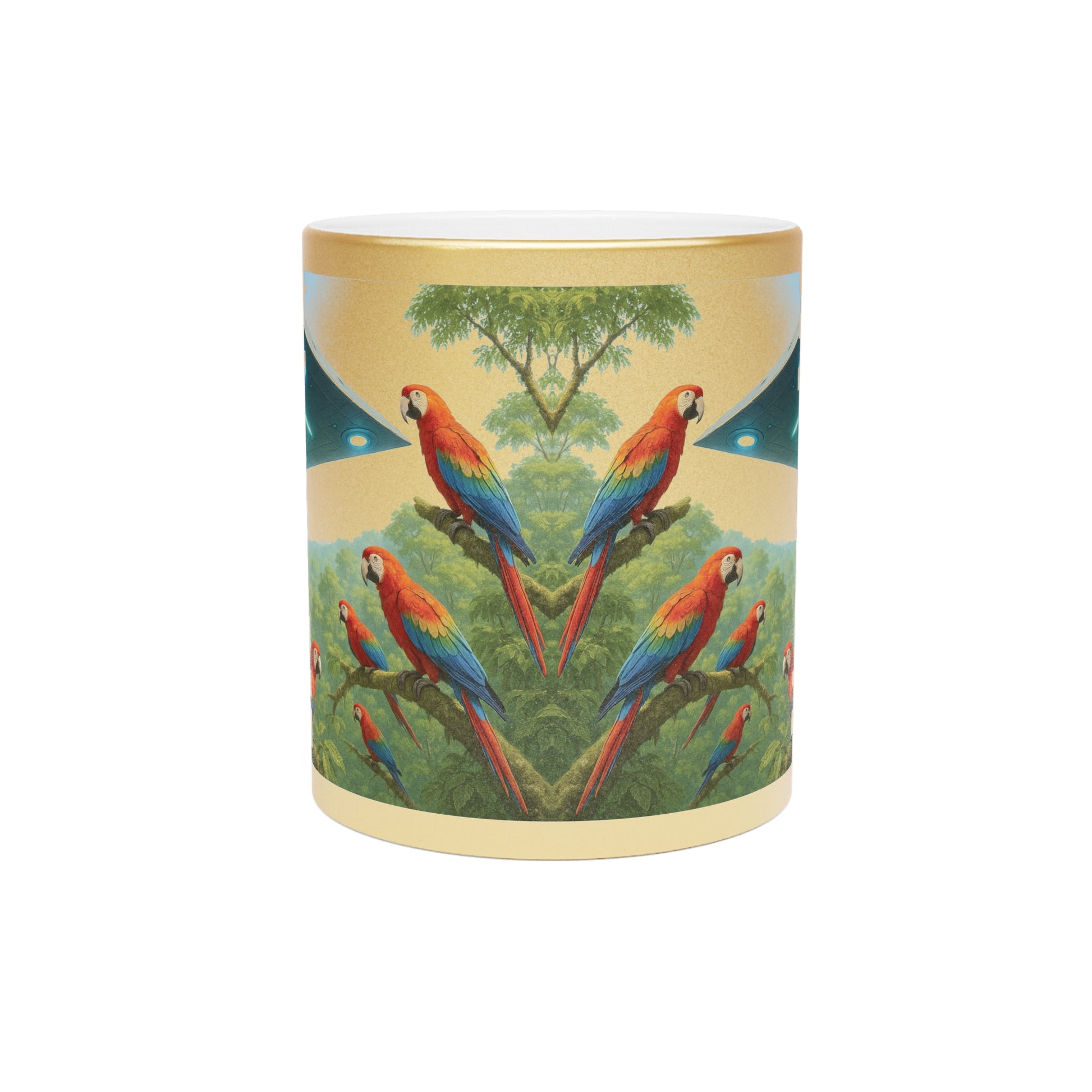 Tropical Metallic Mug, Gold or Silver: UFO and Parrots