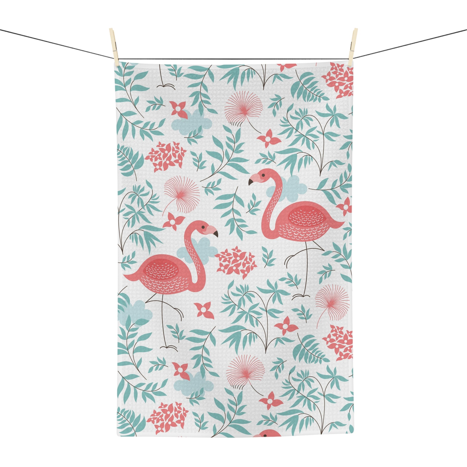 Bright, cheerful, and effortlessly playful — this microfiber tea towel brings a burst of tropical charm to everyday kitchen moments. Soft, quick-drying fibers and hemmed edges make it easy to reach for after washing dishes or wiping counters. The one-sided print features elegant pink flamingos woven through teal foliage and soft floral bursts, giving your kitchen a light, sunny mood that lingers with every use. Lightweight and absorbent, it slips into a drawer or hangs from a hook, ready to add personality during casual breakfasts, summertime gatherings, or slow weekend mornings when you want your space to feel a little more joyful.