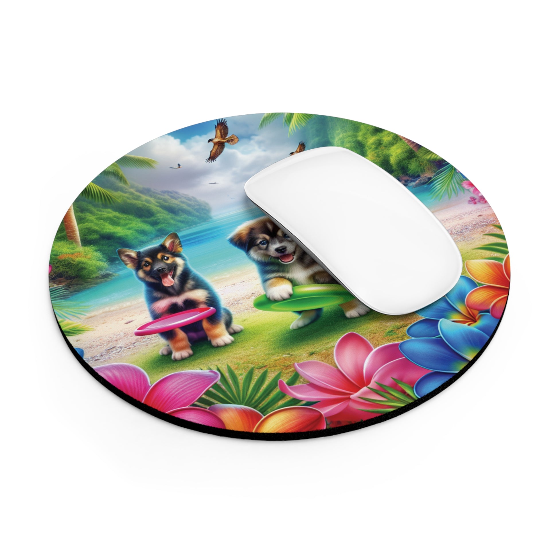 Tropical Mouse Pad, 2 Shapes - Beach Vibes for Home Office & Gamer / Three Puppies on Beach Playing Frisbee