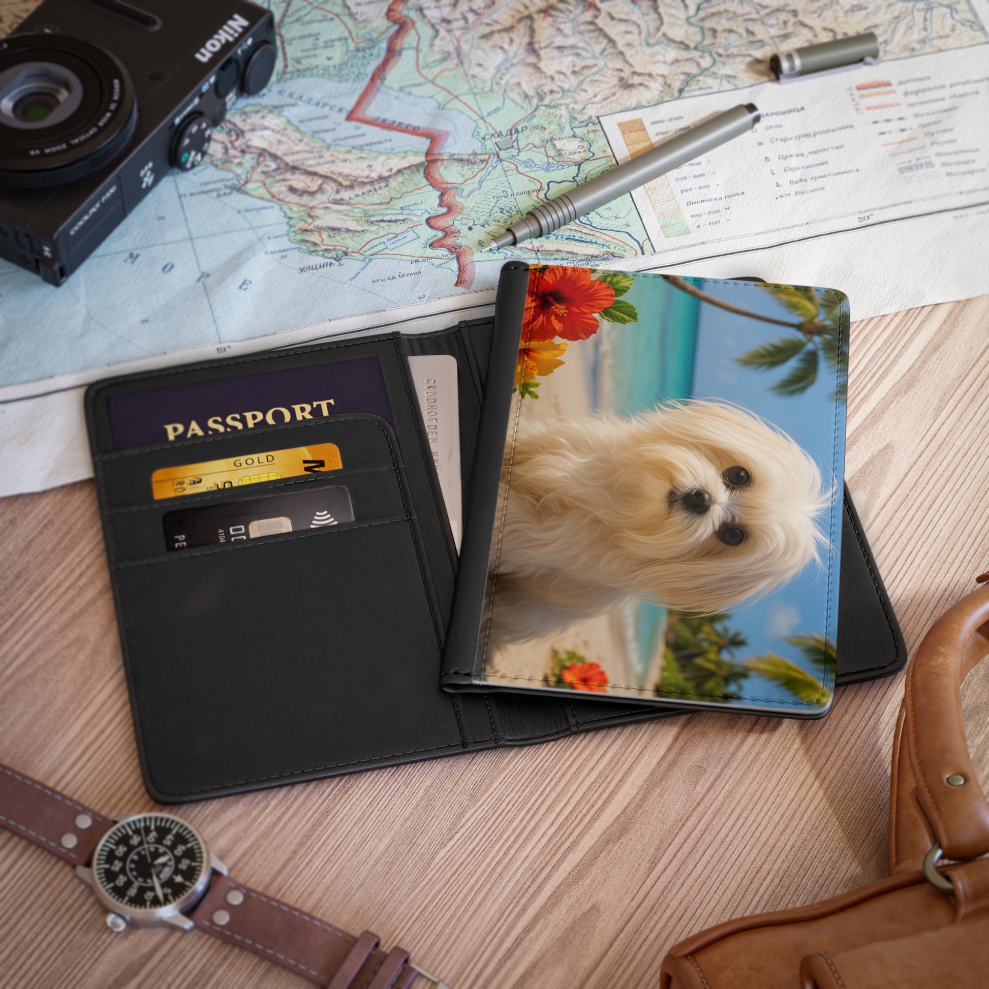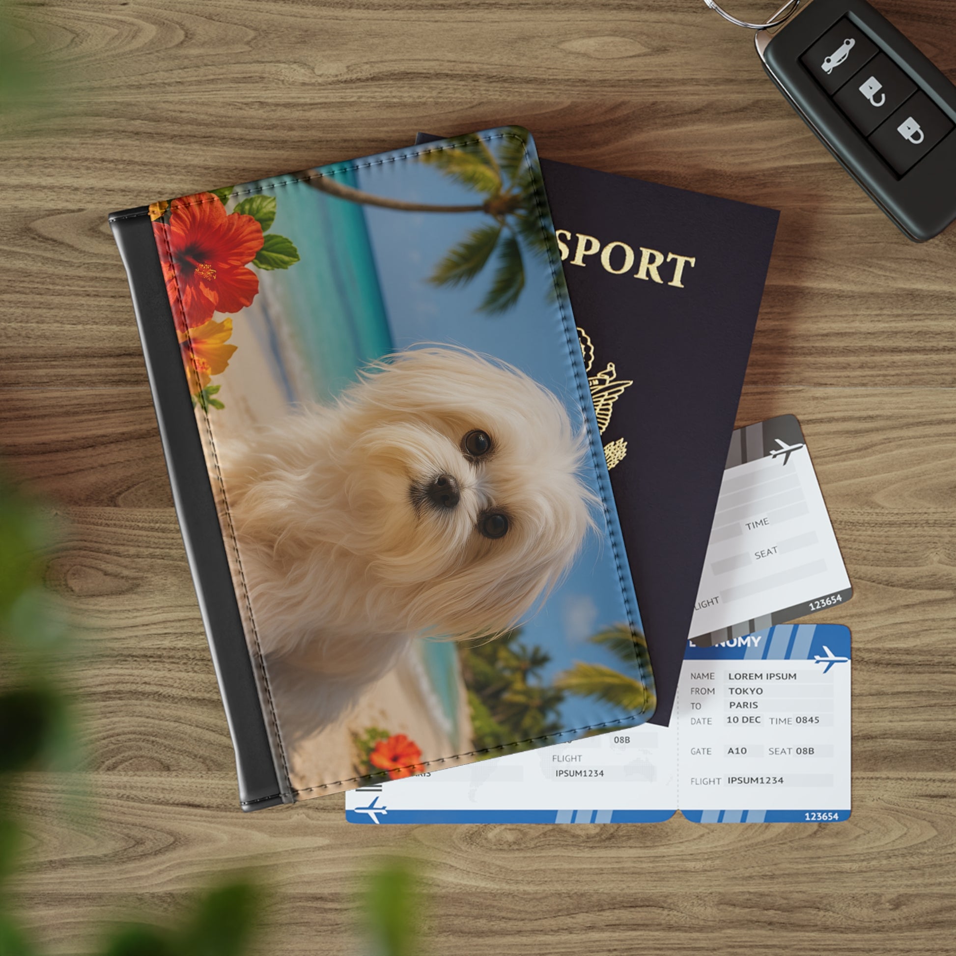 Tropical Passport Cover, Faux Leather - RFID blocking for travel security / Puppy Ariel on the Beach