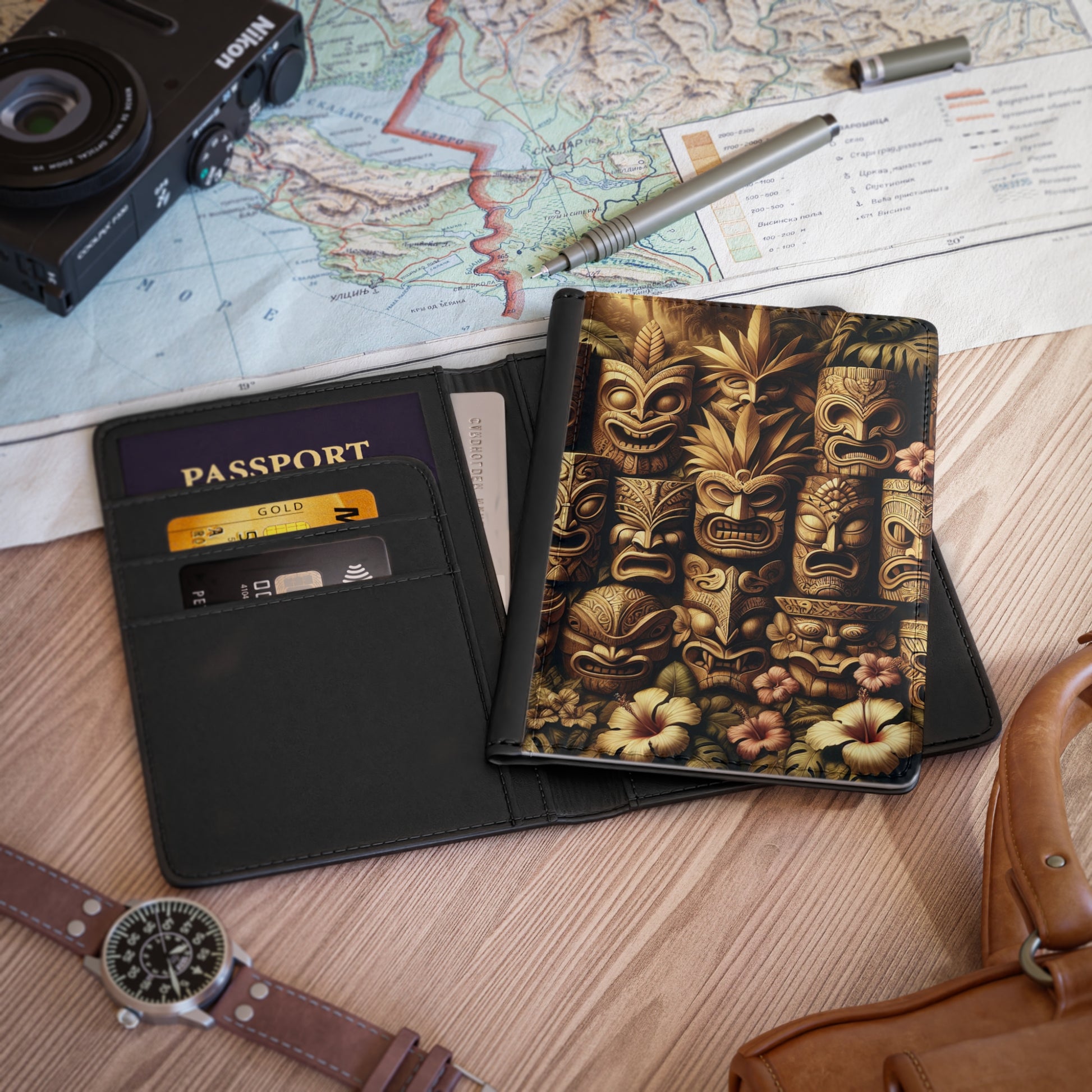 Tropical Passport Cover, Faux Leather - RFID blocking for travel security / Tiki Totem Faces