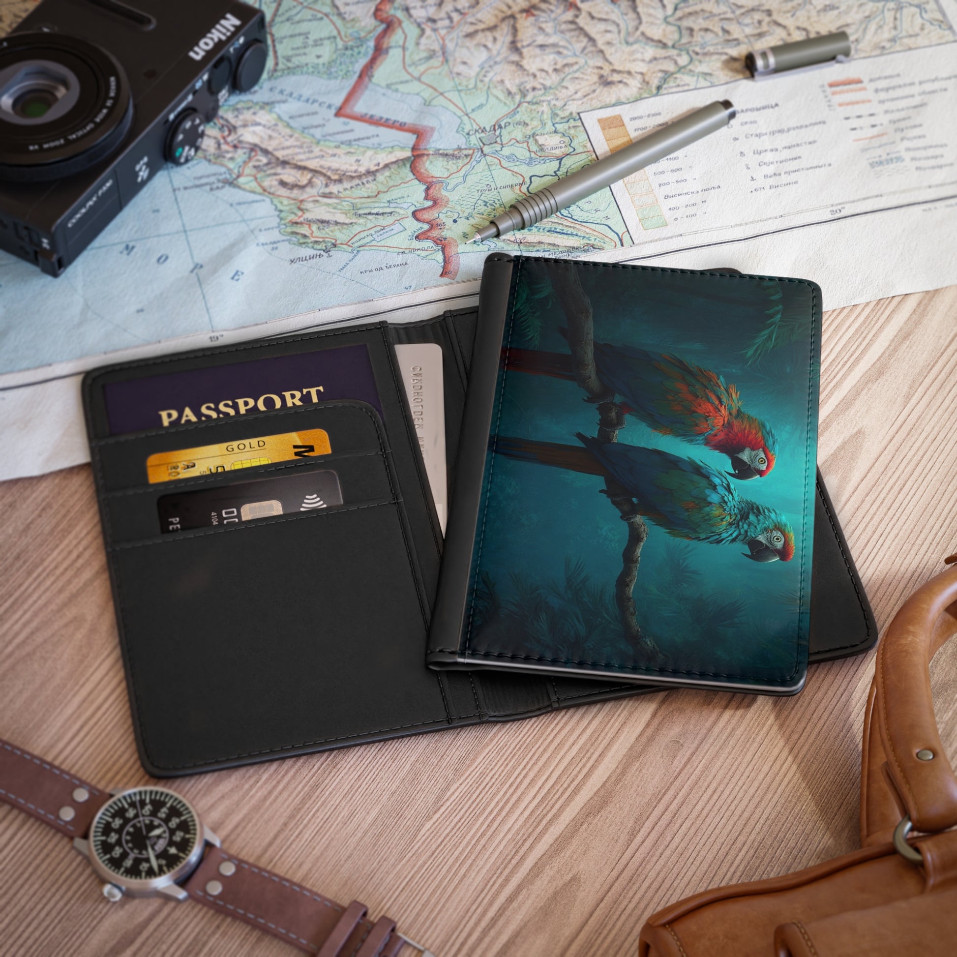 Tropical Passport Cover, Faux Leather - RFID blocking for travel security / Two Parrots in Rainforest