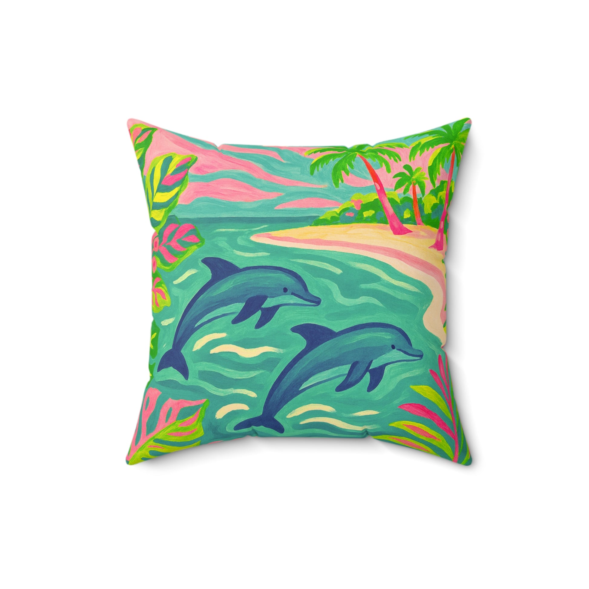 Tropical Pillow, 4 sizes - Colorful Spun Polyester Square Cushion / Jumping Dolphins