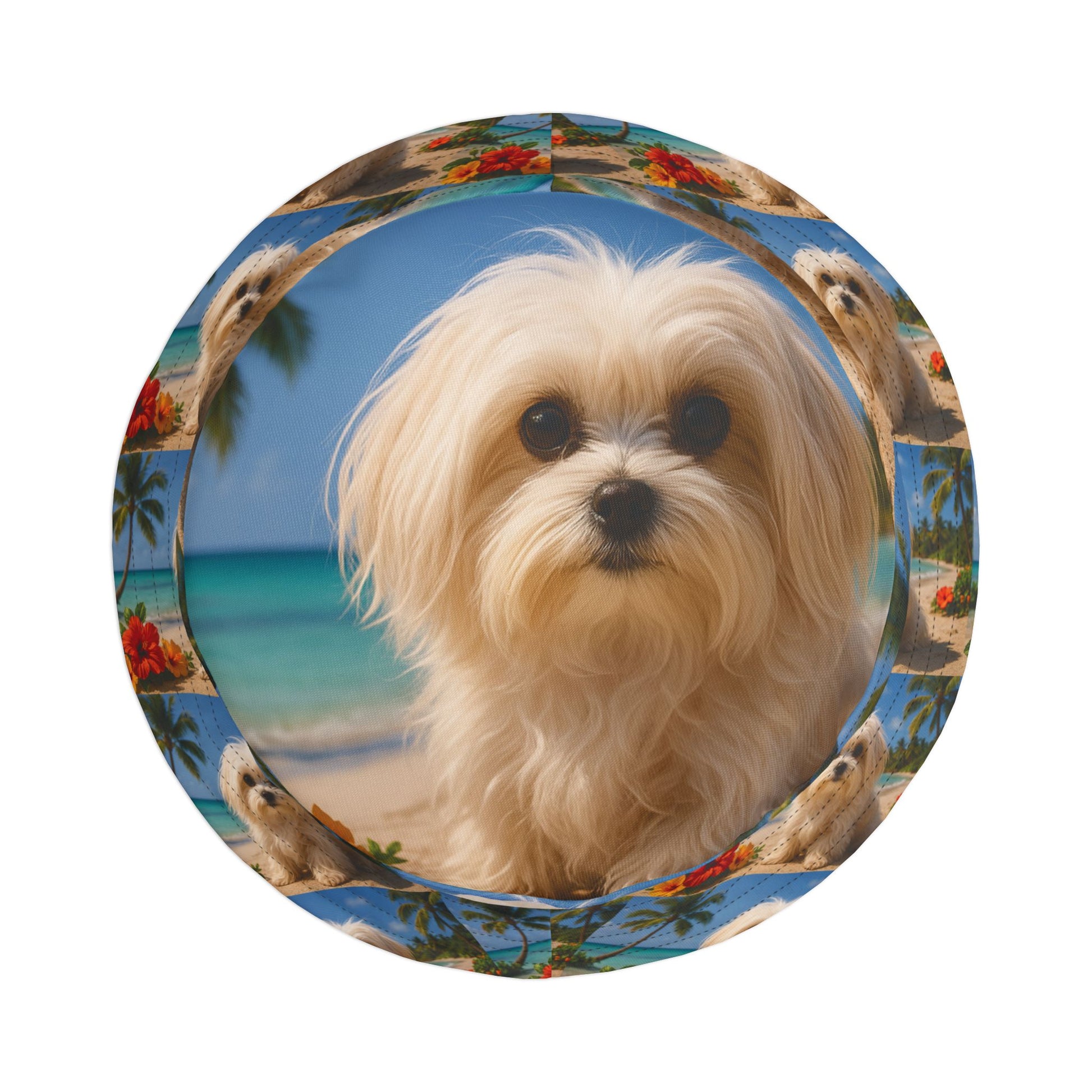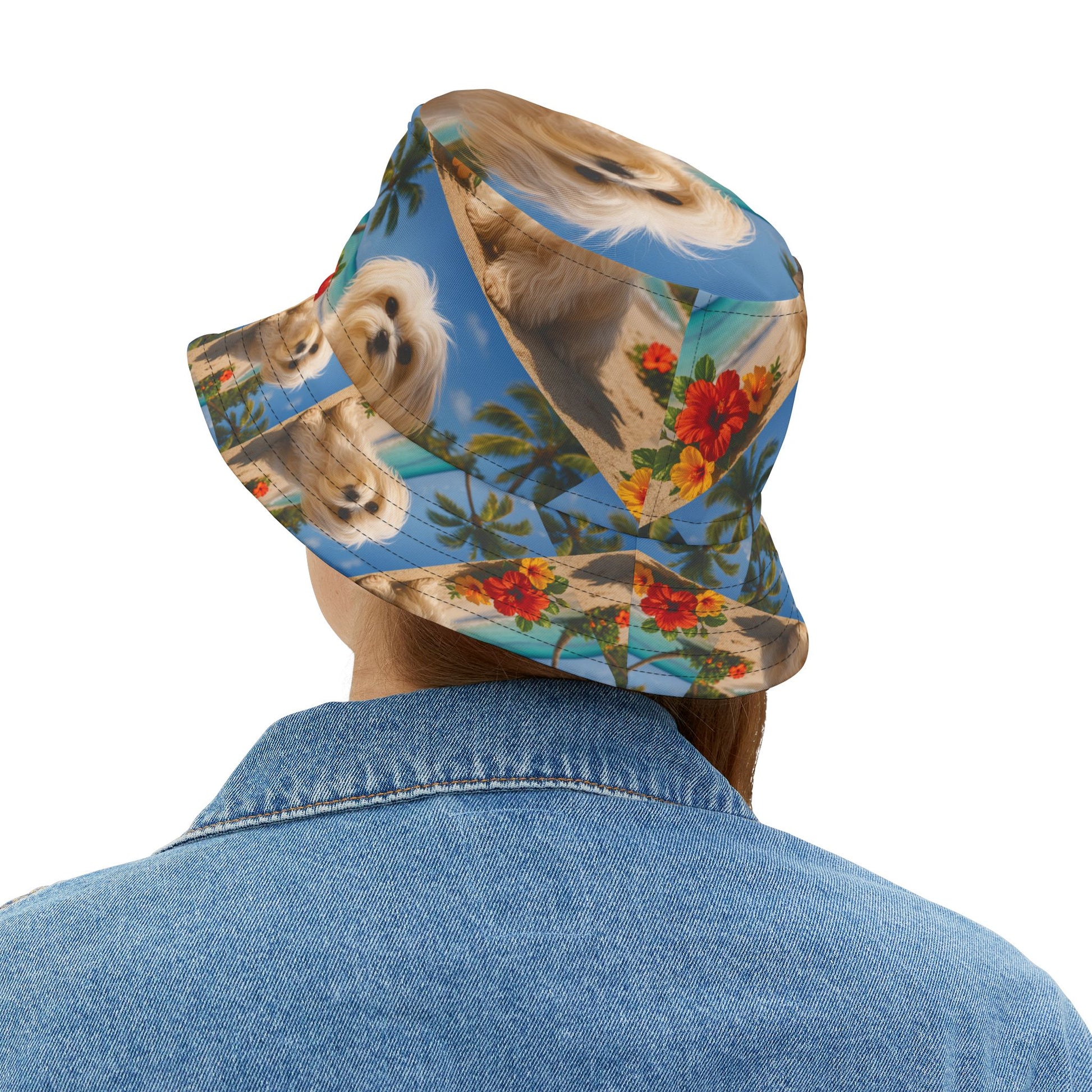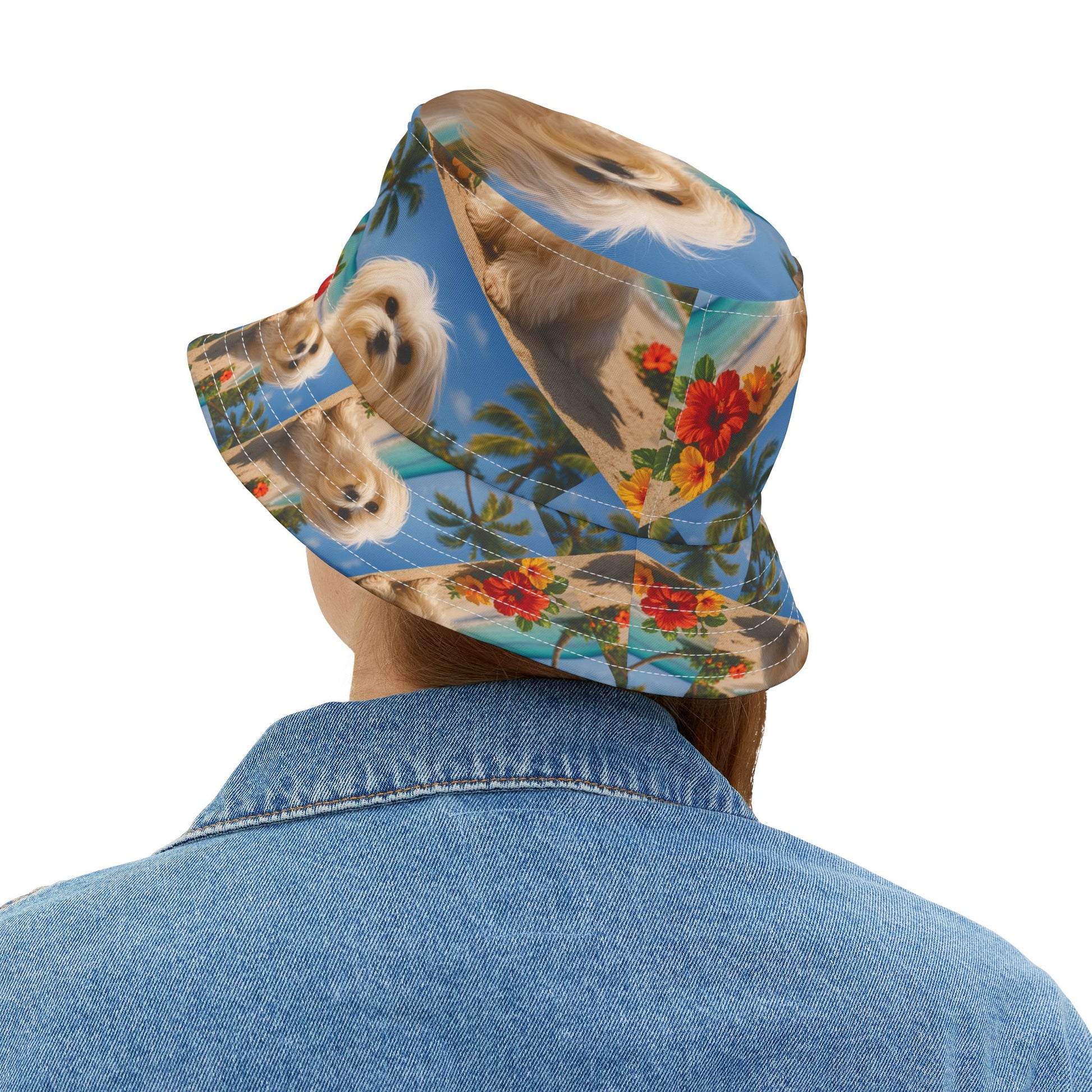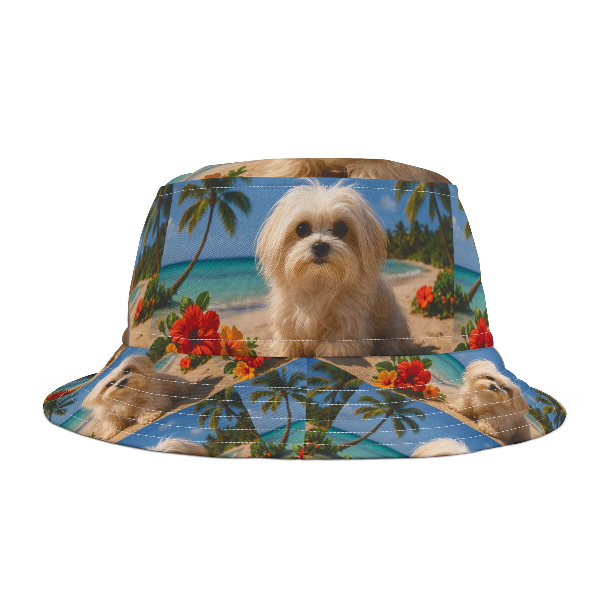 Tropical Polyester Bucket Hat, 2 Sizes - Puppy Ariel the Dog at the Beach