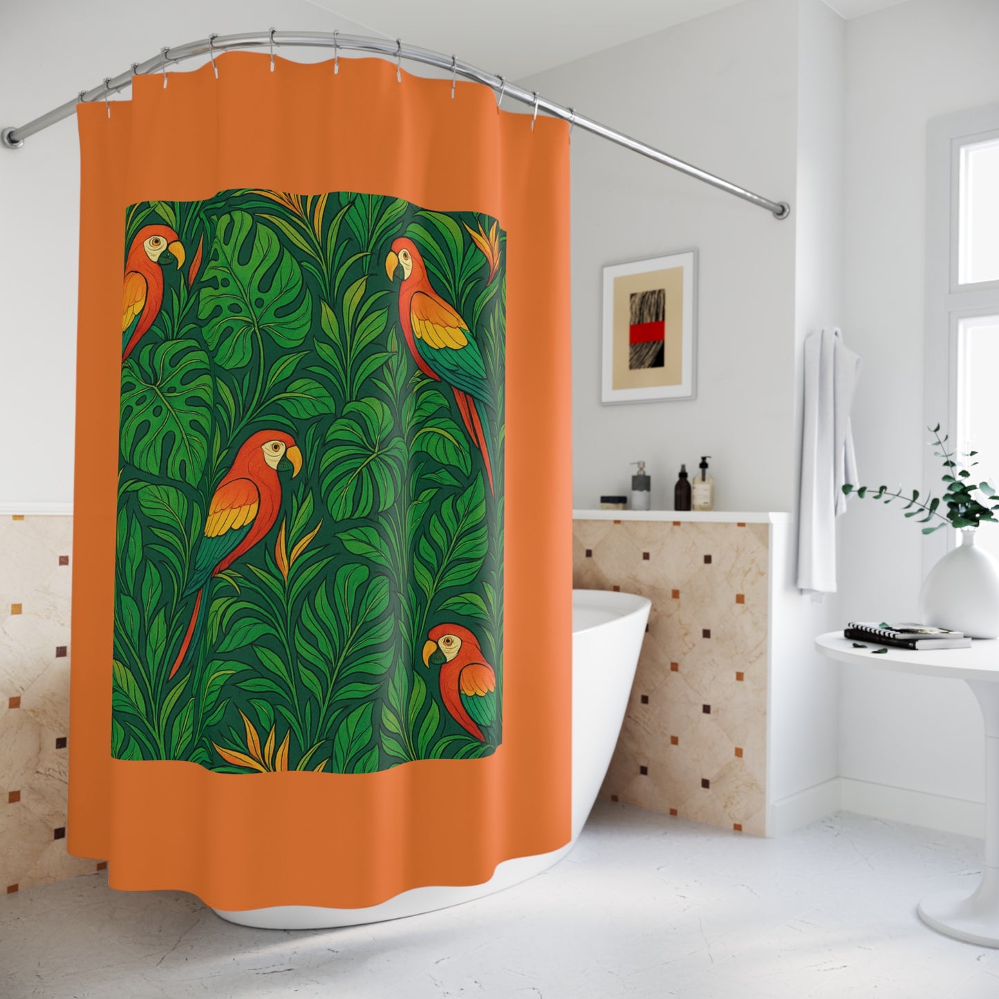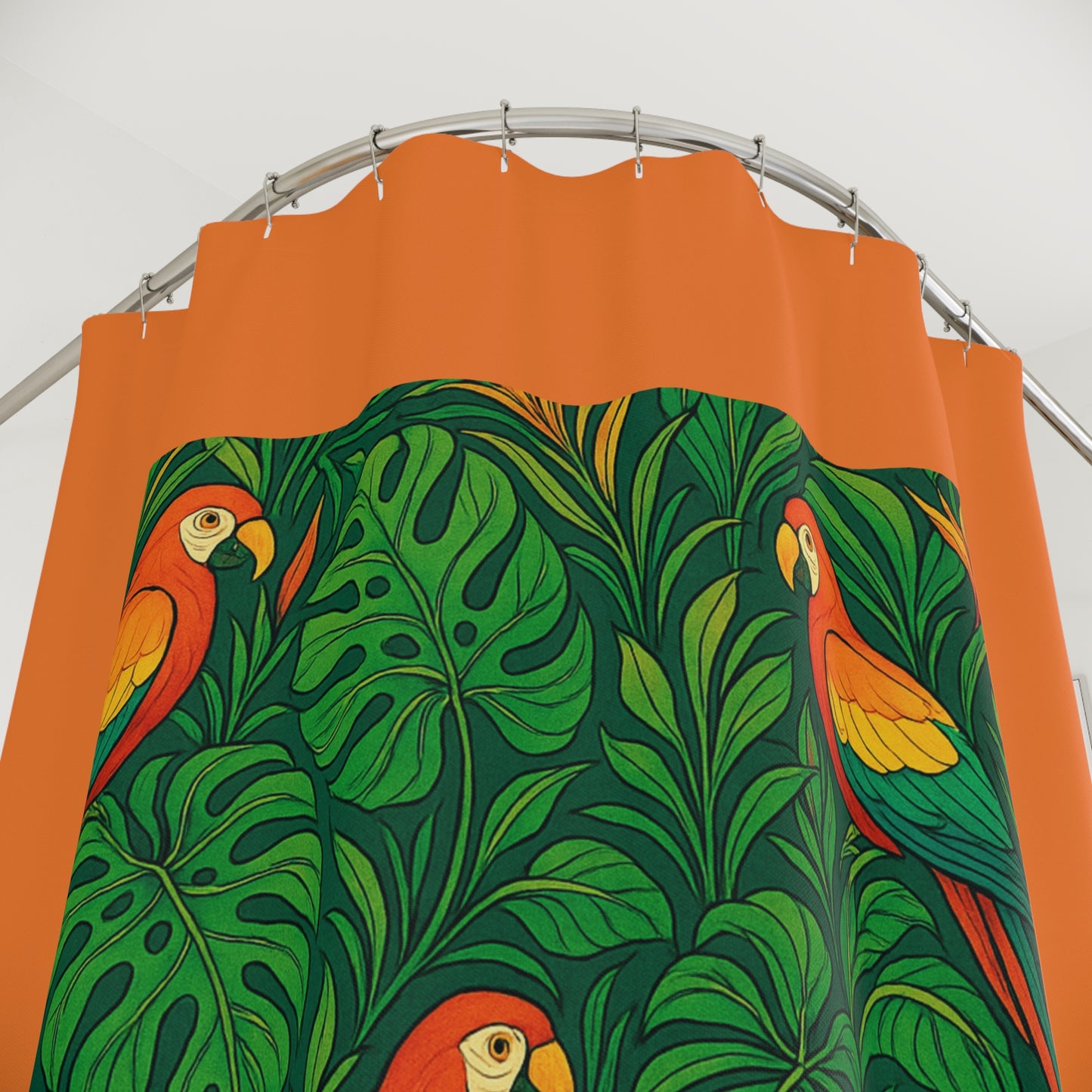 Transform your bathroom into a serene oasis with this vibrant shower curtain with a design of a parrot family in a lush rainforest. Made from 100% durable polyester, this unique design features a captivating blend of colors and patterns that will invigorate your space. Imagine stepping into a warm, relaxing shower surrounded by stylish artistry that reflects your personality. Perfect for adults looking to elevate their home decor, this shower curtain brings a touch of creativity and fun to everyday routines. It's ideal for housewarming gifts, celebrations, or simply as a cheerful addition to your own bathroom. Celebrate life’s moments, from seasonal gatherings to personal milestones, with this eye-catching piece.
