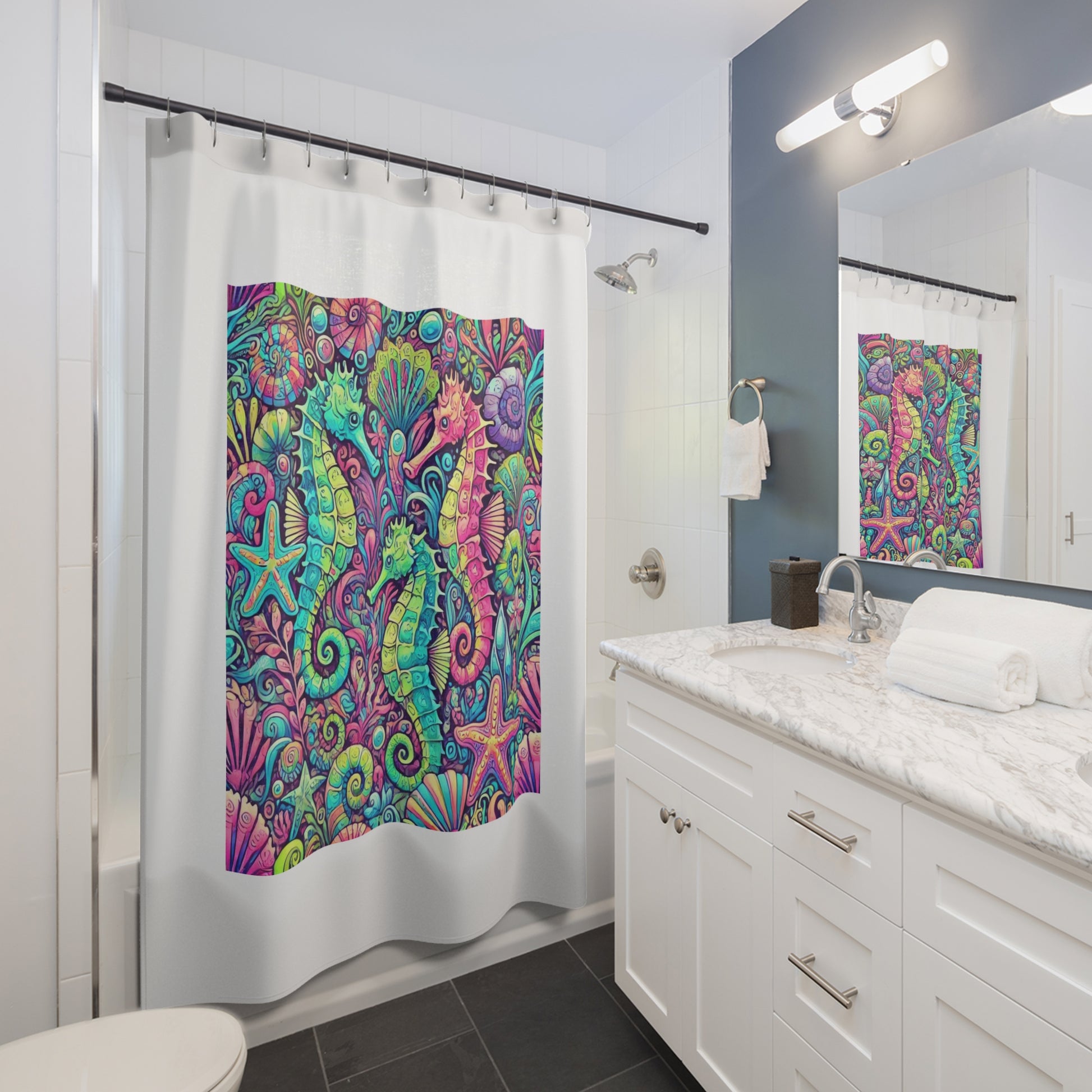 Transform your bathroom into a serene oasis with this vibrant shower curtain with a fun seahorse design. Made from 100% durable polyester, this unique design features a captivating blend of colors and patterns that will invigorate your space. Imagine stepping into a warm, relaxing shower surrounded by stylish artistry that reflects your personality. Perfect for adults looking to elevate their home decor, this shower curtain brings a touch of creativity and fun to everyday routines. It's ideal for housewarming gifts, celebrations, or simply as a cheerful addition to your own bathroom. Celebrate life’s moments, from seasonal gatherings to personal milestones, with this eye-catching piece.