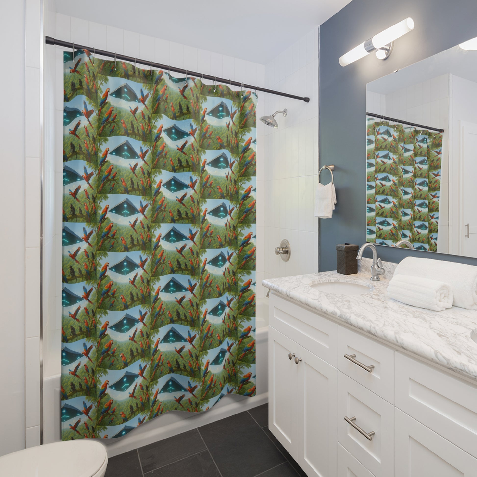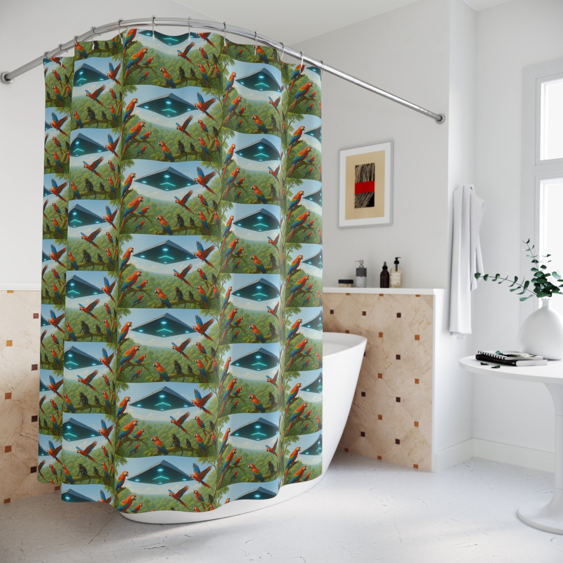 Transform your bathroom into a serene oasis with this vibrant shower curtain featuring UFO and Macaws! Made from 100% durable polyester, this unique design features a captivating blend of colors and patterns that will invigorate your space. Imagine stepping into a warm, relaxing shower surrounded by stylish artistry that reflects your personality. Perfect for adults looking to elevate their home decor, this shower curtain brings a touch of creativity and fun to everyday routines. It's ideal for housewarming gifts, celebrations, or simply as a cheerful addition to your own bathroom. Celebrate life’s moments, from seasonal gatherings to personal milestones, with this eye-catching piece.