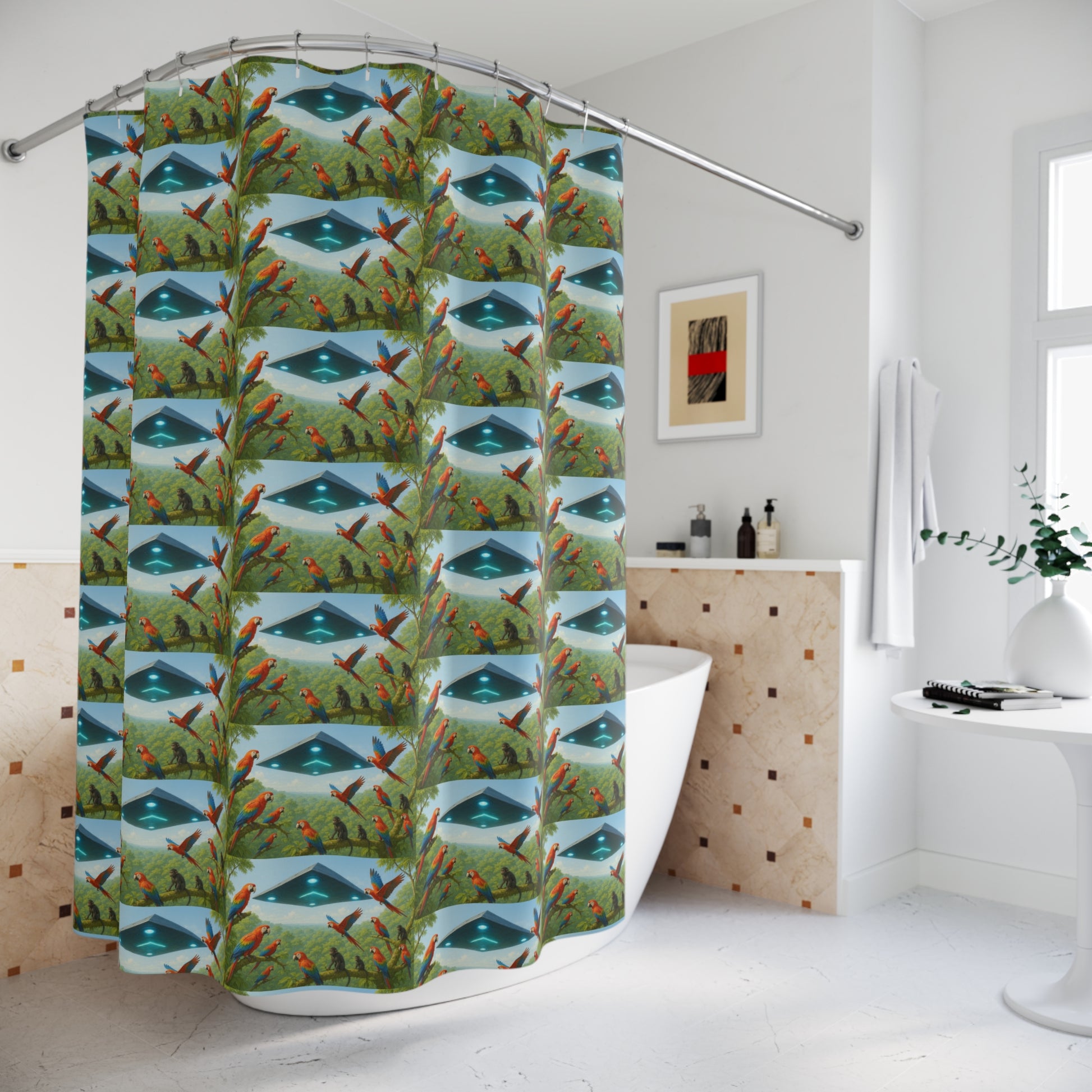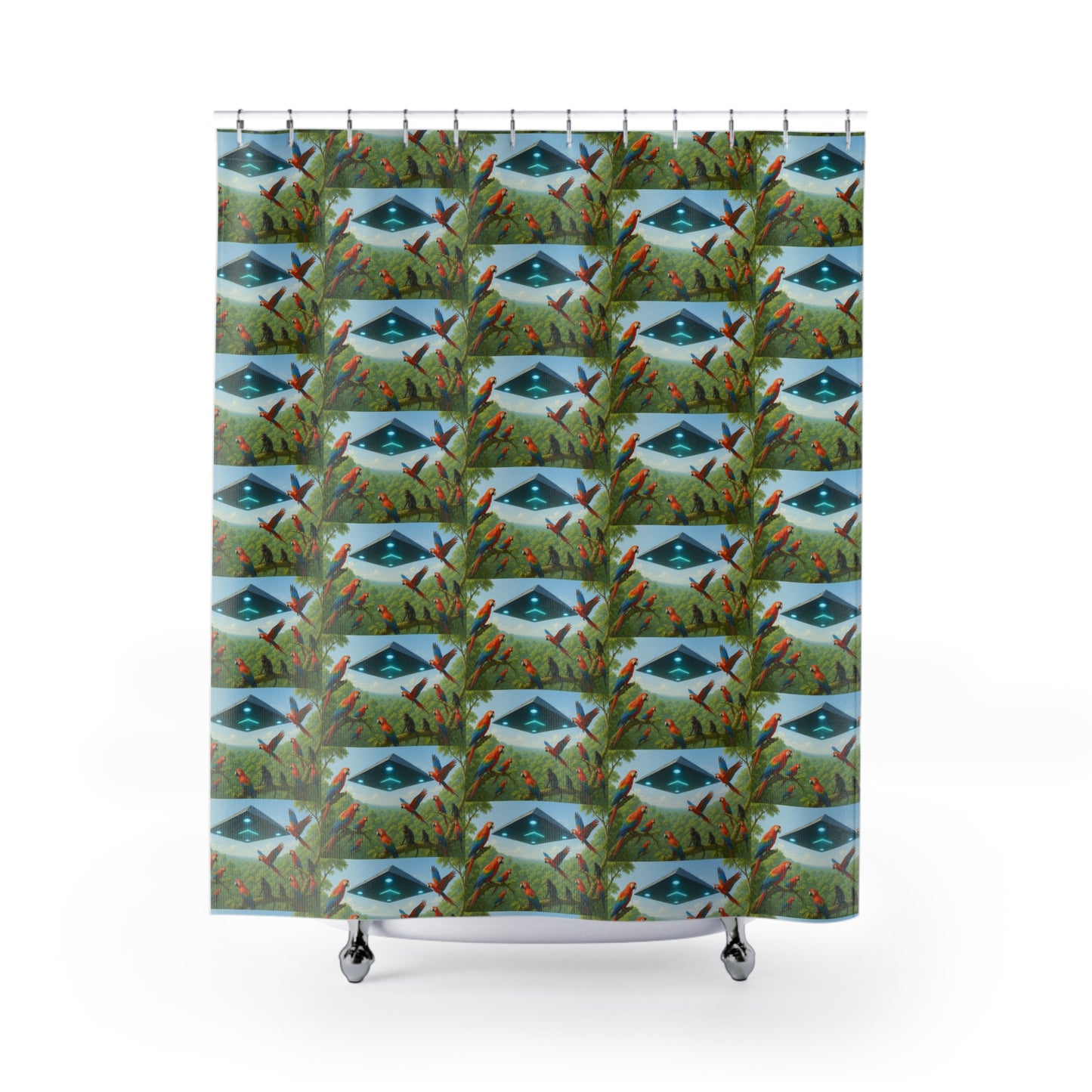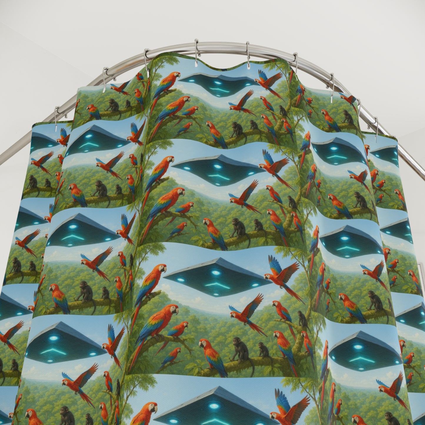 Tropical Shower Curtain - UFO and Macaws / Rainforest Decor