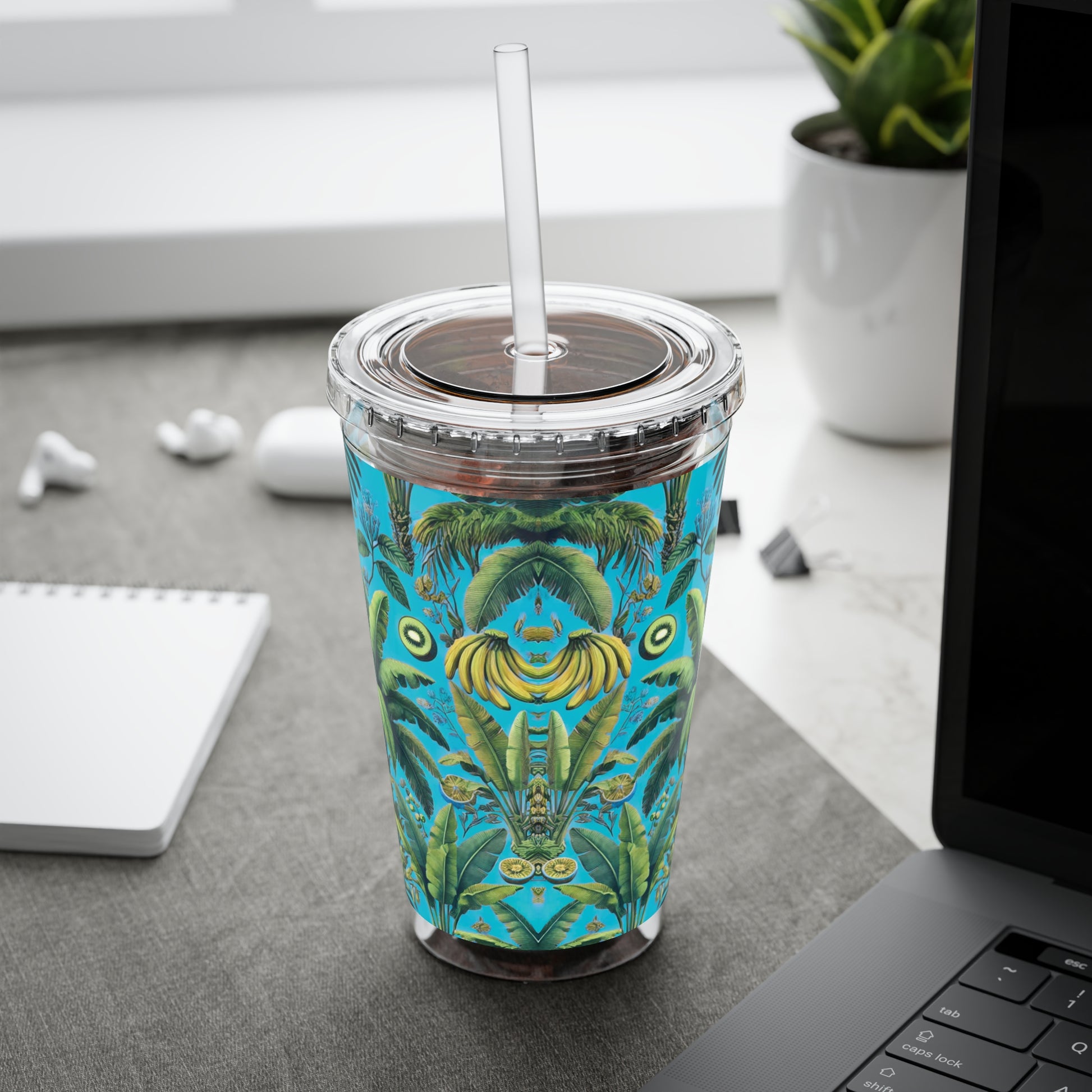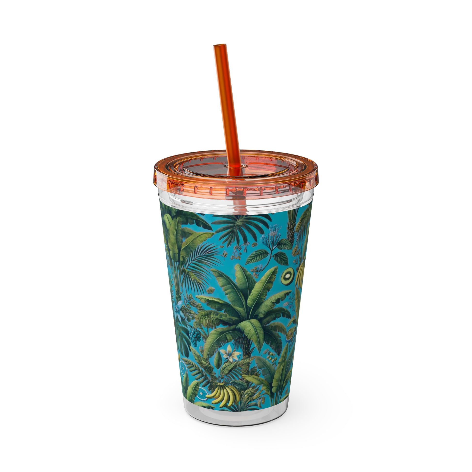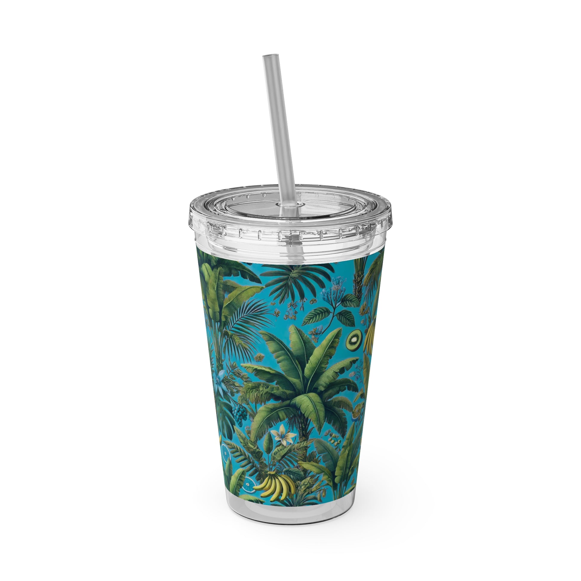Tropical Tumbler with Straw | 16oz Colorful Travel Cup / More Tropical Fruit, Aqua Blue