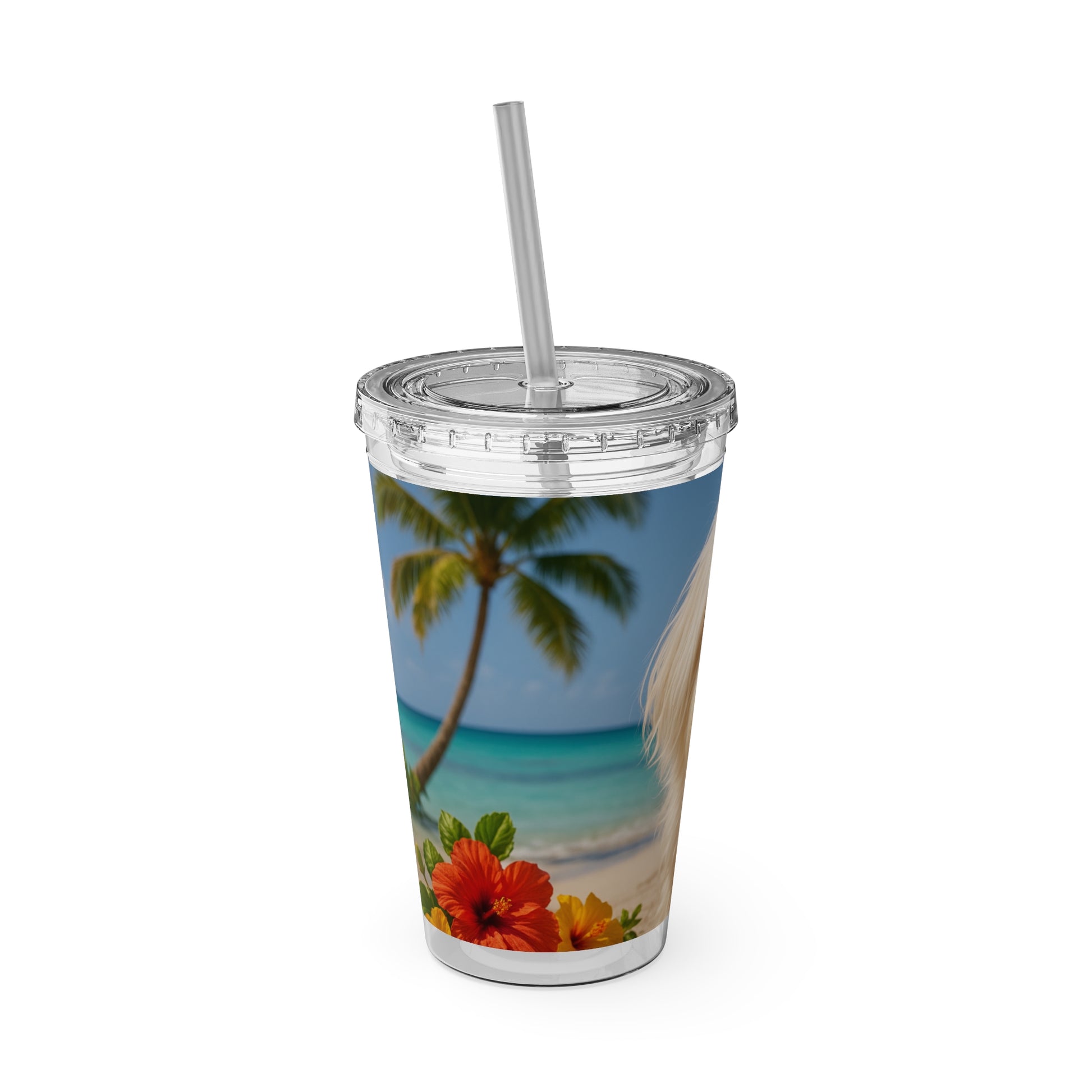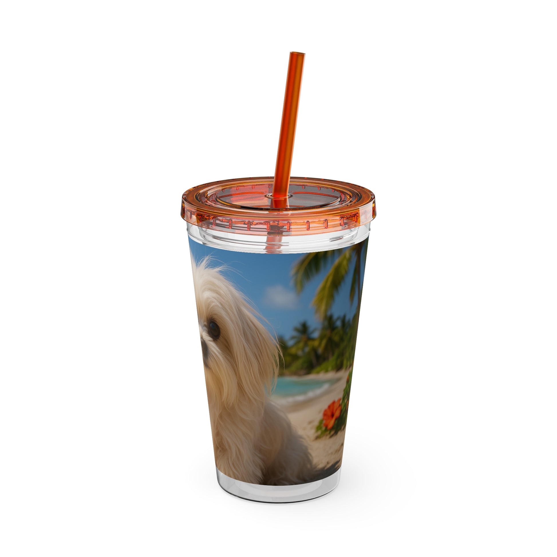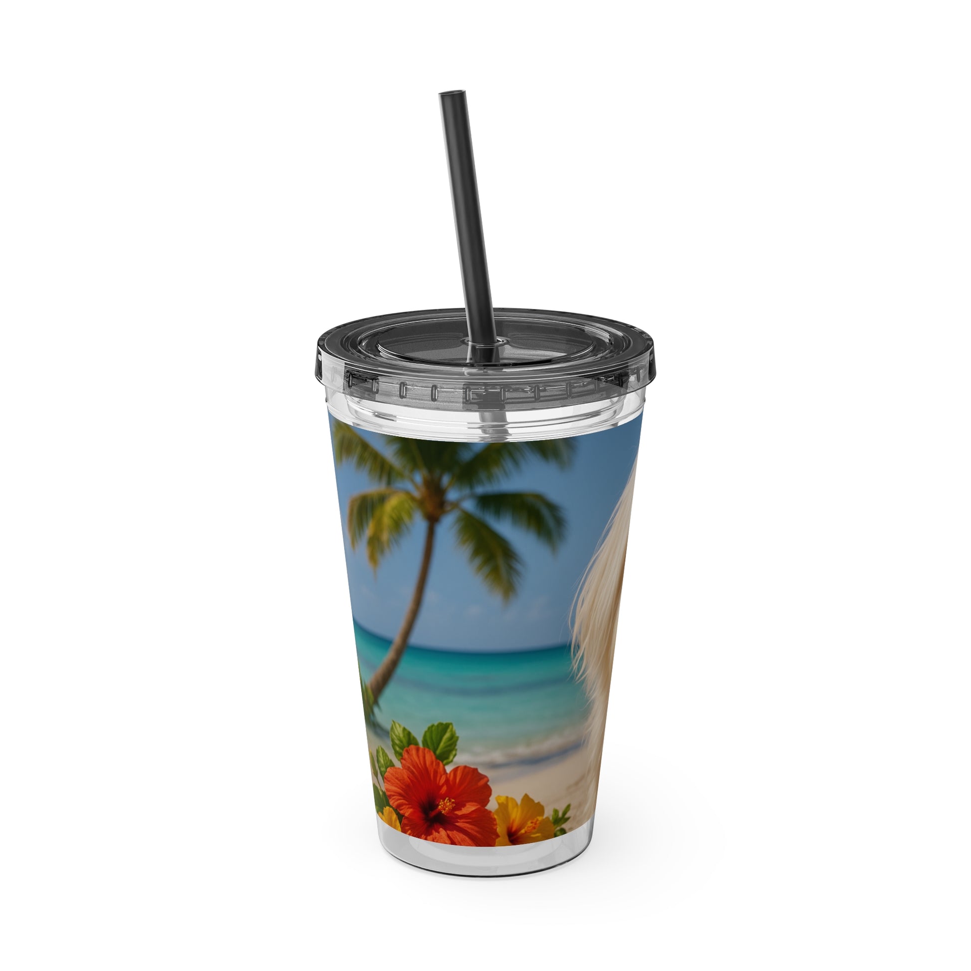 Tropical Tumbler with Straw | 16oz Colorful Travel Cup / Puppy Ariel at the Beach