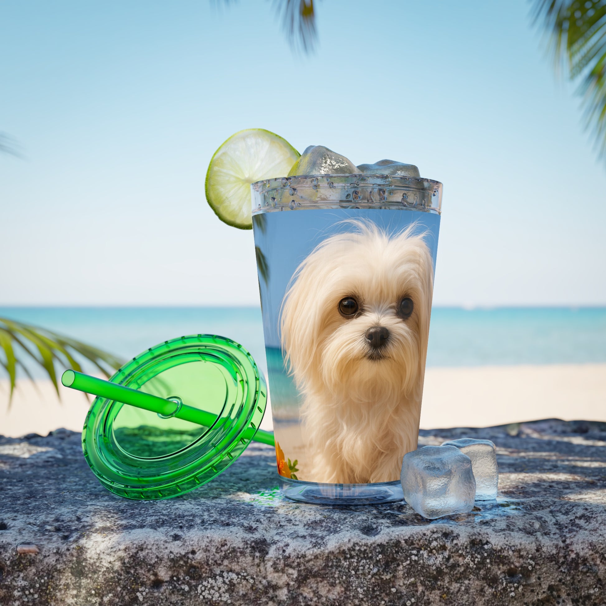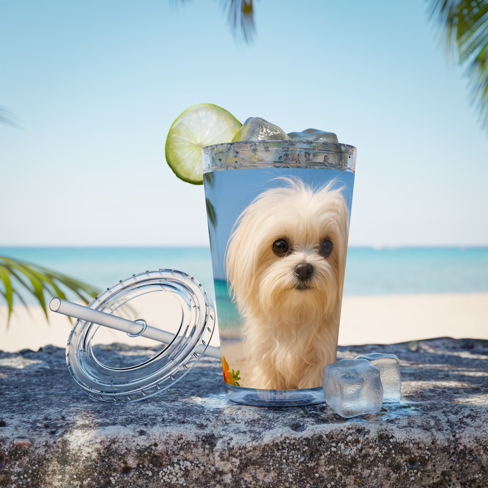 Brighten up your hydration game with our vibrant 16oz tumbler! This eye-catching tropical tumbler is BPA free, and features a stunning design that radiates energy and joy, making every sip a refreshing experience. Look at adorable puppy Ariel, the Maltese/Shih Tzu, enjoying a beach day! Perfect for anyone who loves to express their personality, this tumbler is ideal for students, professionals, or anyone on-the-go. Its double wall insulation keeps drinks cold or hot, making it a perfect companion for all seasons. Whether you're at a beach party, picnicking with friends, or enjoying a cozy night in, this tumbler adds a splash of fun to any occasion. It makes a delightful gift for birthdays, holidays, or just because!
