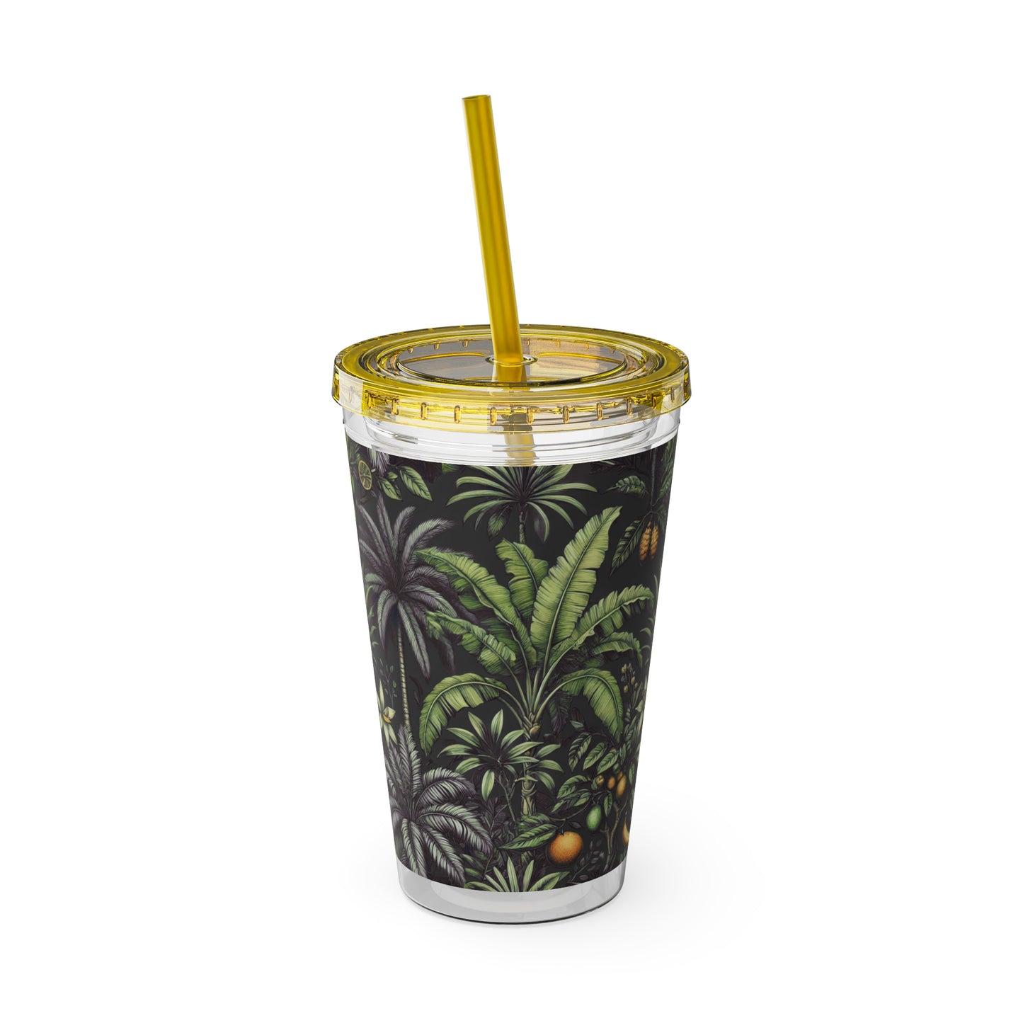 Tropical Tumbler with Straw | 16oz Colorful Travel Cup / Tropical Fruit, Black