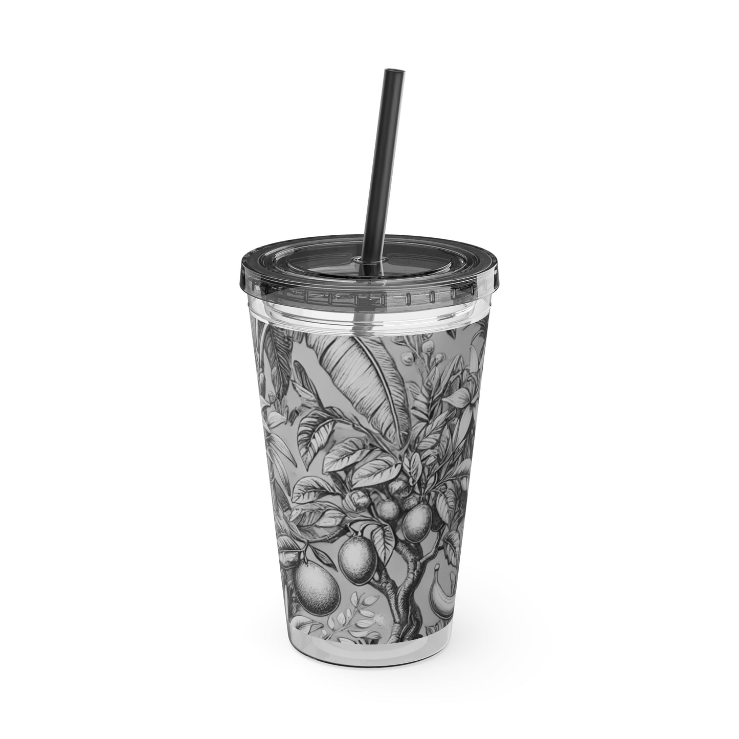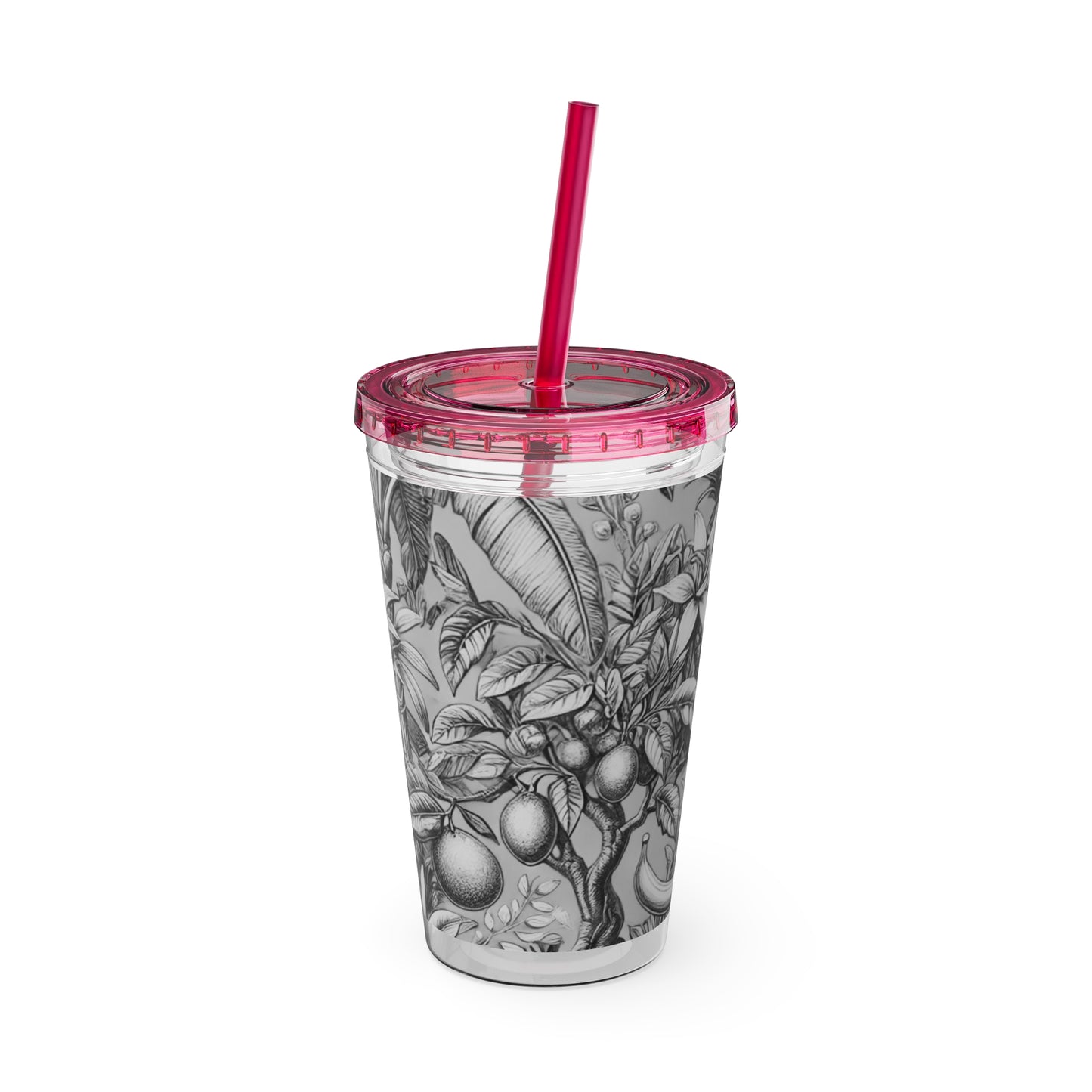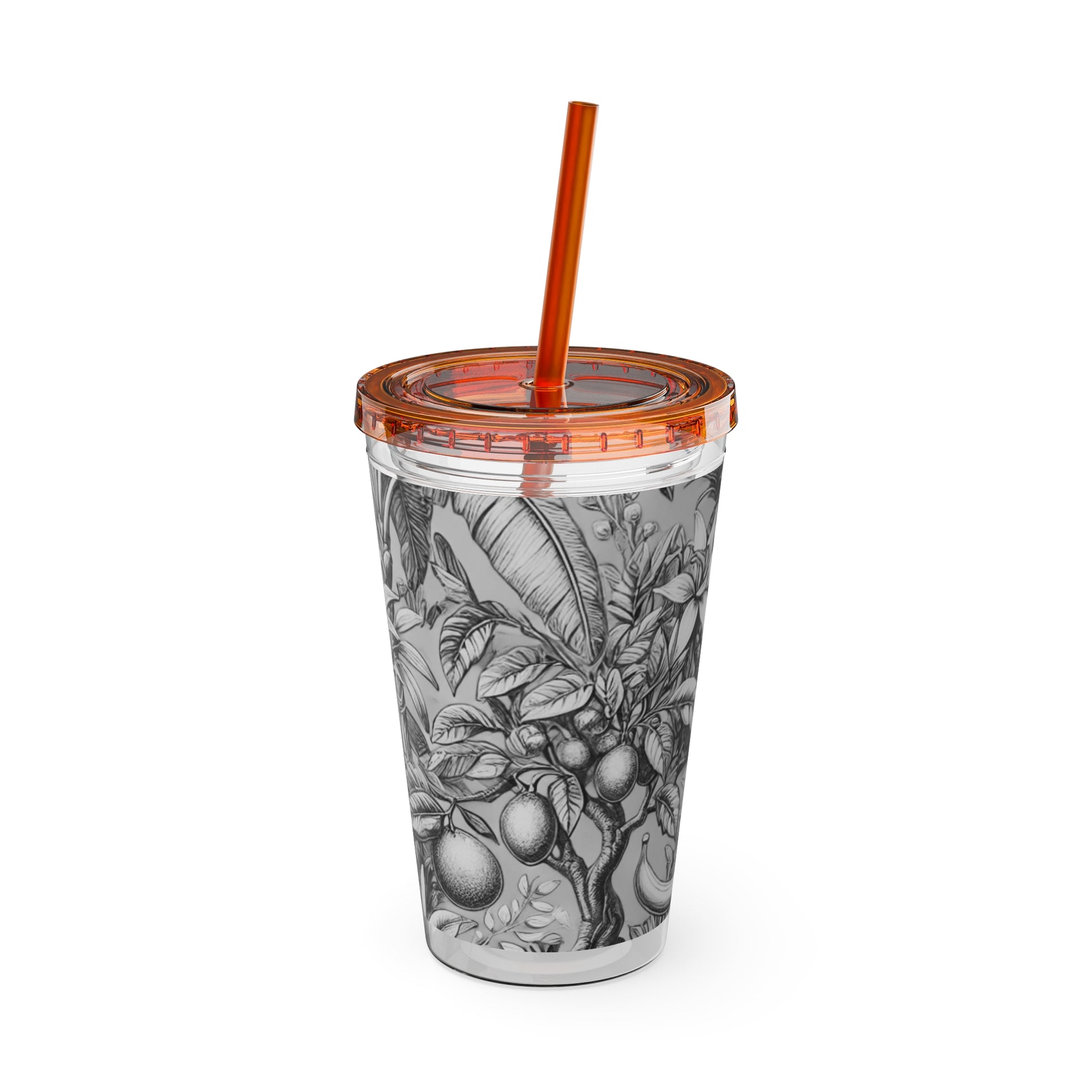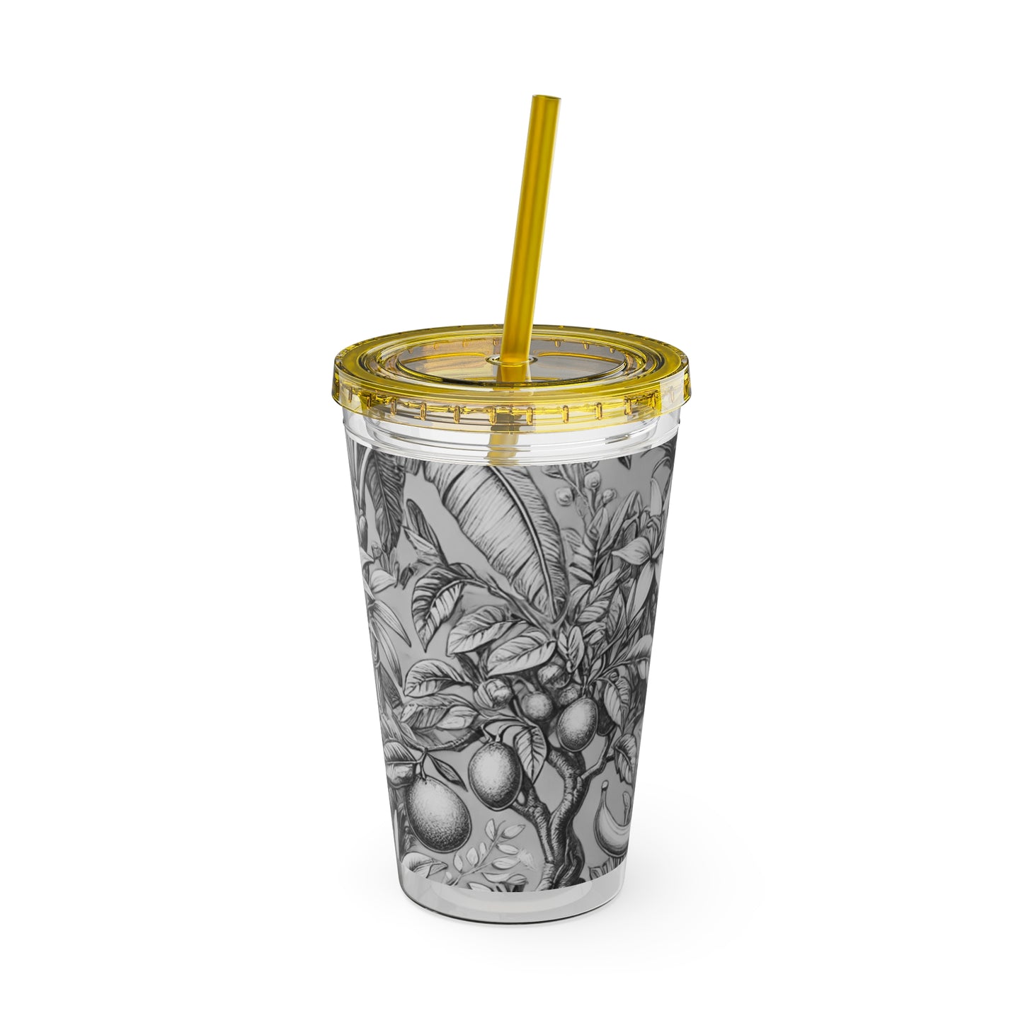 Tropical Tumbler with Straw | 16oz Colorful Travel Cup / Tropical Fruit, Newspaper
