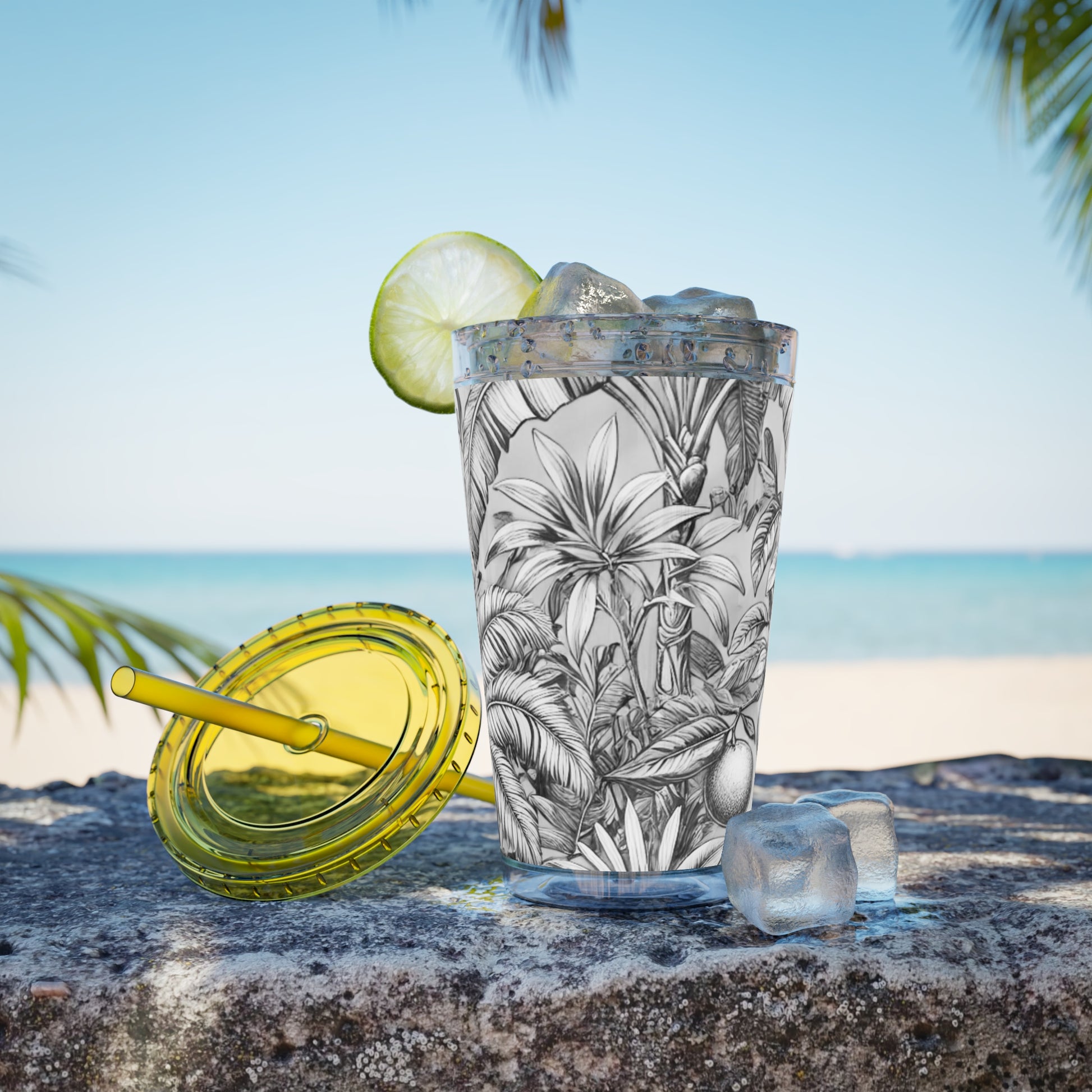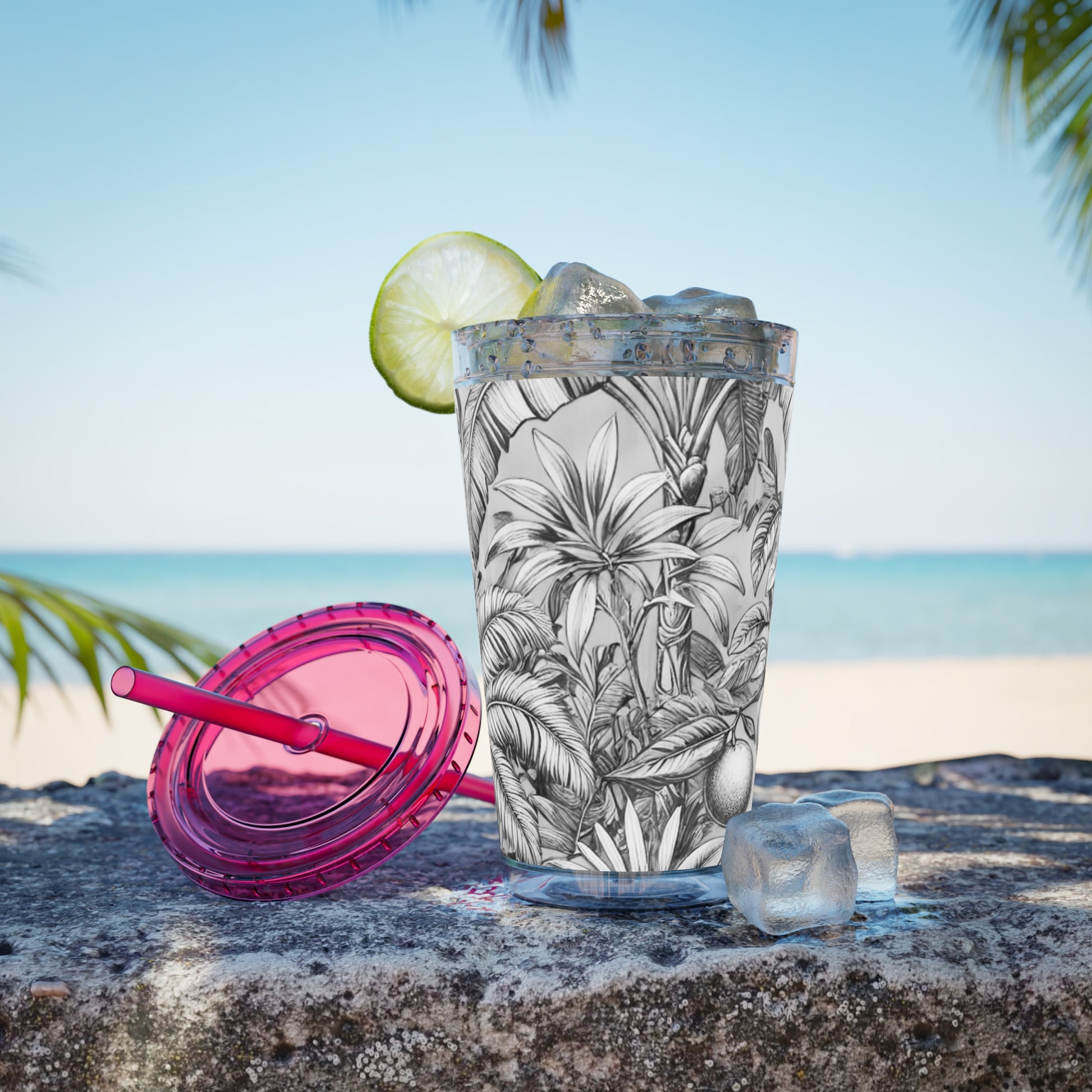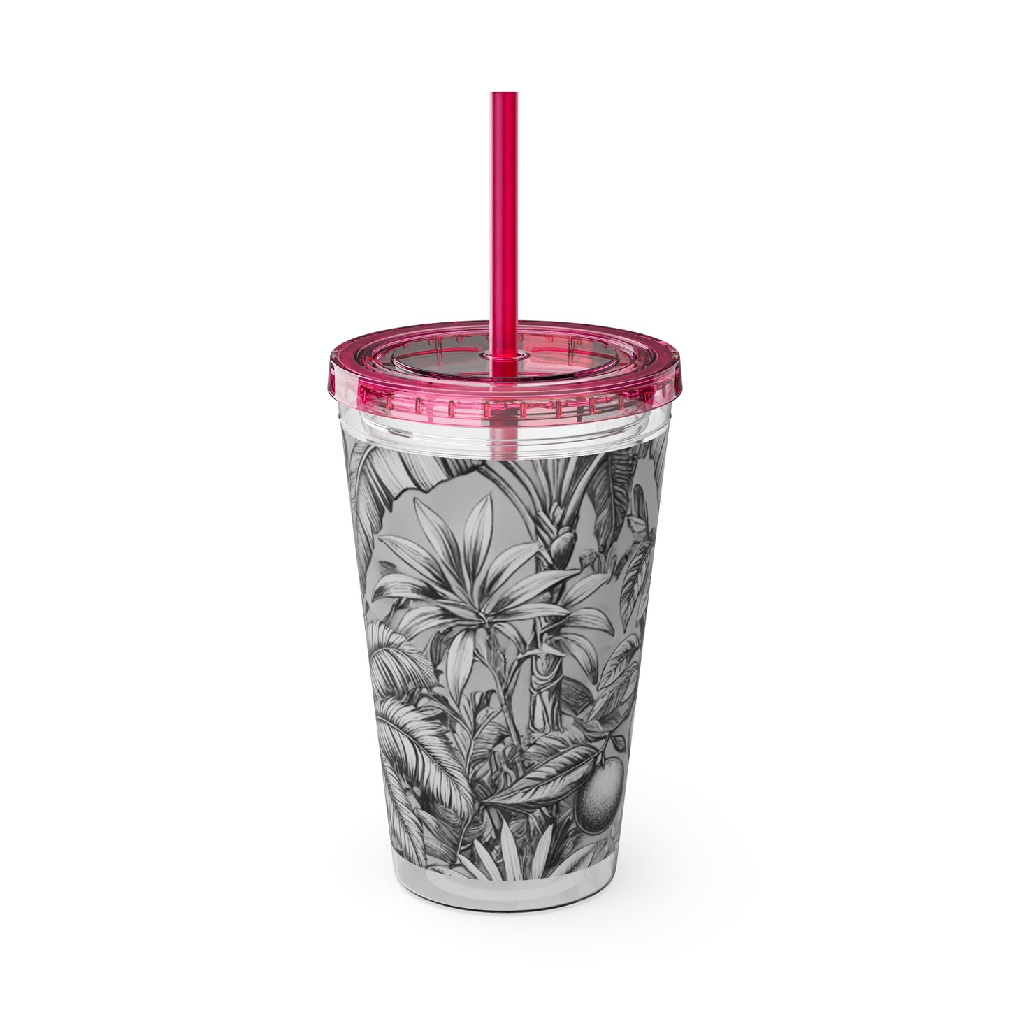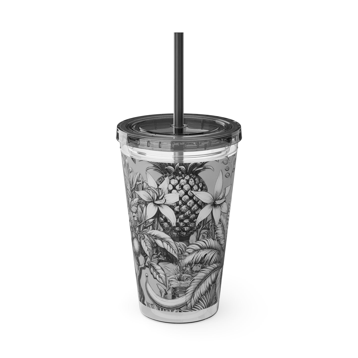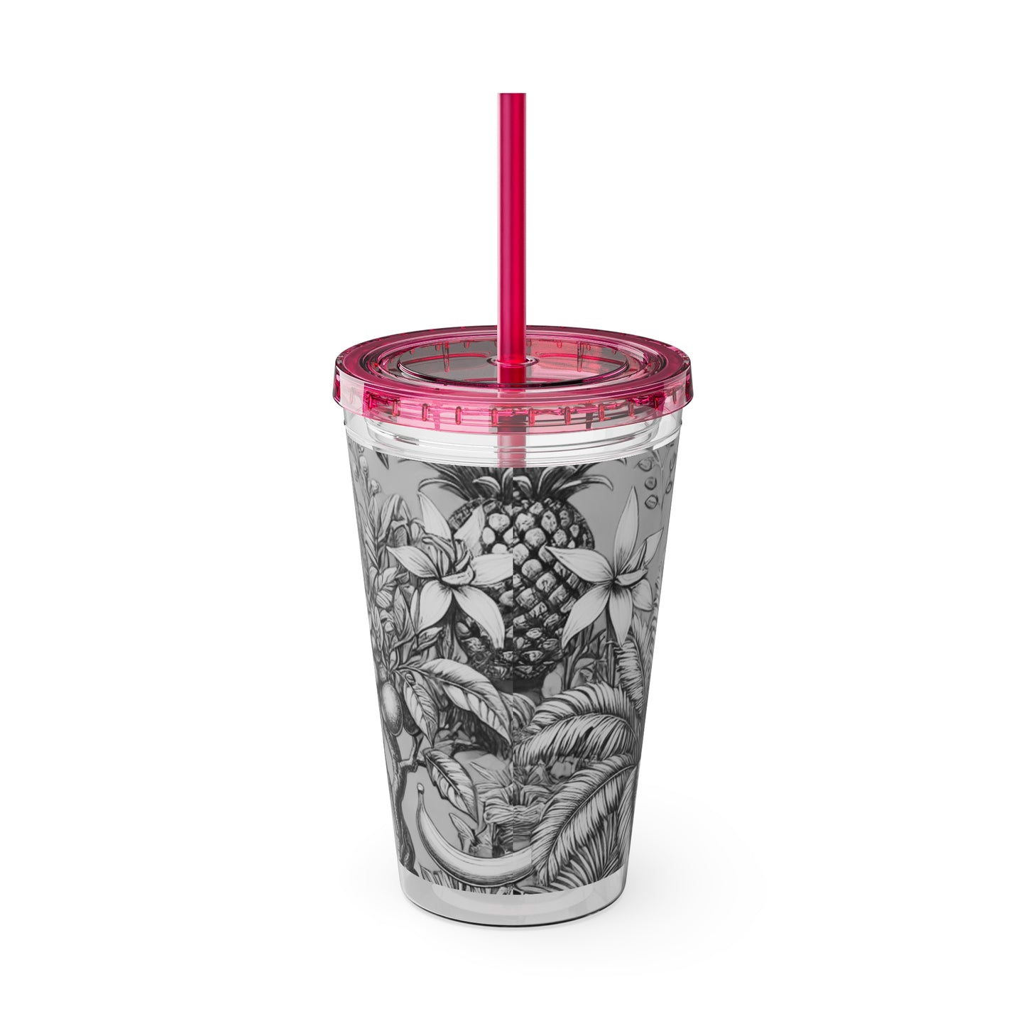 Tropical Tumbler with Straw | 16oz Colorful Travel Cup / Tropical Fruit, Newspaper
