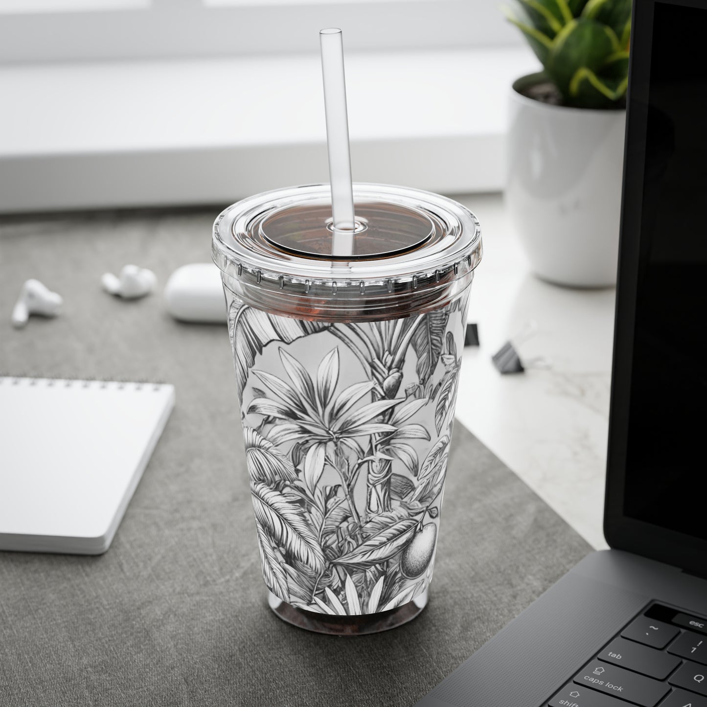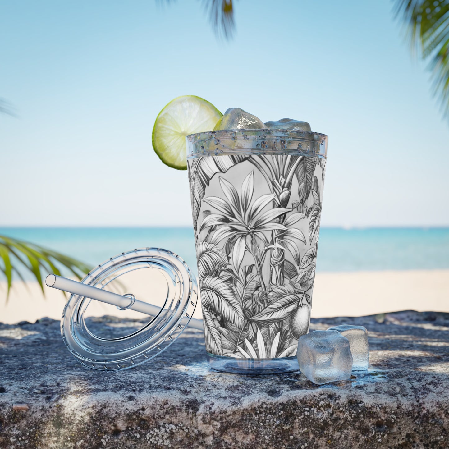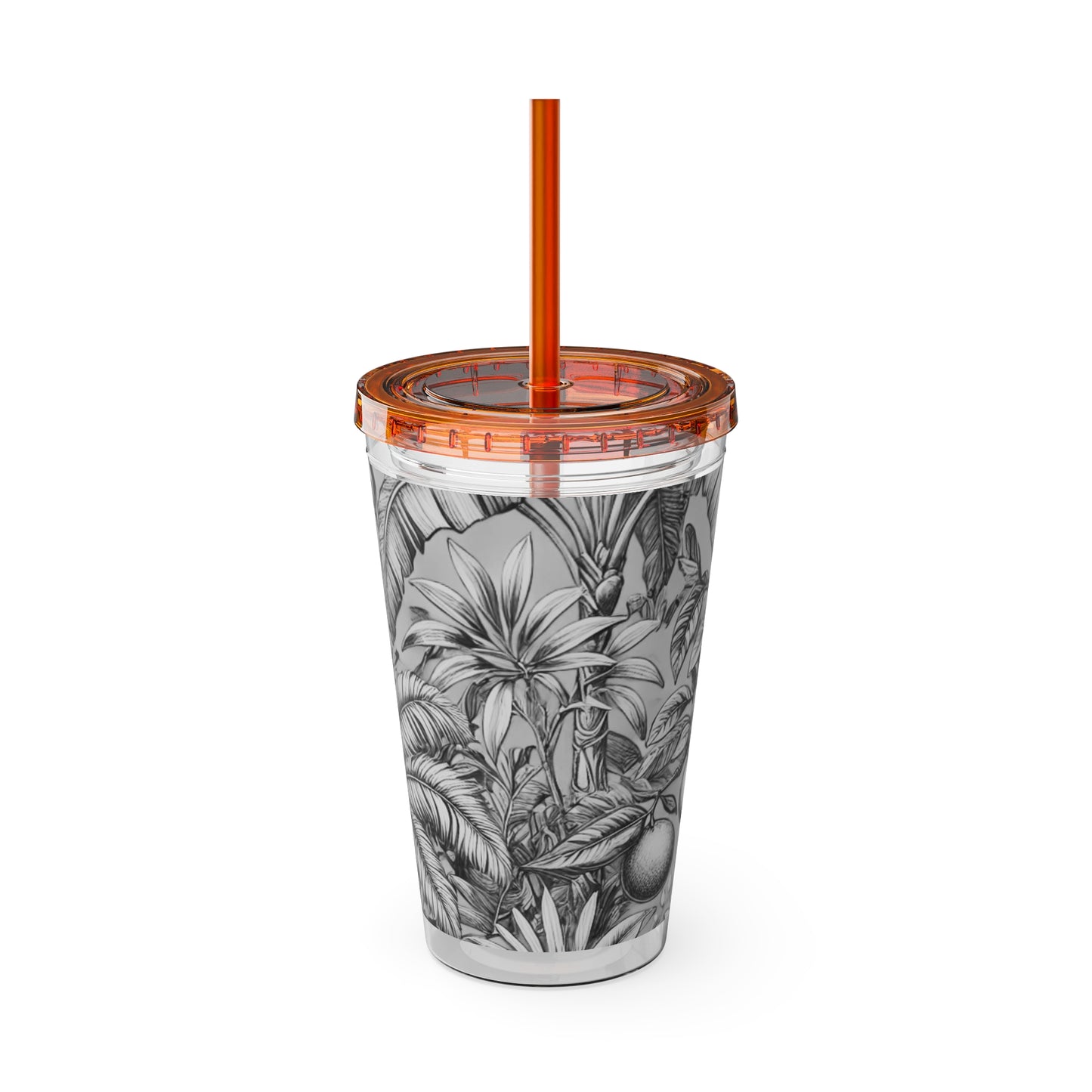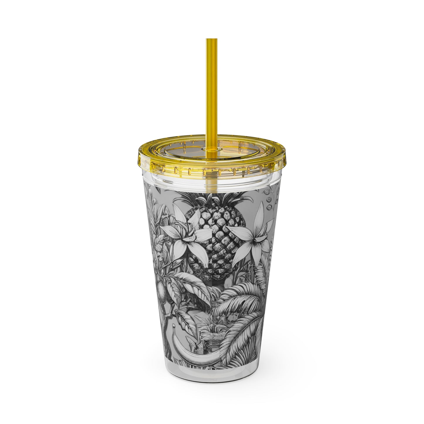 Tropical Tumbler with Straw | 16oz Colorful Travel Cup / Tropical Fruit, Newspaper