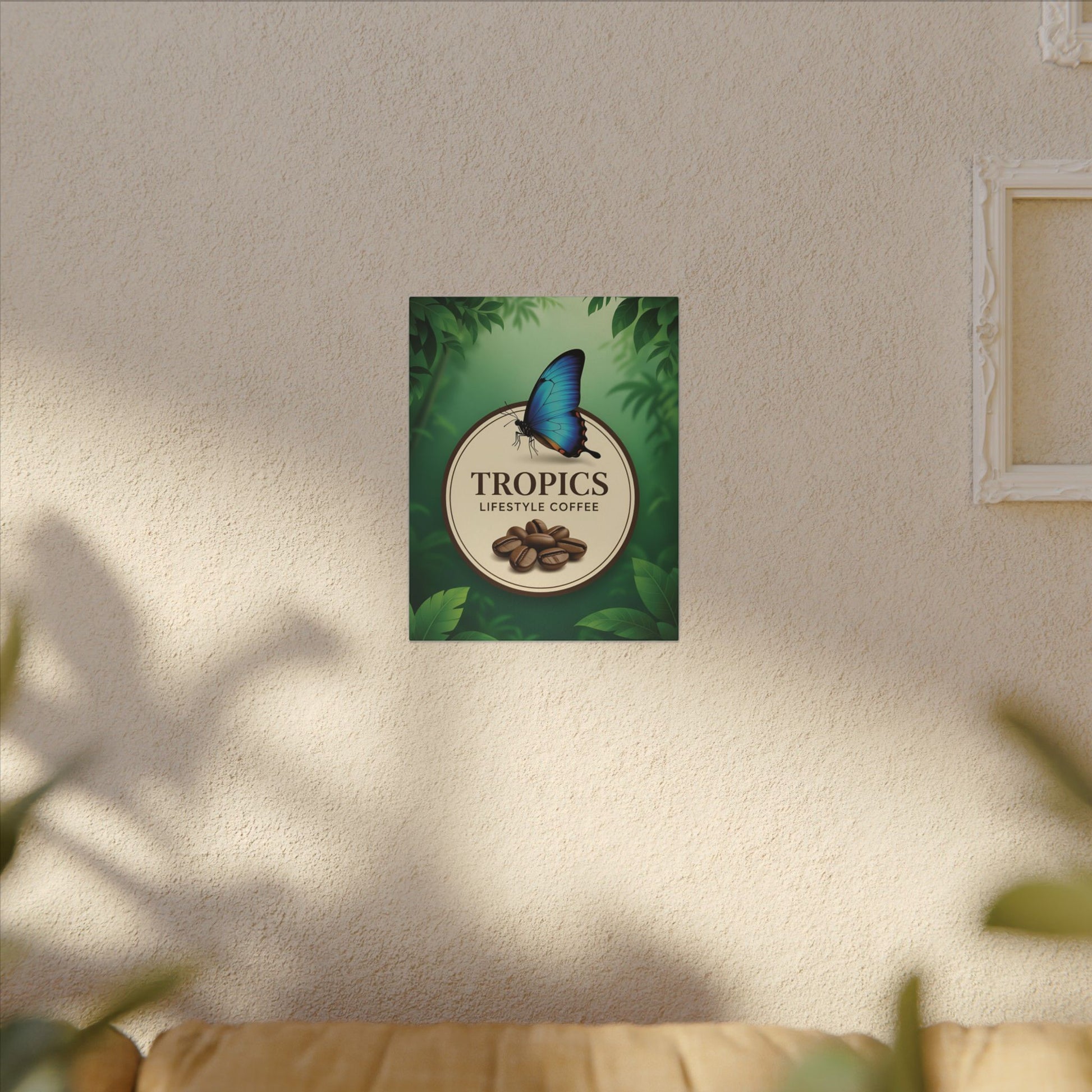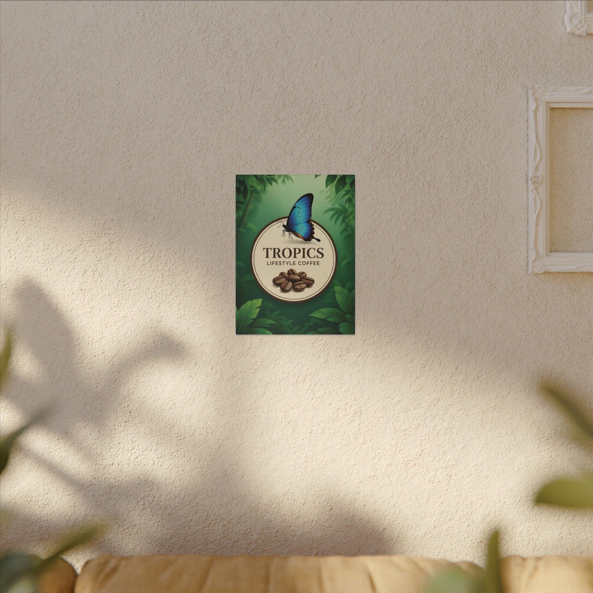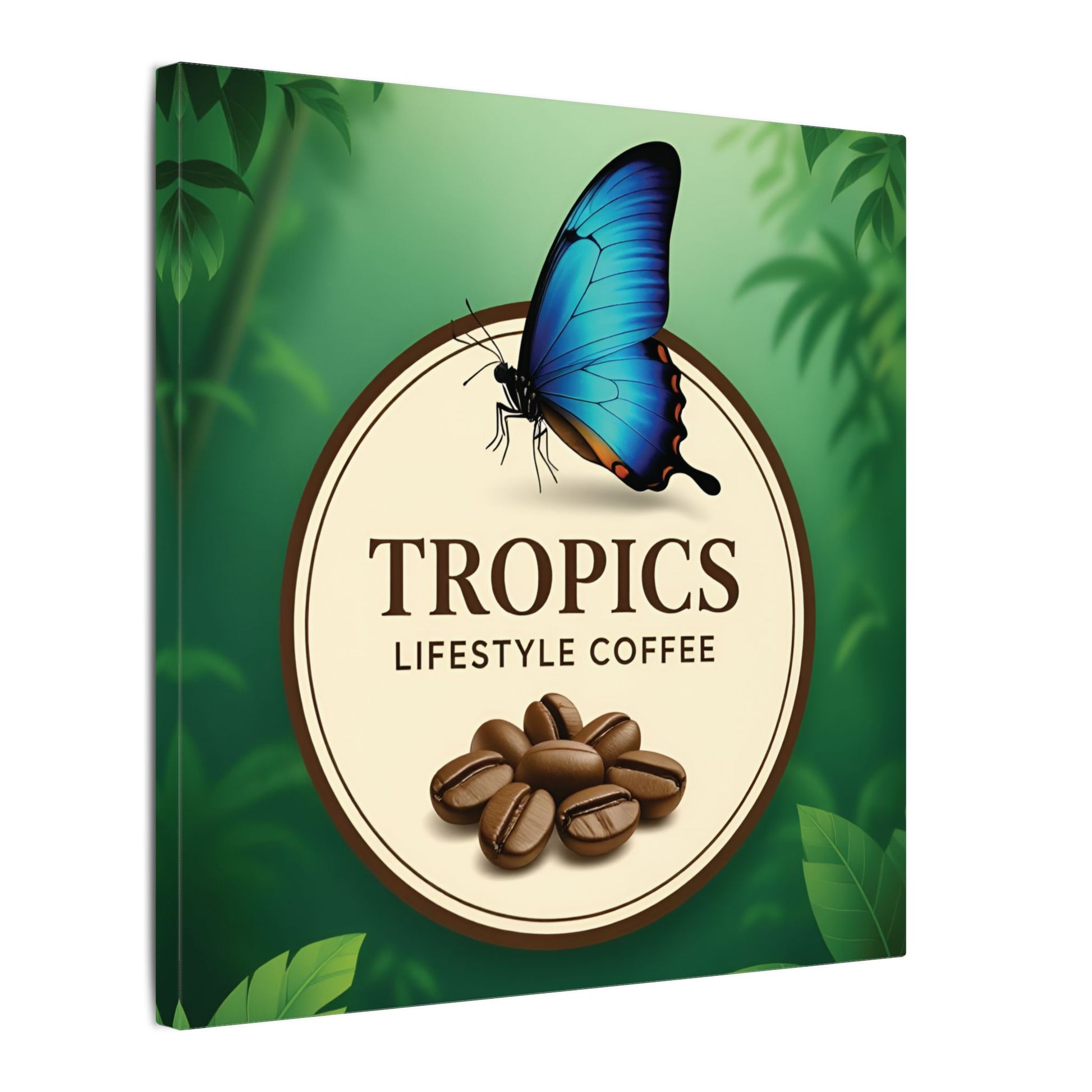 Bring a slice of tropical calm into your kitchen or café with this matte stretched canvas. Lush green foliage and a bright blue butterfly frame a warm emblem of coffee beans — a quiet nod to slow mornings and the ritual of brewing. The subtle texture of the matte canvas softens light and keeps colors rich without glare, making it feel like a small window into a humid, verdant corner where aroma and comfort mingle. Hang it above a coffee station, lean it on a shelf, or place it where friends gather; the image invites lingering conversation and the kind of slow savoring that turns regular mornings into moments.