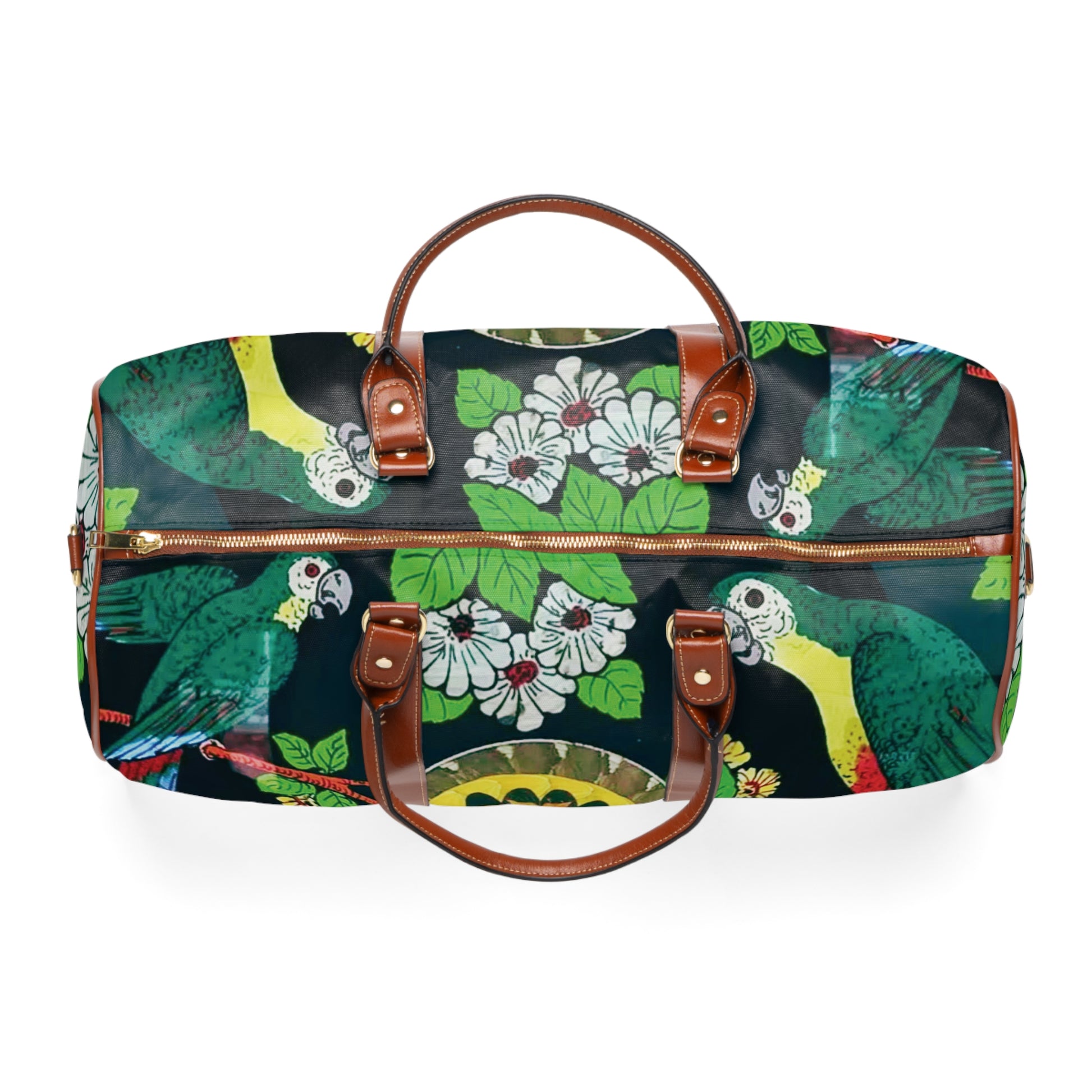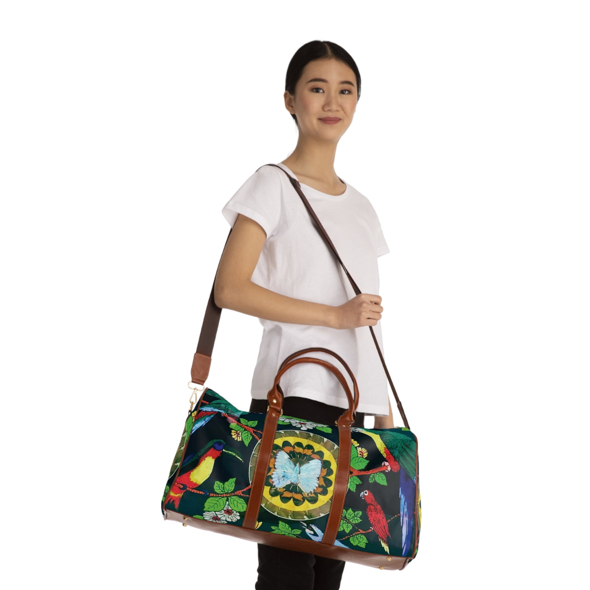 Introducing our stylish Waterproof Travel Bag, designed for adventurers and trendsetters alike. This eye-catching tropical bag features vibrant colors that bring a fun vibe to any journey, created with our design of parrots and butterflies made from photo of real butterfly wing art from Brazil. Whether you're heading to the gym, a weekend getaway, or an exciting travel expedition, this bag fits seamlessly into your active lifestyle. Ideal for anyone who loves exploring new places or just enjoys a touch of flair in their everyday routine, it's perfect for vacations, day trips, or as a thoughtful gift for the wanderlust in your life.